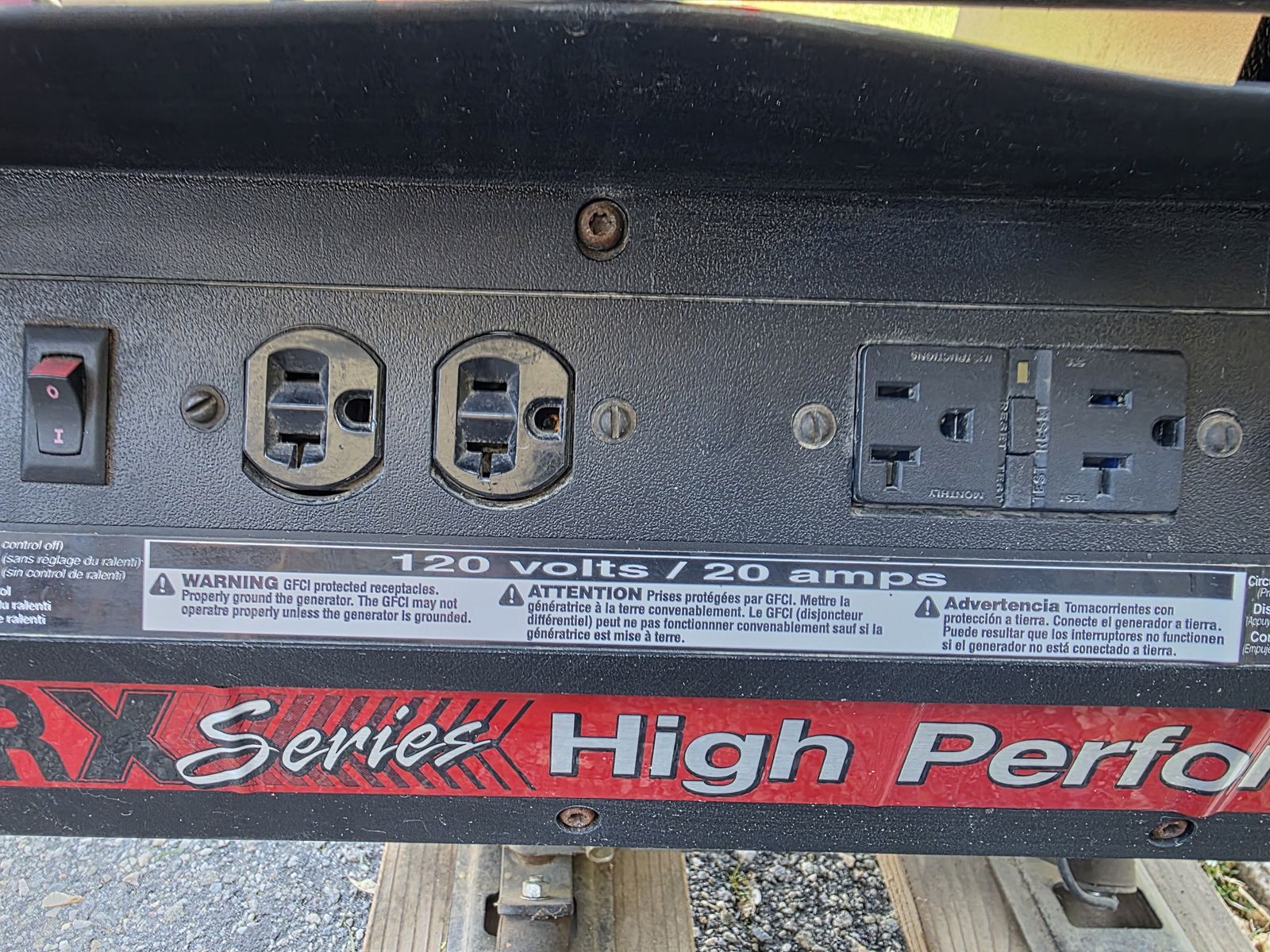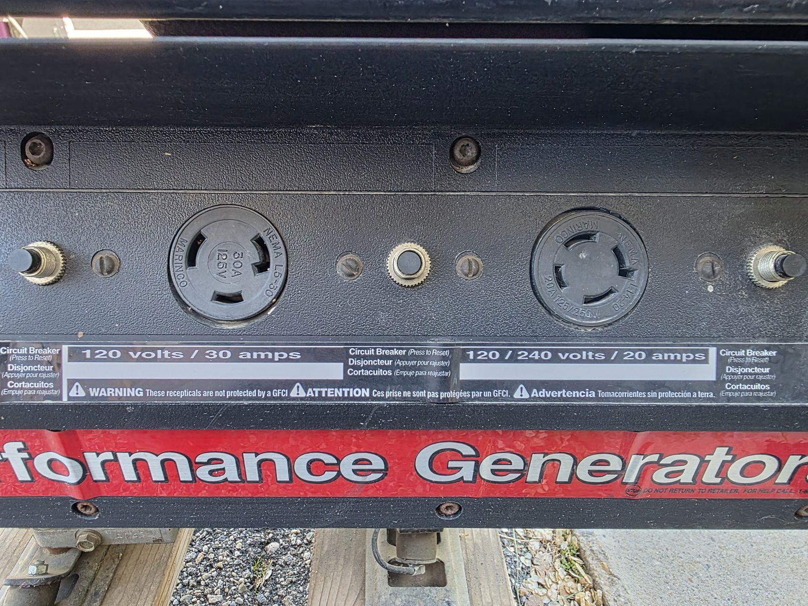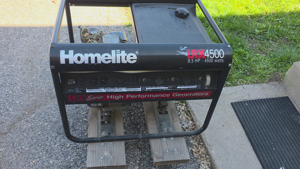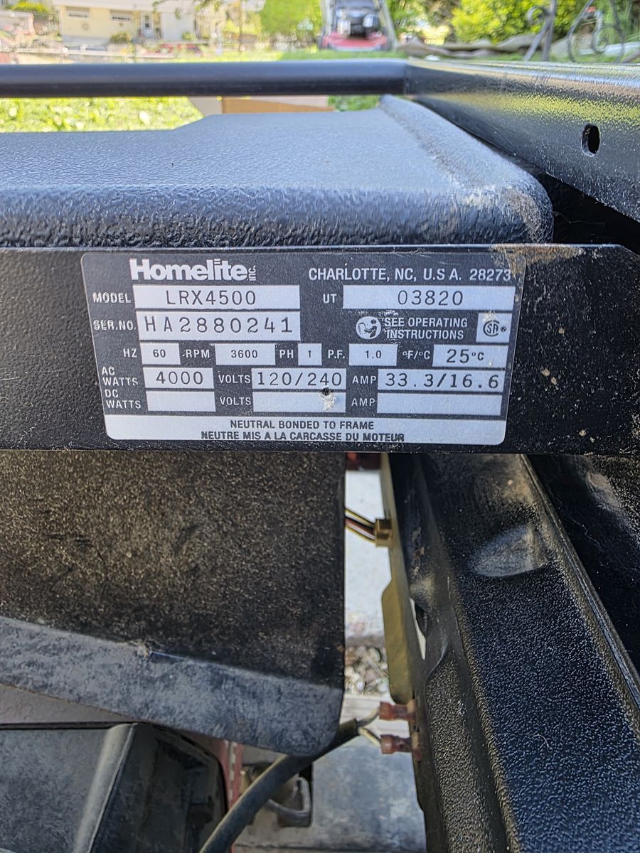 VenmoHomelite LRX 4500 4500 watt generator 120v 30 amp 240v 20 amp. Less than 10 run time hours Fires right up. has auto idle switch to save fuel on low loads.