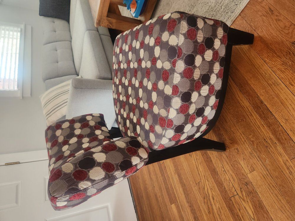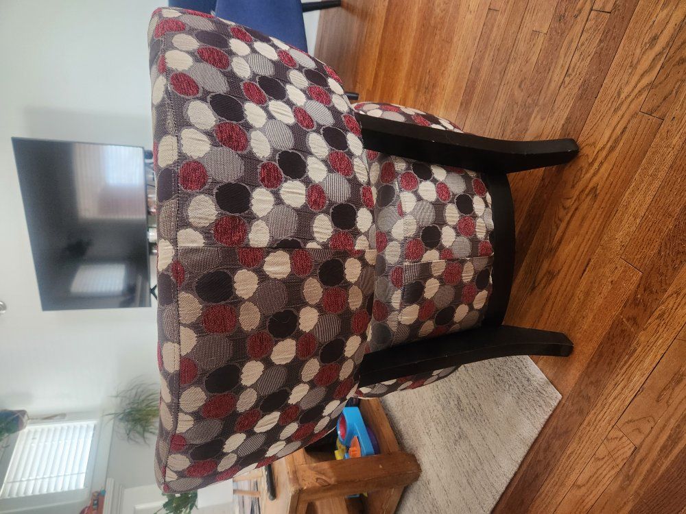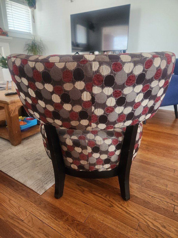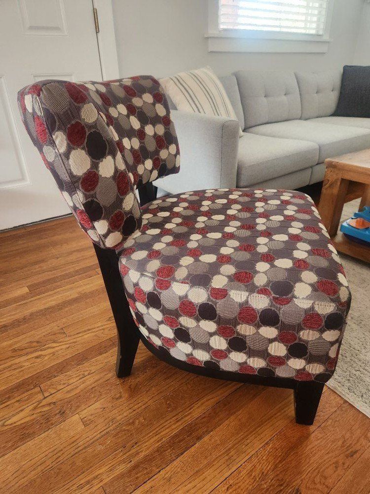 VenmoFun accent chair with deep red, brown, and tan polka dots. Wood legs have some slight ware on them but overall in great condition. 25 inches wide and 31 inches tall.