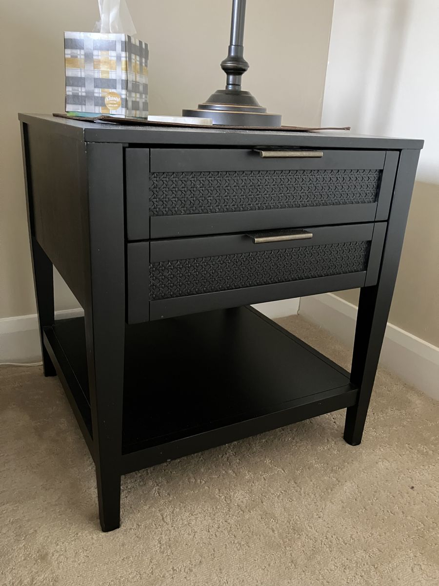 Black Studio McGee for Target Nightstand. Wicker detailing on two front drawers with brass pulls.