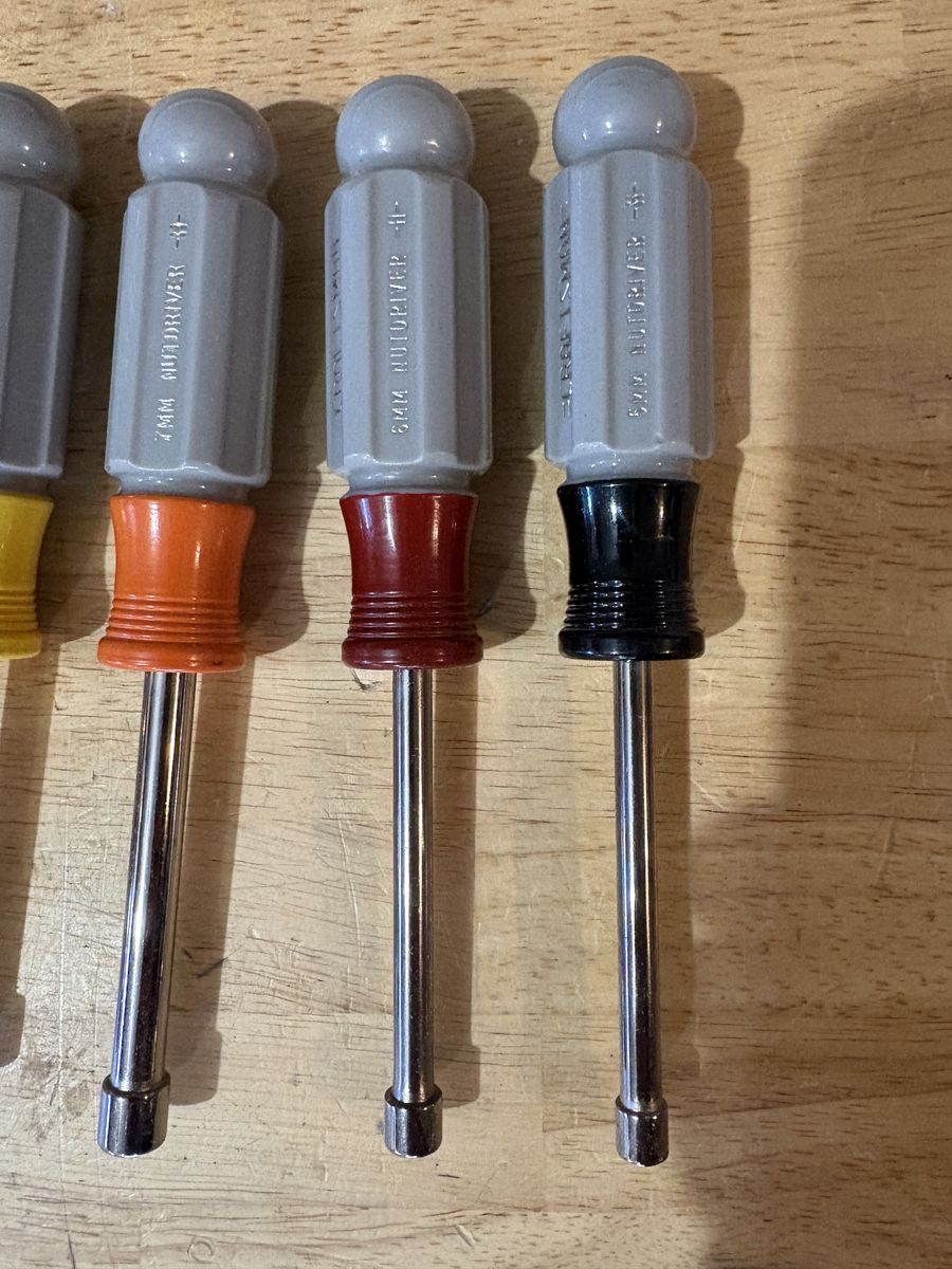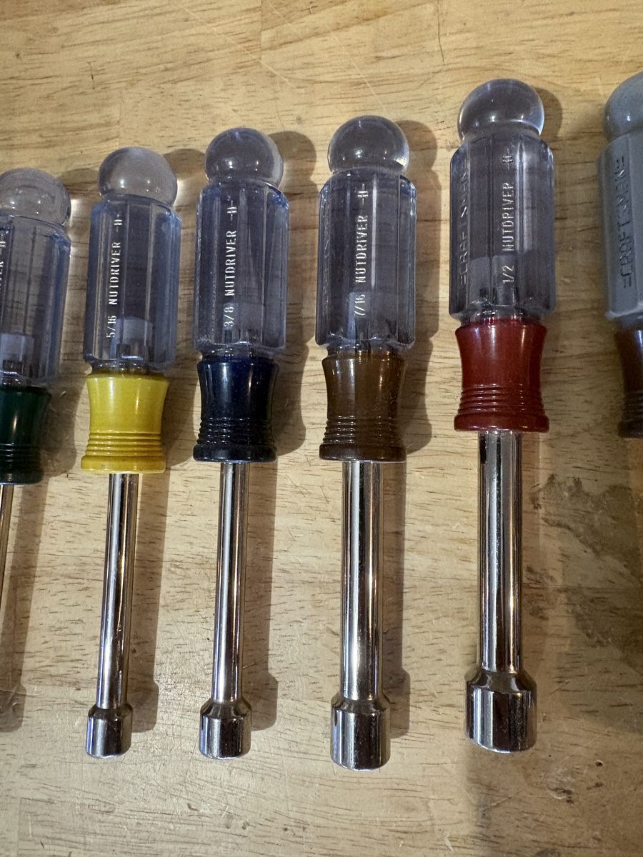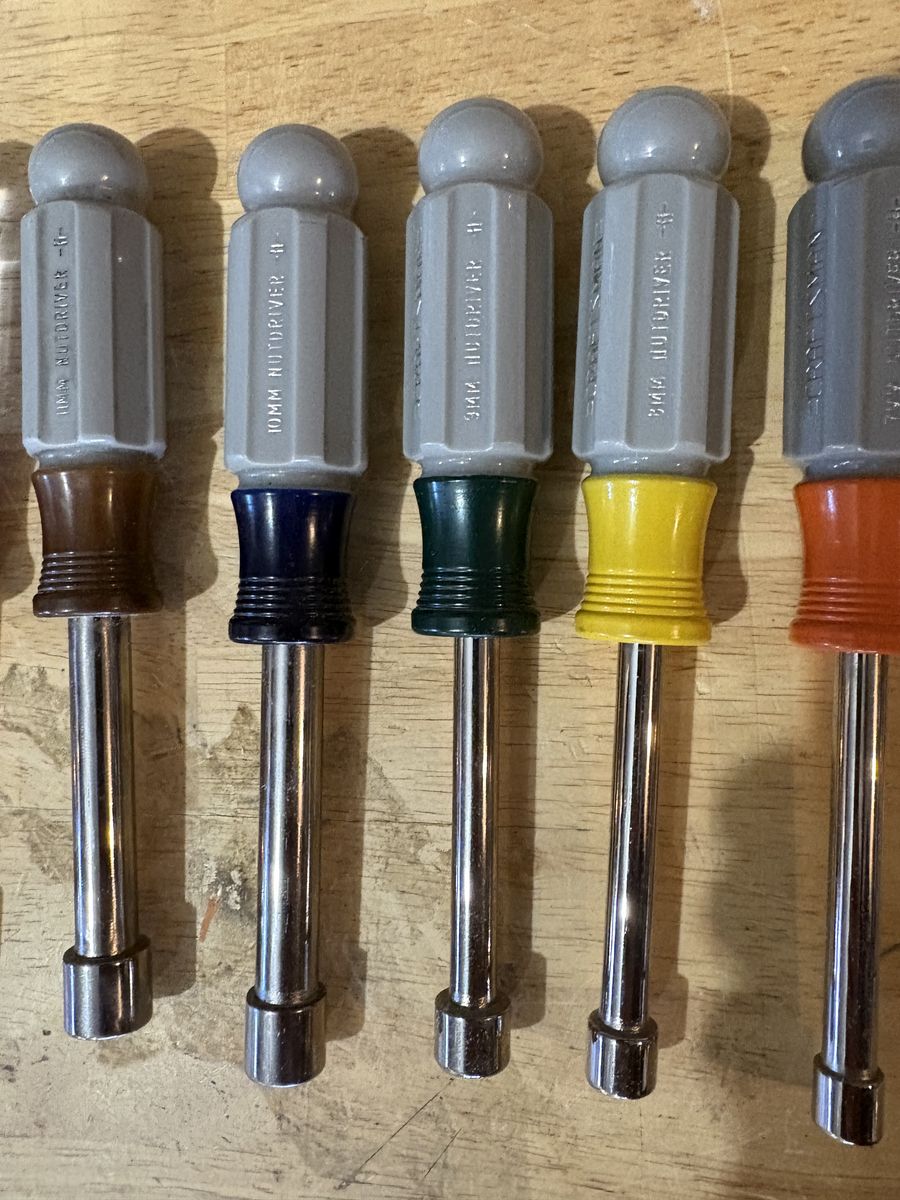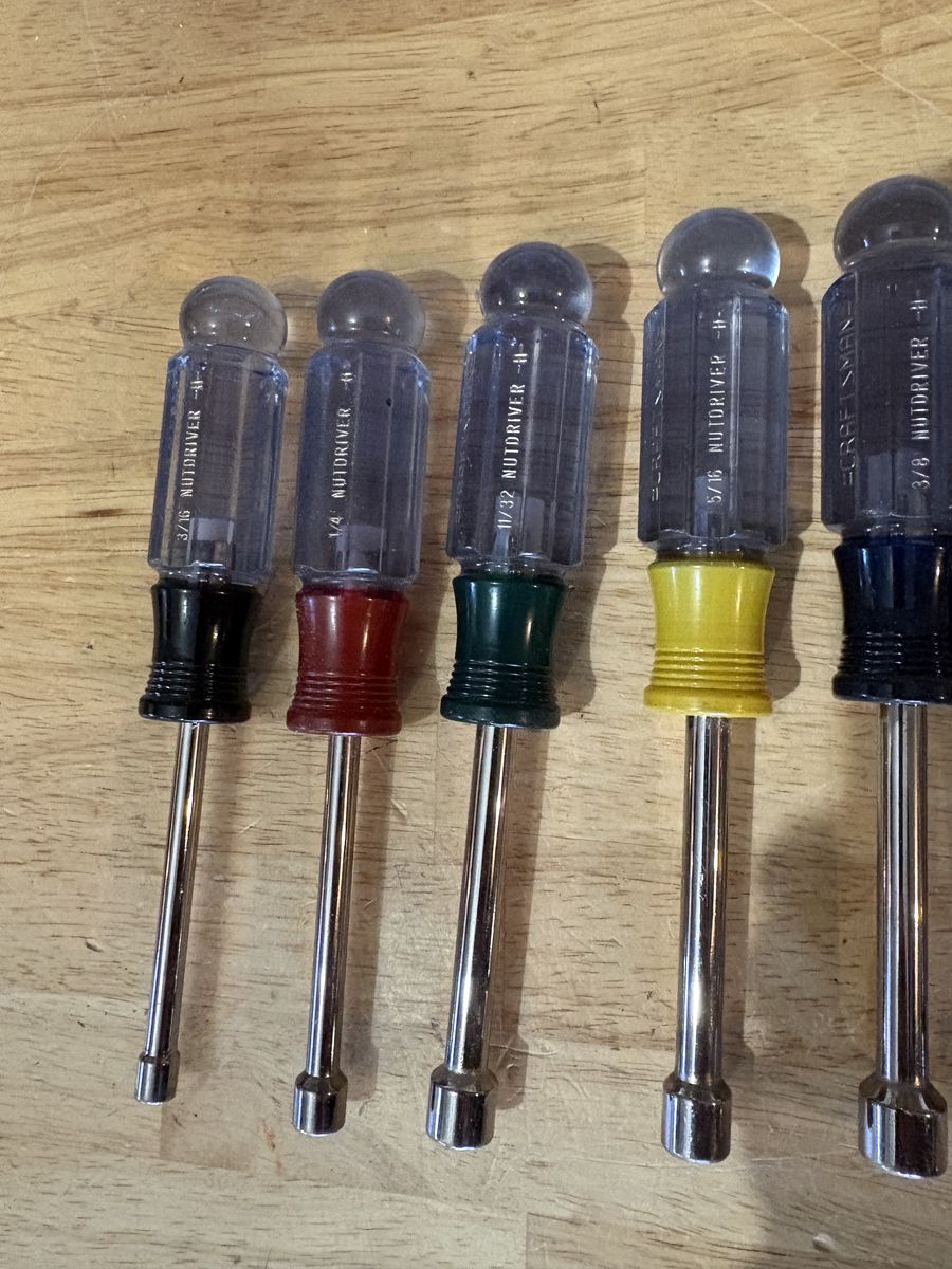 PayPalComplete set of SAE and metric nut drivers which were made in USA. Inch sizes 3/16 to 1/2 and metric 5 mm to 11 mm. Color coded for quick and easy indentification. Excellent condition. 14 total tools.