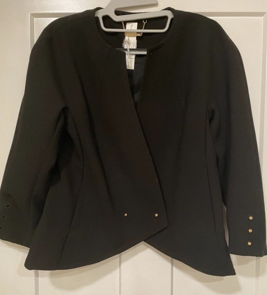 ApplePayTrina Turk Size 0 fits size 2-4 Retails $378 I bought at Nordstrom rack never worn tags still attached Black blazer jacket with gold front and cuffs buttons