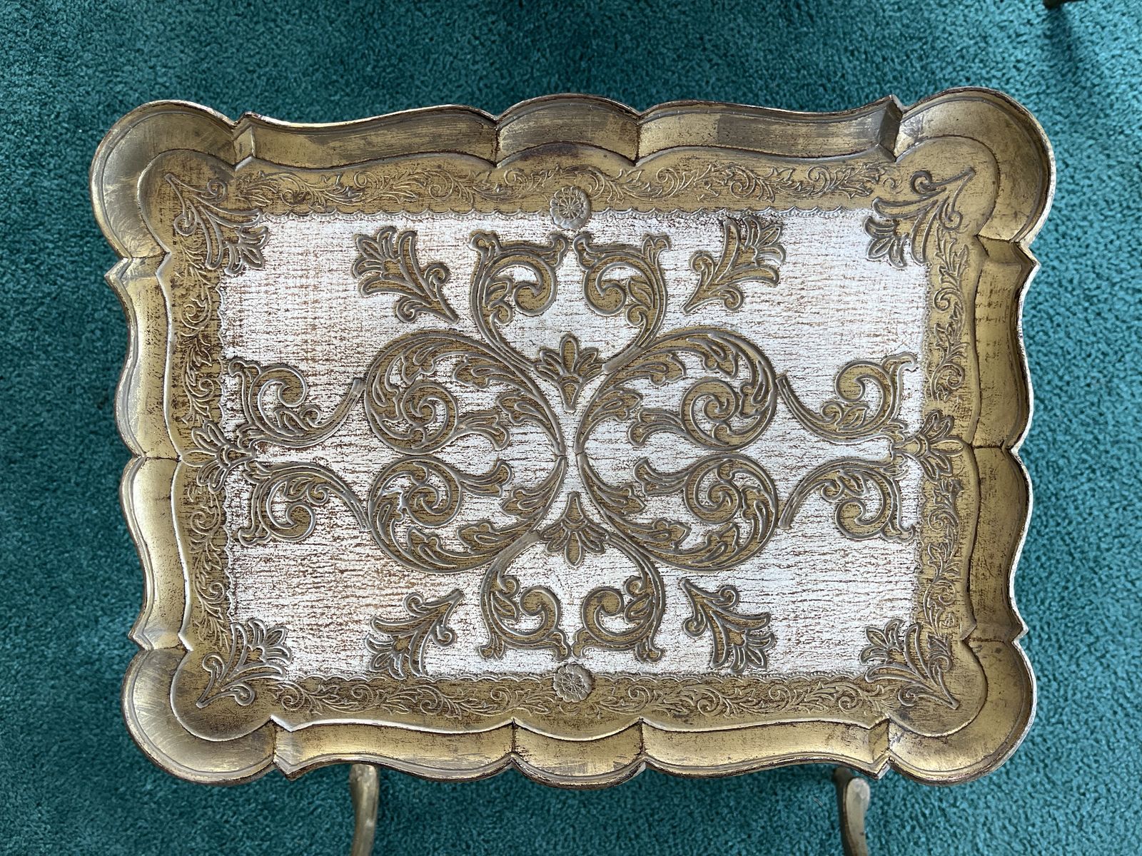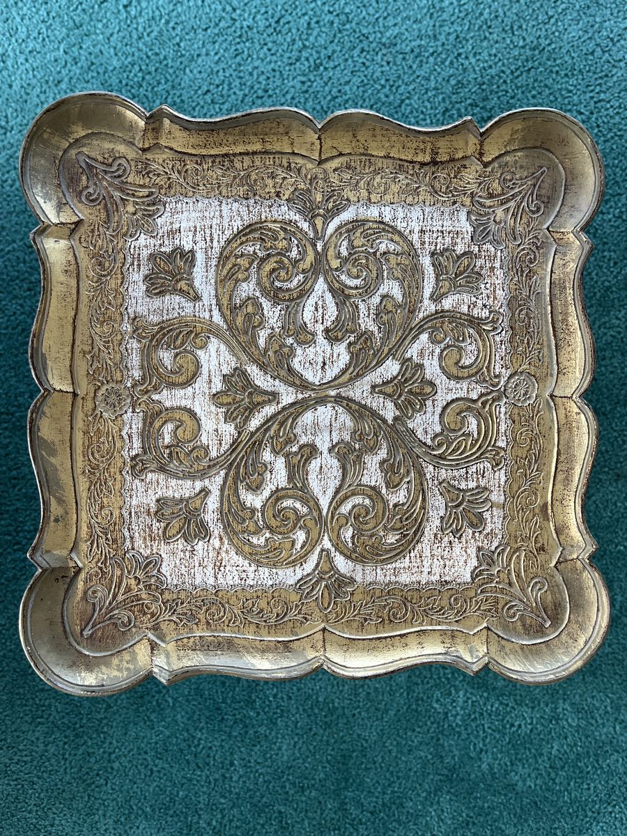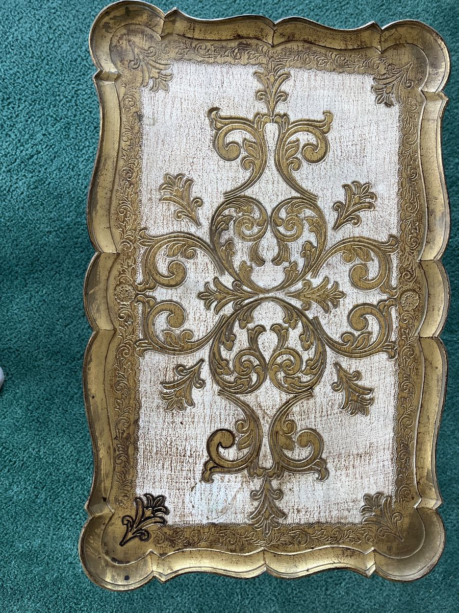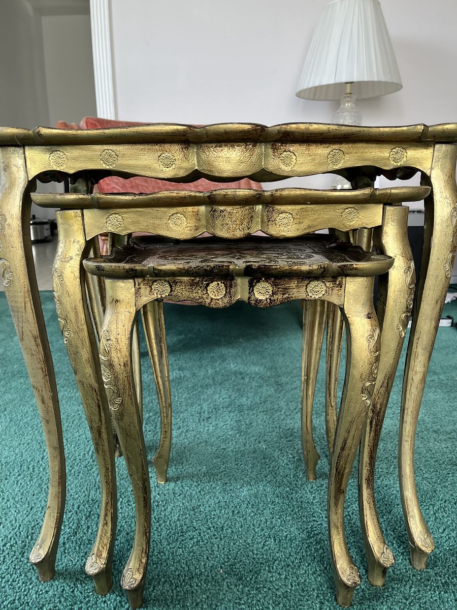ApplePayBeautiful set of 3 vintage Florentine style nesting tables with detailed gold scrollwork and distressed finish. These have a great Hollywood Regency look and work perfectly as side tables, plant stands, or decorative accents.