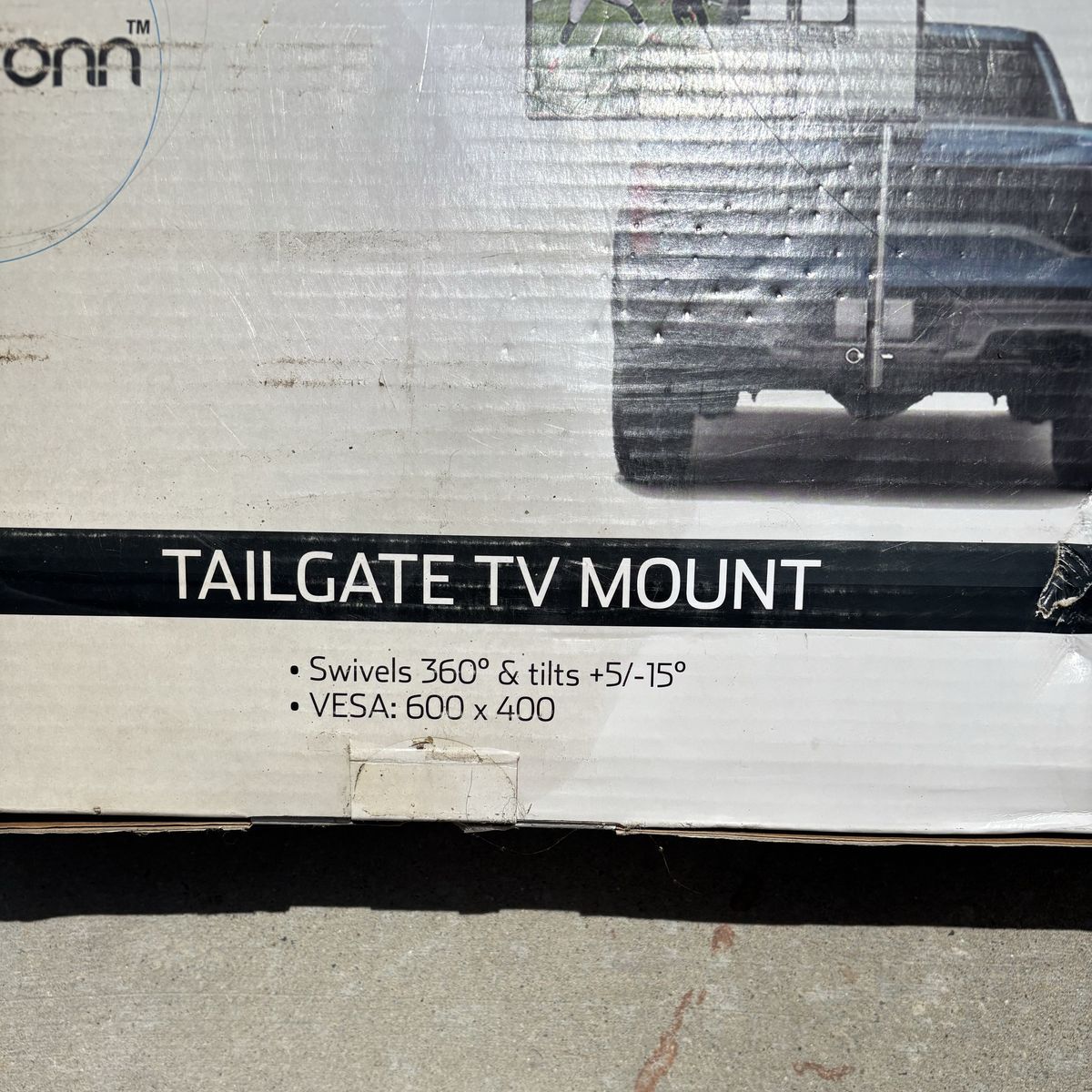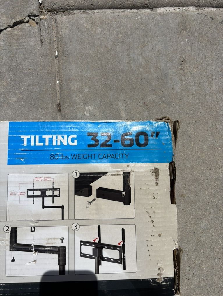 This is a tilting TV mount designed for tailgate use, compatible with TVs sized 32-60 inches and with a maximum weight capacity of 80 lbs. It features a 360-degree swivel and tilts from +5 to -15 degrees. The VESA compatibility is 600 x 400.