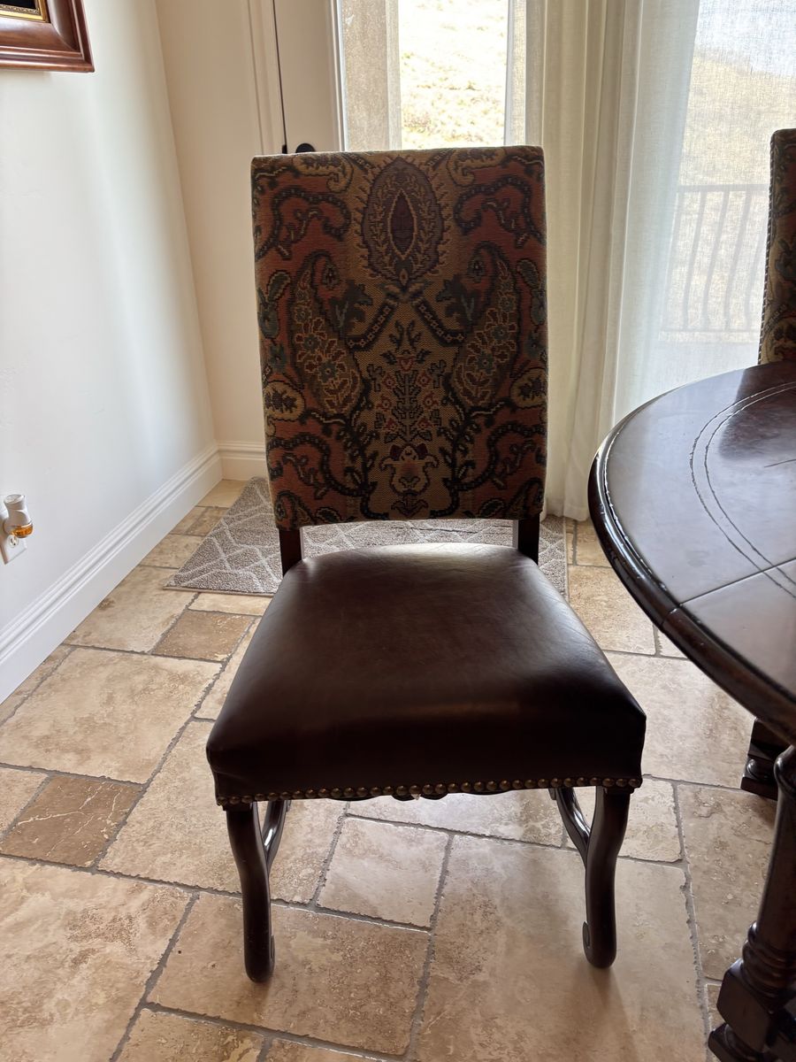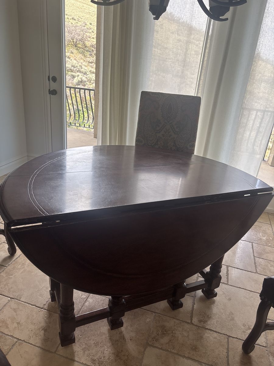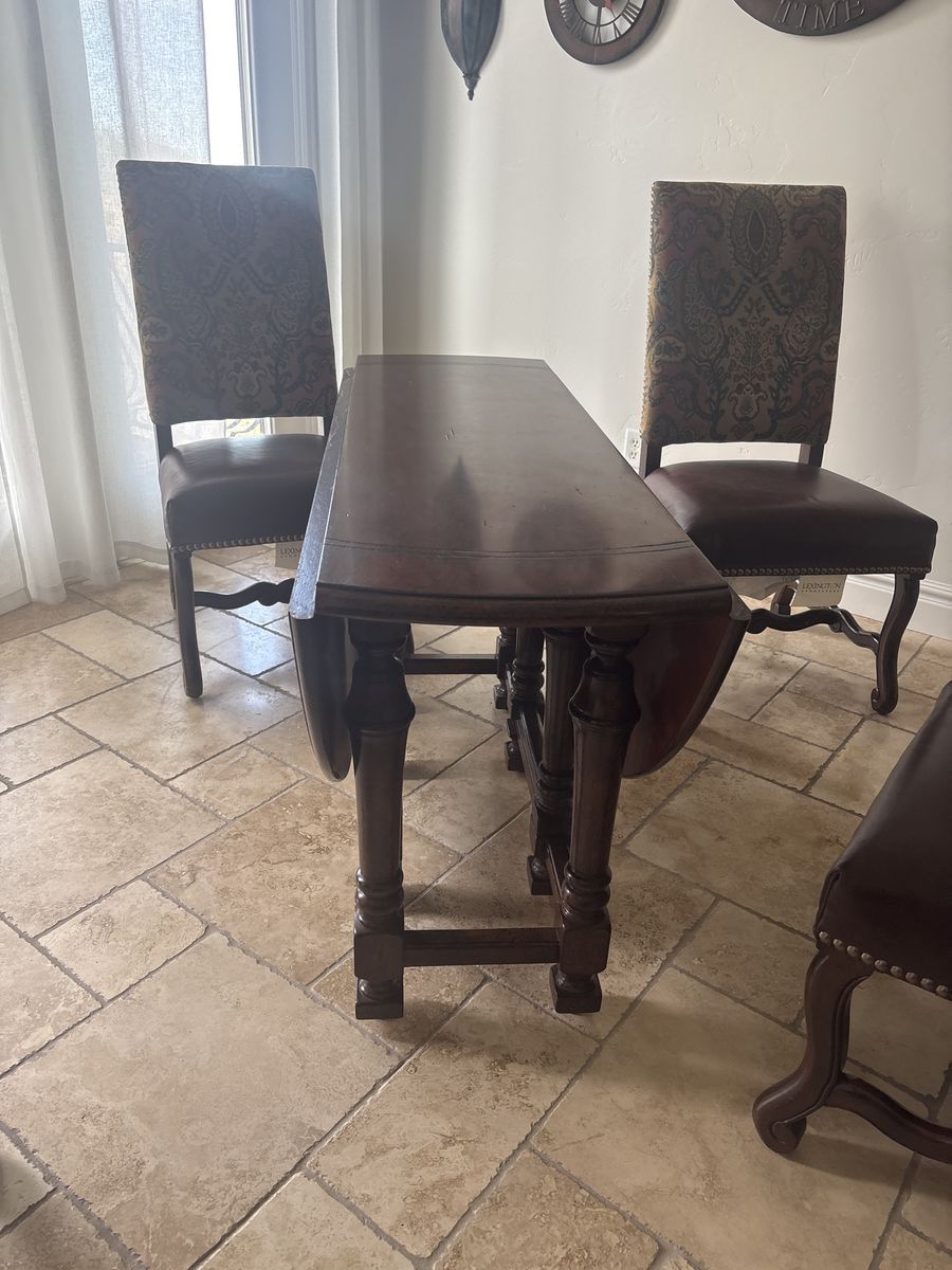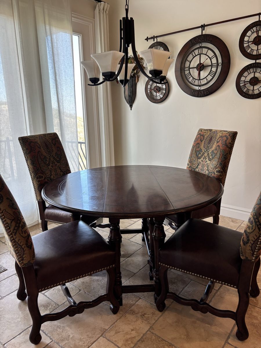 ApplePaySolid cherrywood Lexington table with collapsible sides. 4 wood chairs with leather seat cushions and upholstered backs. Excellent like new condition 54” in diameter, 30” high