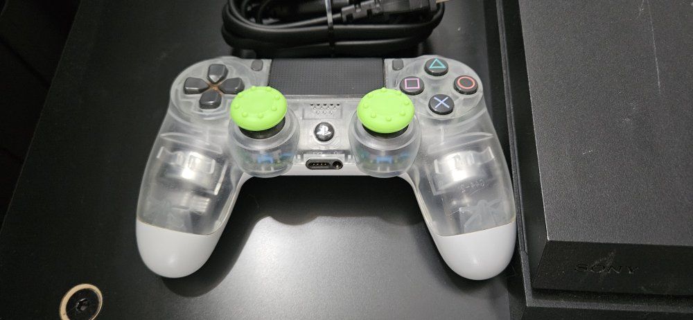 The controller is an official Sony PS4 controller and has analog stick covers.