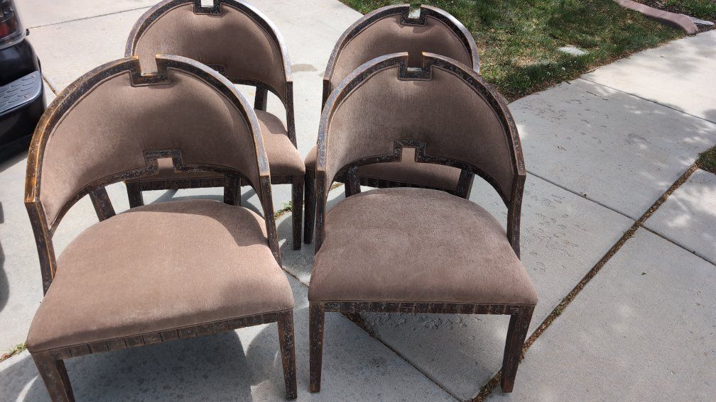These chairs are made of hard wood, cotton crushed velvet-like upholstery. Distressed look on the wood. Excellent condition, pet-free and neutral smell.