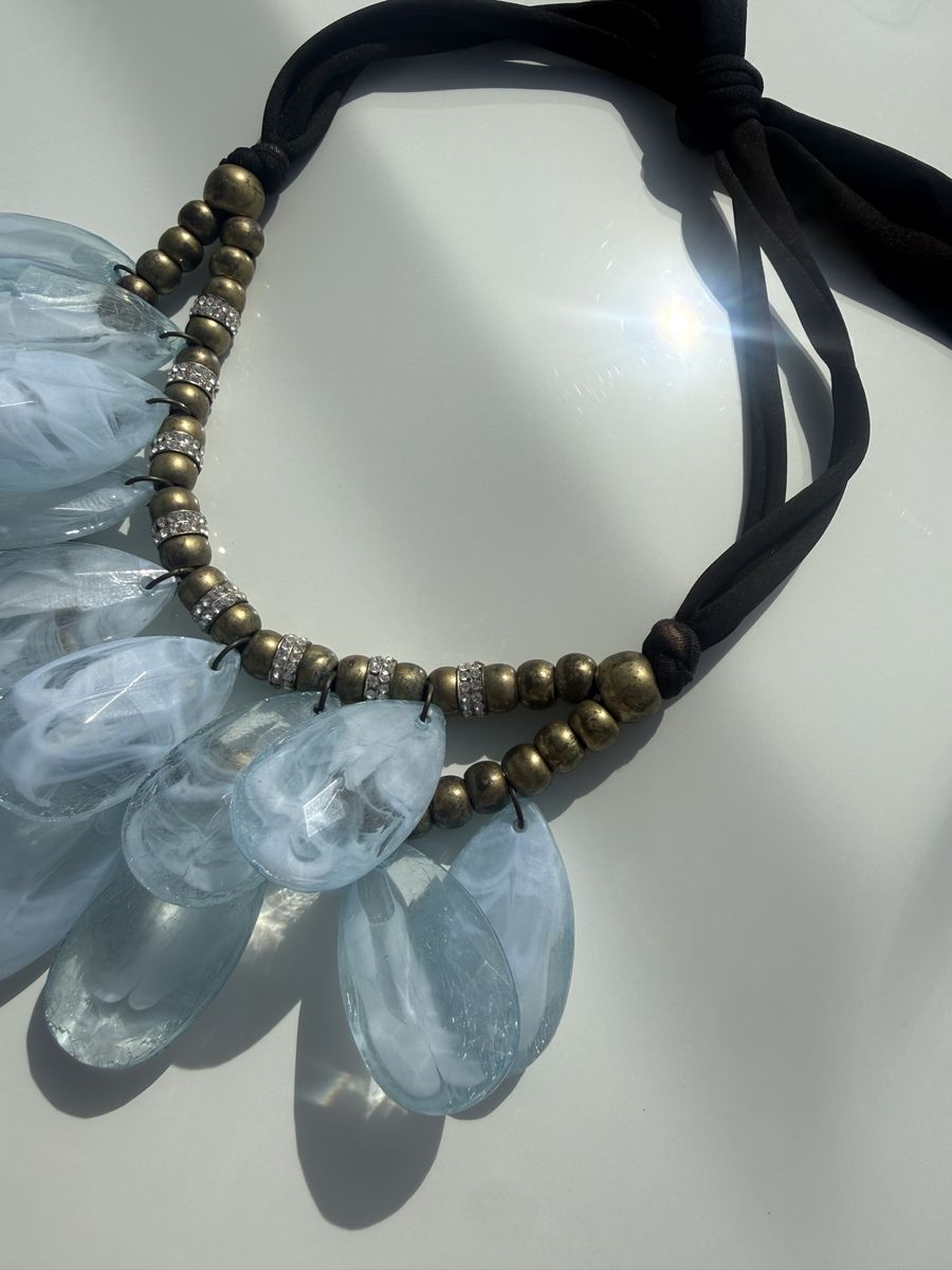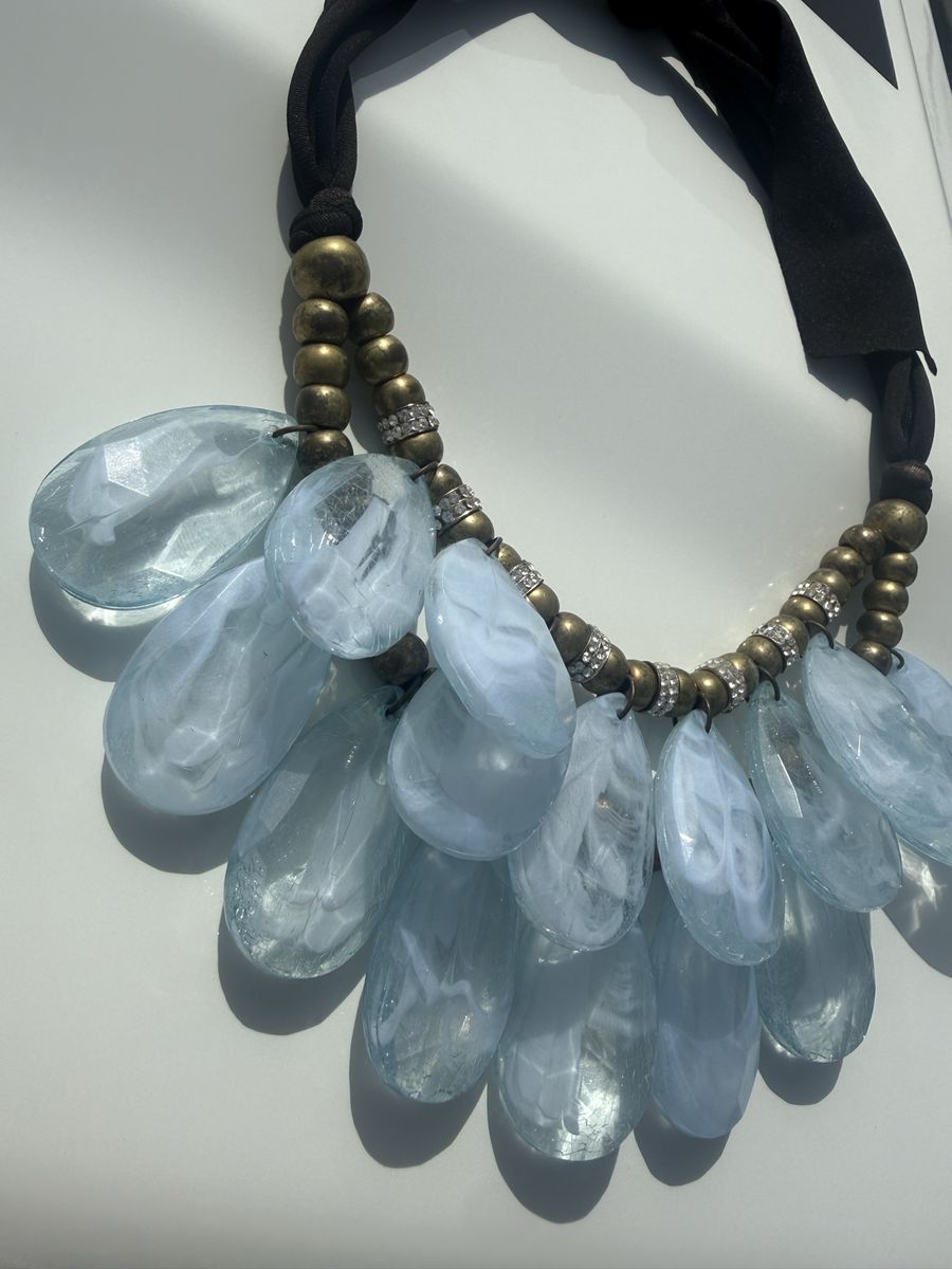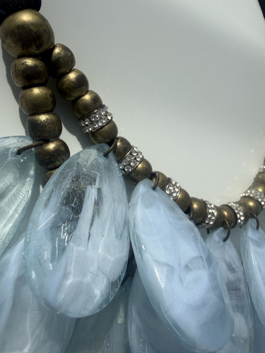 VenmoGorgeous! Reflects light beautifully. Light turquoise teardrops, layered in a bib style. Accented with gold and rhinestones. Adjustable length with cloth tie-back.