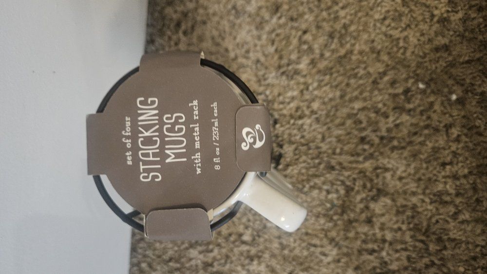 VenmoSet of 4 brand new ceramic stacking coffee mugs with black metal storage rack.Each mug holds 8 oz.New with original packaging.