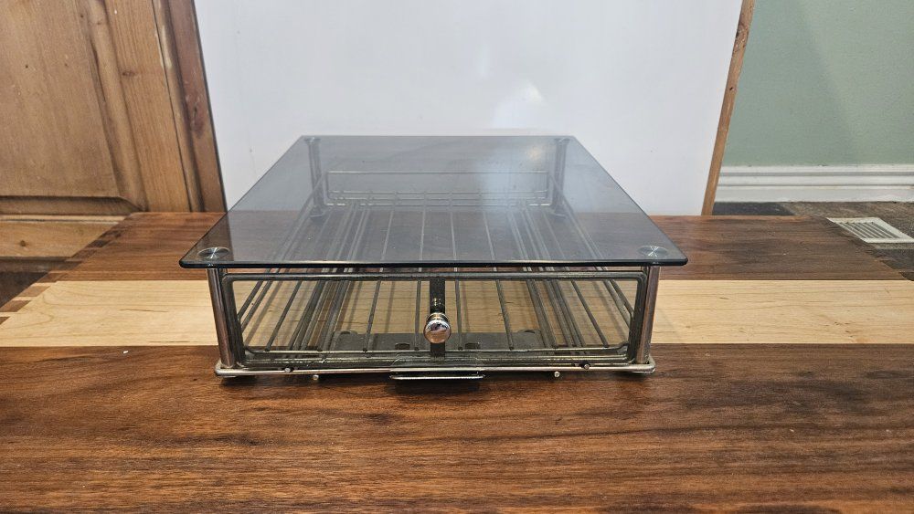 VenmoGlass top coffee pod storage drawer stand for Keurig or other single-serve coffee makers.Good used condition, drawer slides smoothly. Great for organizing a coffee station.