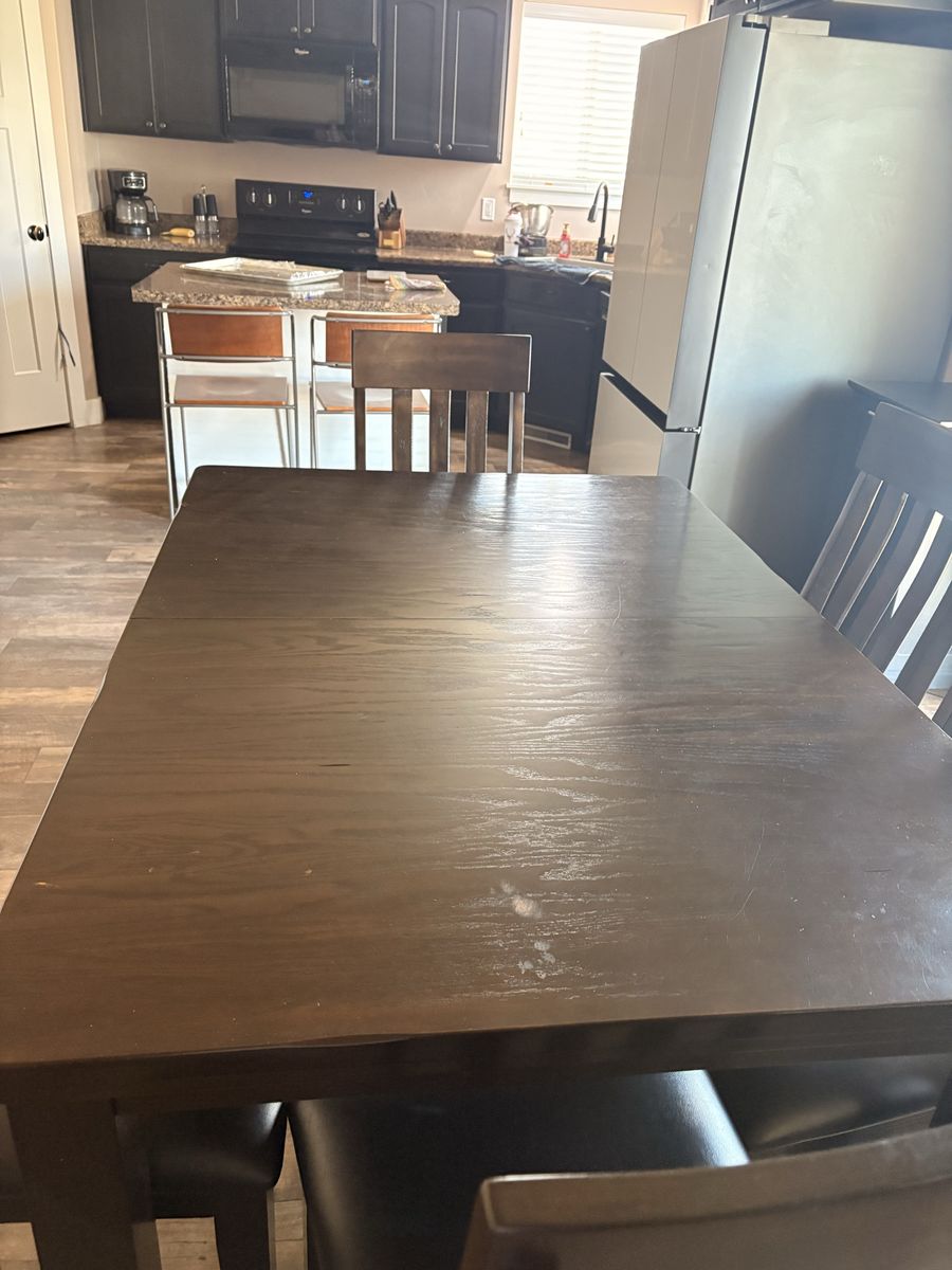 VenmoLight wear on the top from acetone unfortunately. Otherwise great condition bought not even a year ago. Has a leaf to make it bigger if you want it stores in the table. No rips in the chair cushions.