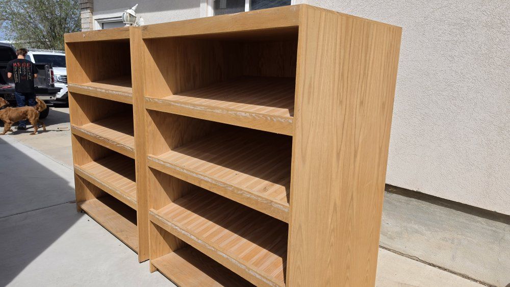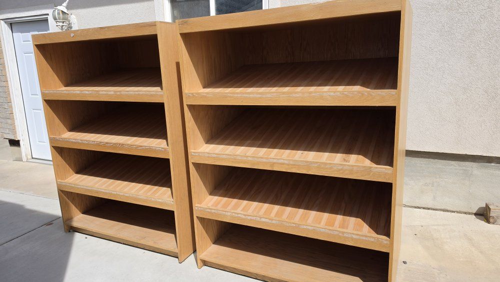 Venmoheavy duty wood shelving i had in my garage but wife wanted to go a different route i have two sections they are both included in this price. The dimensions are 66 inches tall 49.5 wide and 34 inches deep. There is four shelves on each cabinet. They solid heavy wood bring help if you want to put them in a truck.