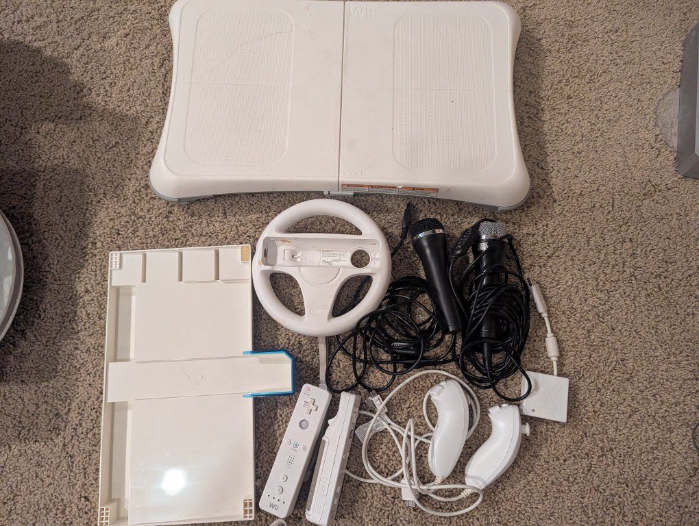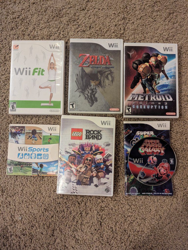 VenmoWii cables for RCA and component two controllers games:; Wii sports super Mario Galaxy (missing the case) Wii fit and board metroid prime 3 zelda twilight princess lego rock band (only have the mics)