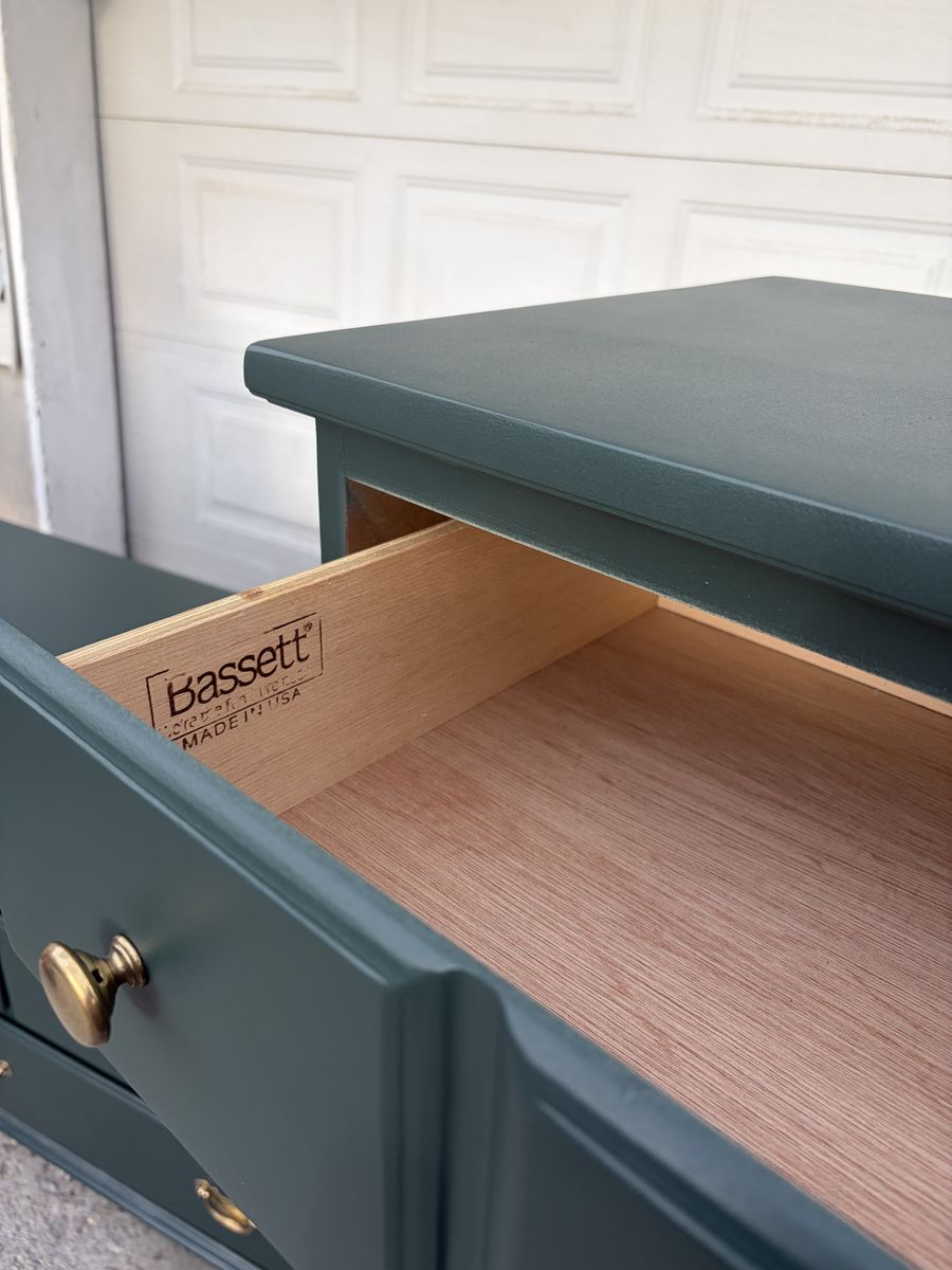This matching bedroom set has been fully refinished and is ready for its next home. Originally made by Bassett Furniture (Made in USA), these pieces are built to last and have been thoughtfully restored with quality materials.