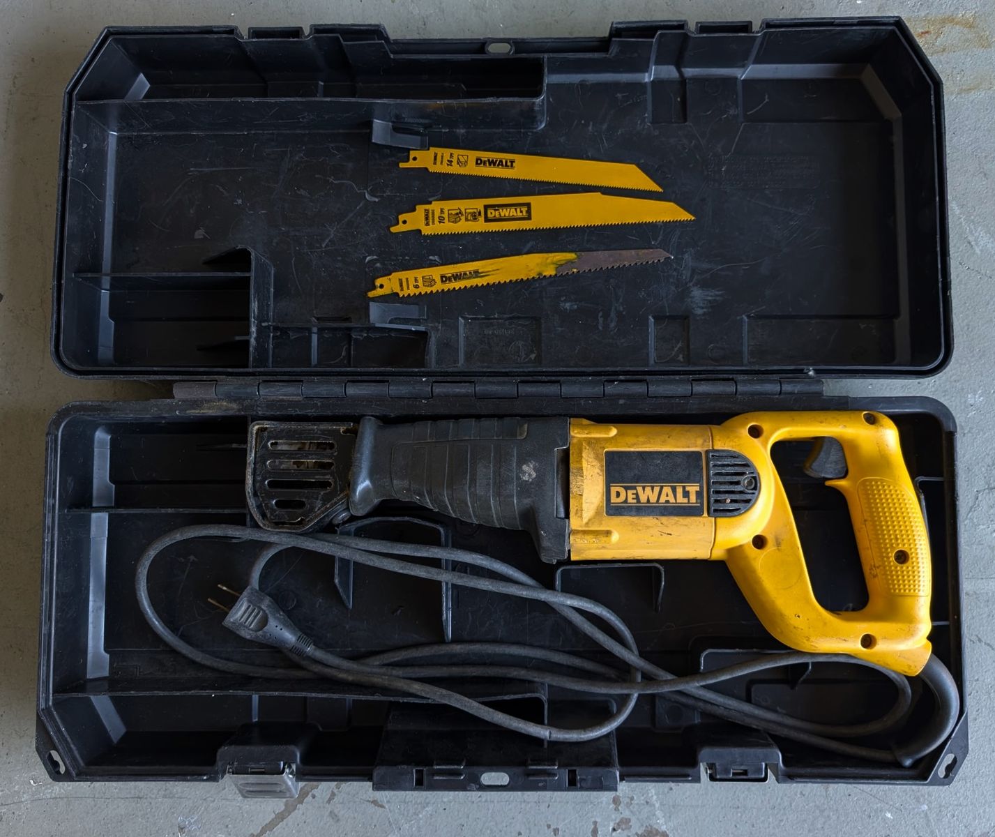 DeWalt reciprocating saw in good working condition. Includes original case and extra blades. Brand: DeWalt Corded electric Includes multiple blades Condition: Good (normal use, fully functional) Great for demo work, cutting wood, or home projects.
