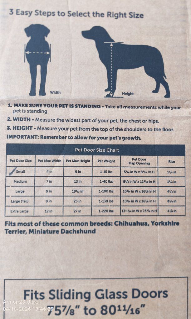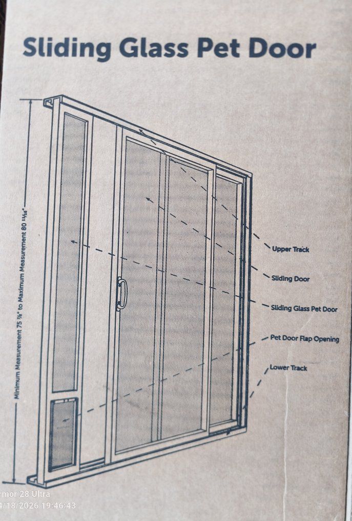*Great for Rentals & apartments. *Self-adjustable height from 75 7/8 in - 81 in. *One-piece panel. *No cutting or drilling required. *Installs and removes in one piece. *You can still use your human sliding glass door as normal once the pet door is installed. *Weather-resistant aluminum frame. *Shatter-resistant tempered glass. *Magnetic closure to help keep out cold drafts and hot weather. *Locking door panel. See Less