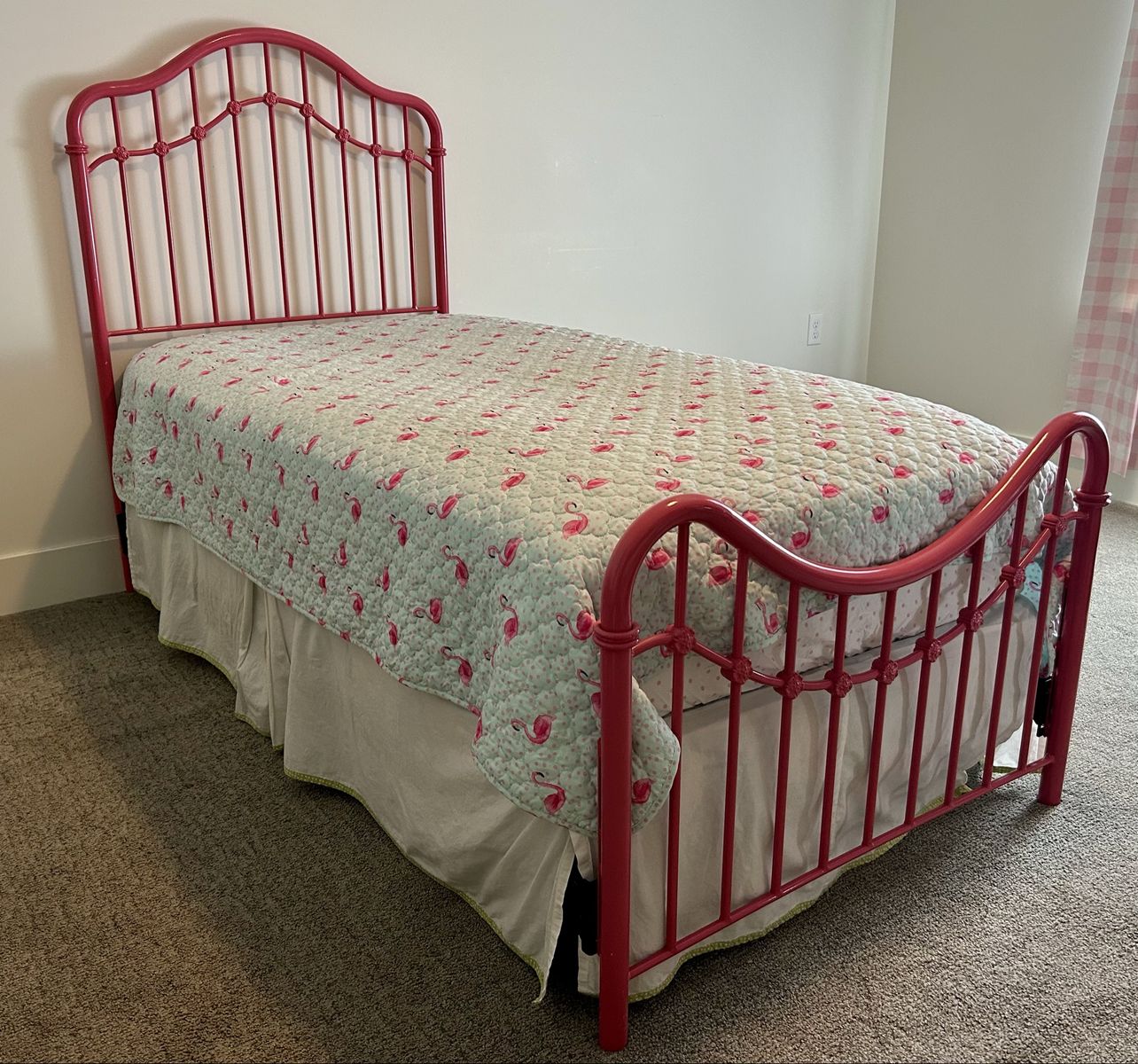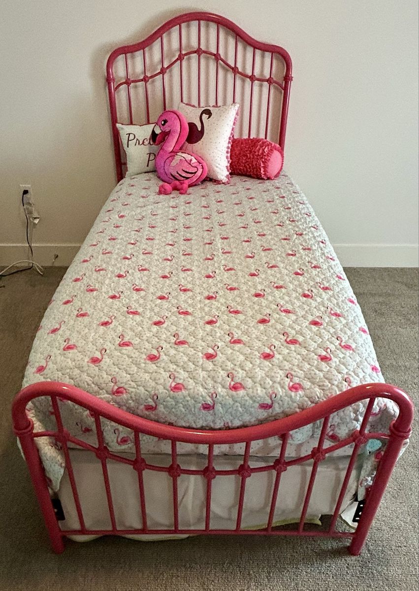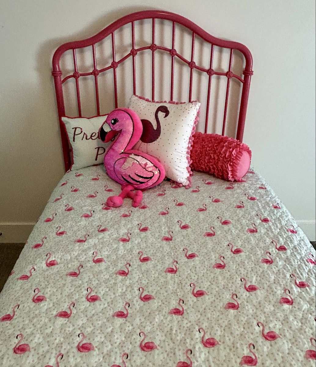 VenmoVintage / antique headboard and footboard with new rails. Twin size New quilt and accent pillows Pink flamingo theme Mattress and box not included