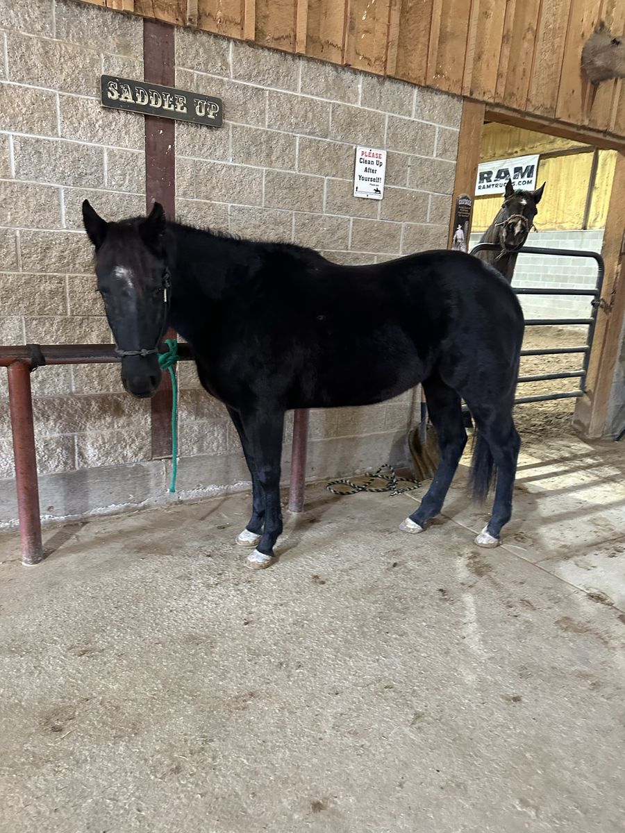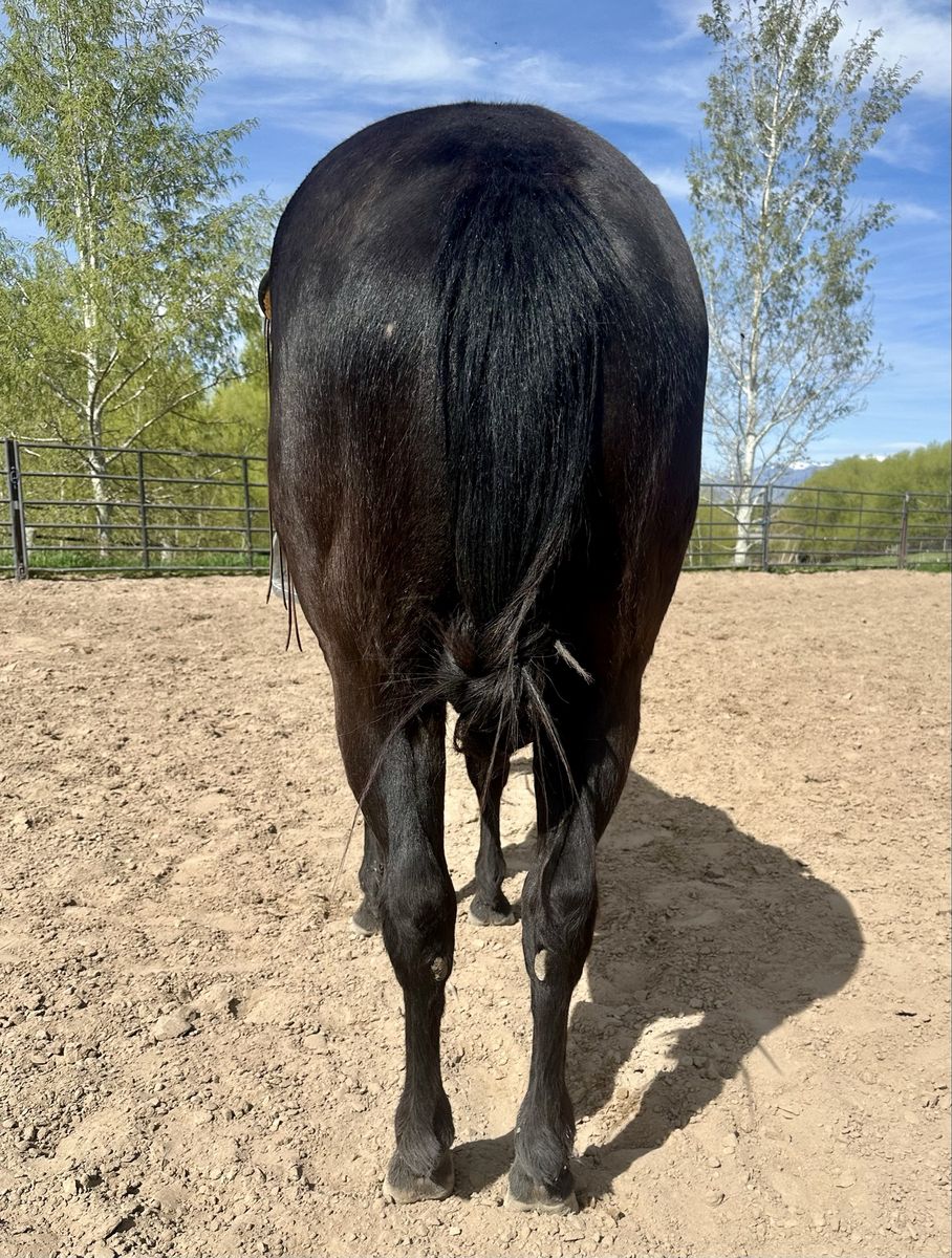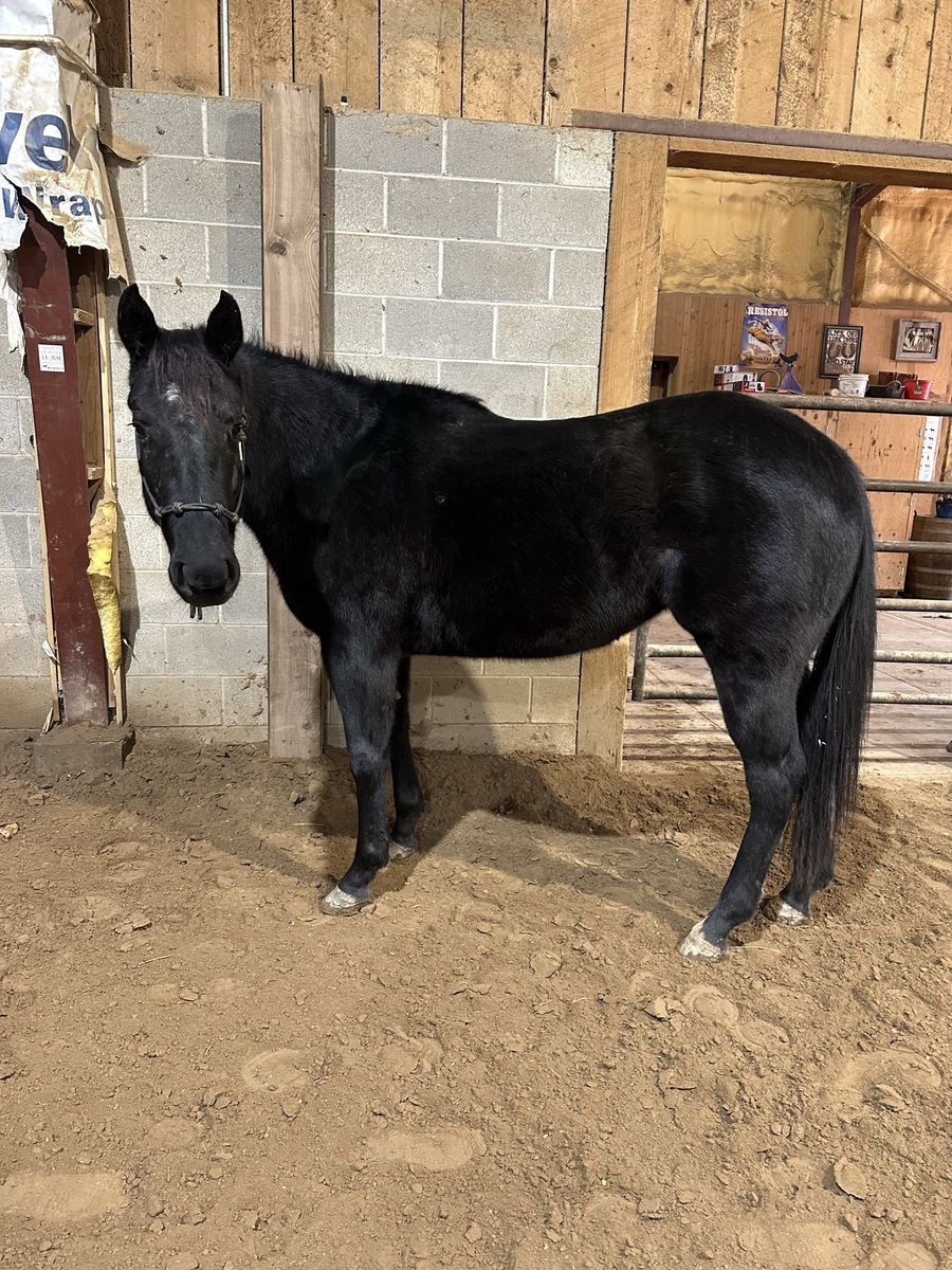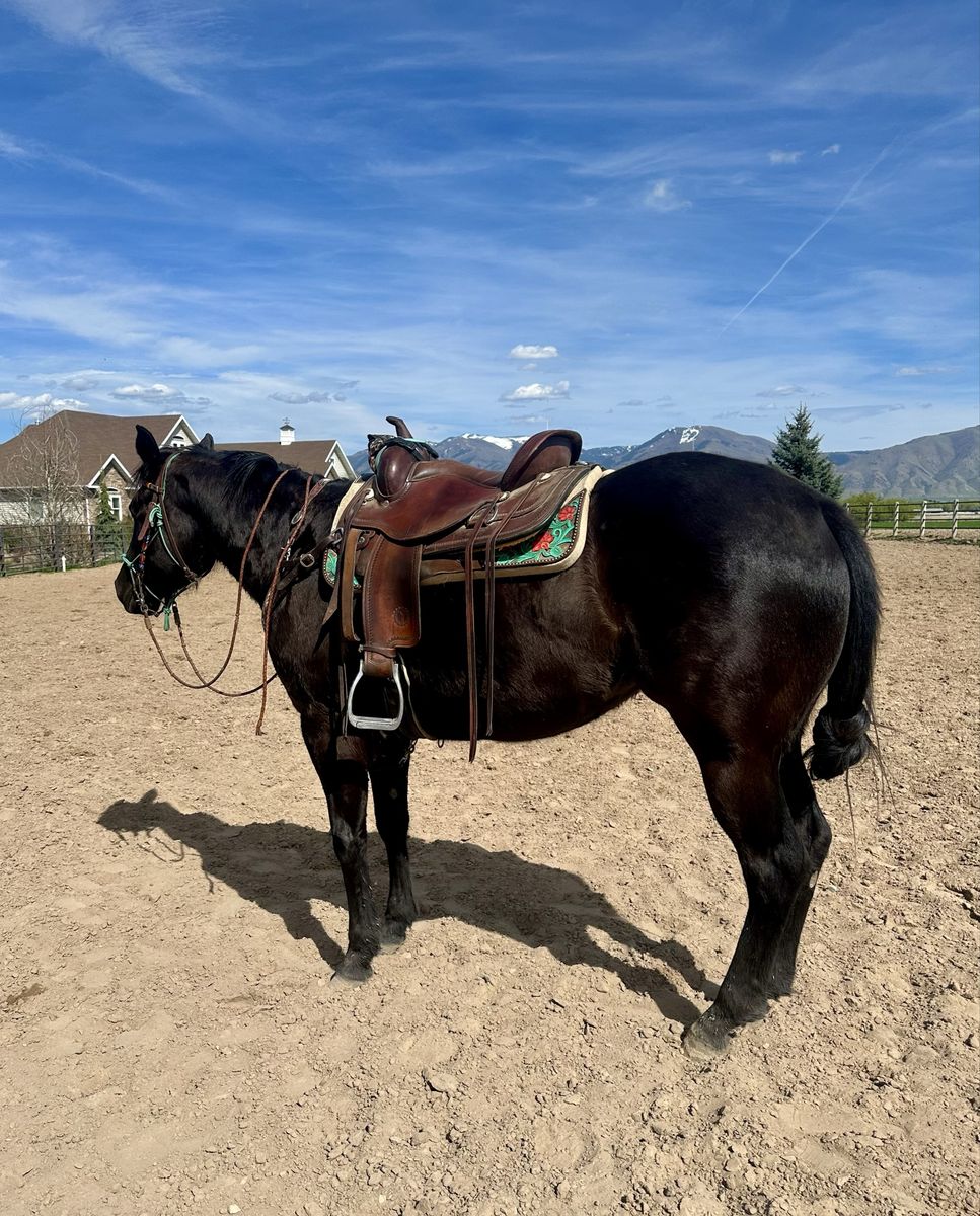 Registered AQHA 3-year-old black mare (Lena Loves Cash) with a great start and an even better mind. Walk trot lope both ways. Has had lots of ground work, lunges, gives to pressure, and wants to please. She’s been started right and is ready to go on in any direction. Professionally started and maintained. 15.1 hands but will mature 15.2-15.3 hands. Easy to have around—ties, loads, and trailers well. Good in both a stall and pasture, and sits in the middle of the pecking order. Great for the farrier, currently barefoot but has had shoes and does well either way. Very gentle, willing, and easygoing—she has the kind of temperament that will make a great kid’s horse with more miles. She has lots of trail miles, not much phases her. UTD on vaccines, deworming, just got a trim, and had her teeth floated. She’s ready to go! By Poco Royal Cash and out of Royal Blue Lena DR, giving her a solid mix of cow and foundation breeding.
