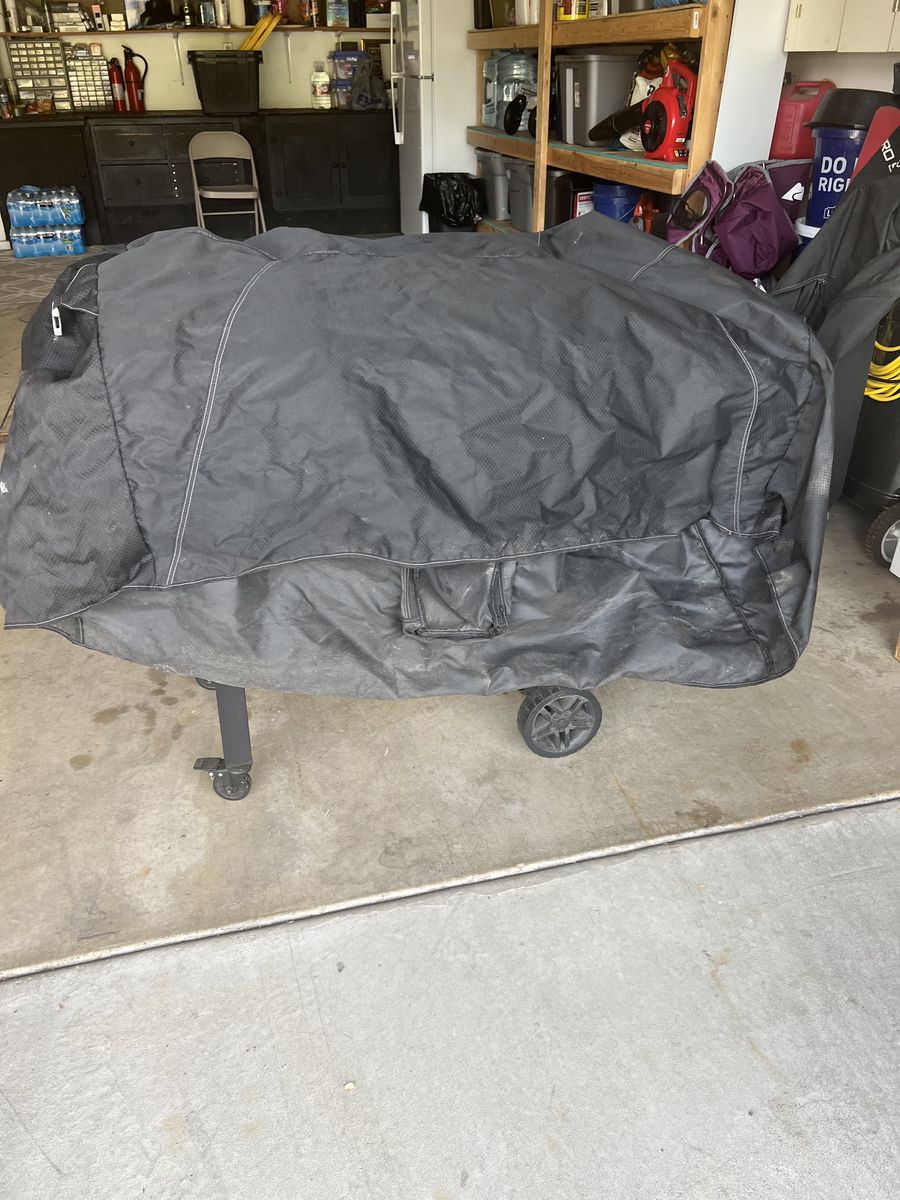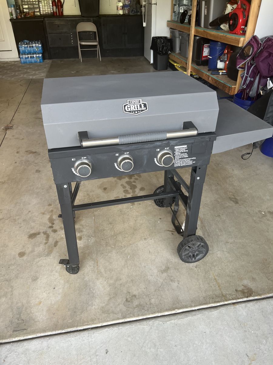 Flat top grill that has 26 x 16 inches of cooking surface. Works well and have had no trouble. Grill comes with cover.