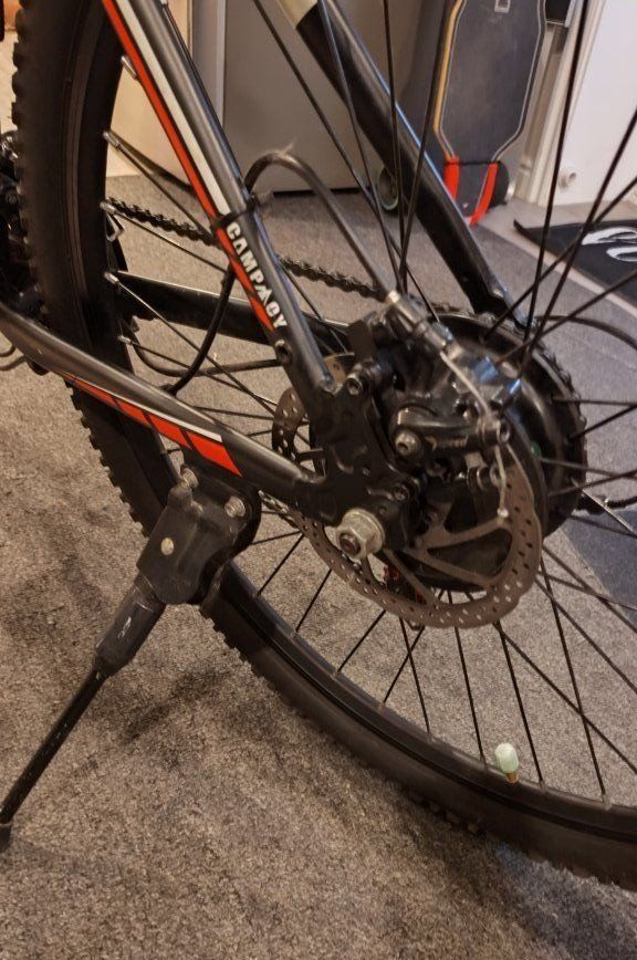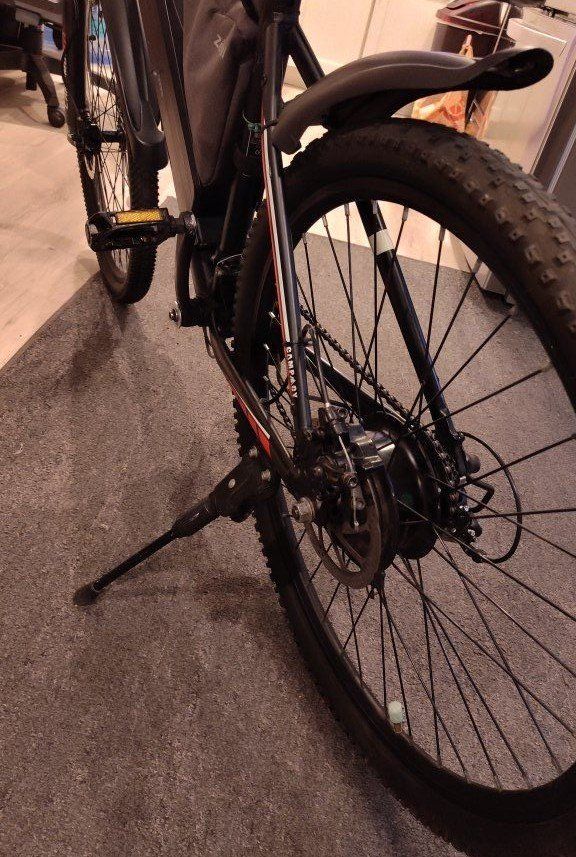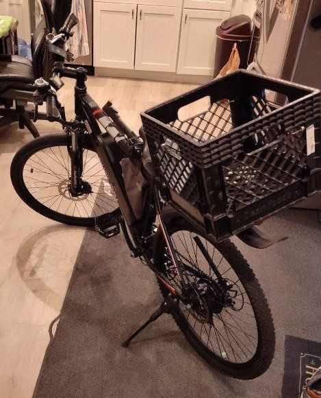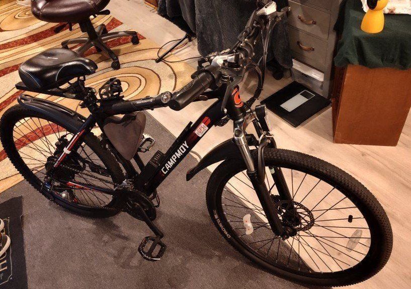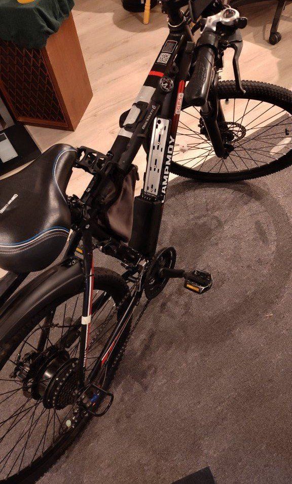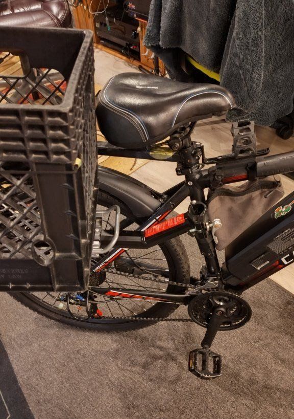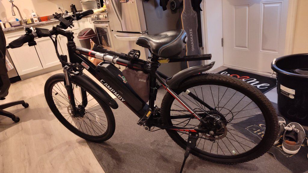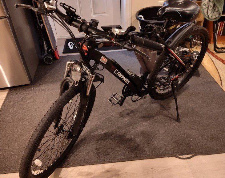 Campoy Elite model 9174 E-bike. 24mph, Rotor brakes, basket, axle slider, new rear tire/anti flat tubes, mounted air pump, phone holder, speedometer guage, storage bag with tools.