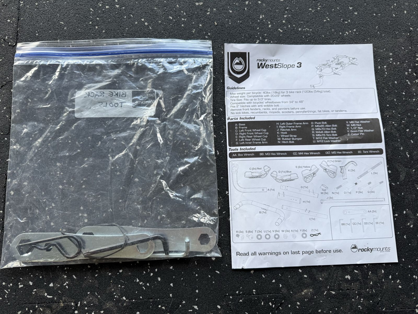 GooglePayRockyMounts WestSlope 3 with manufacturer tools and instruction booklet. Used just a handful of times. 3 bike capacity with 2” trailer mount.