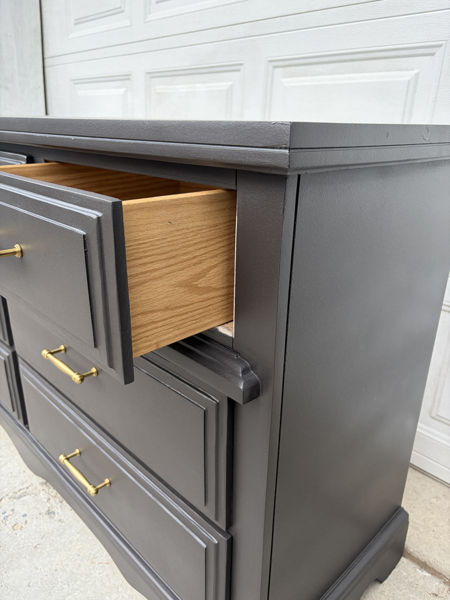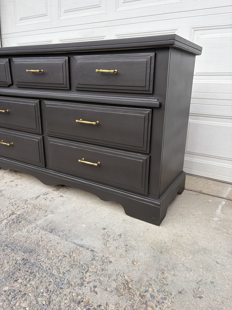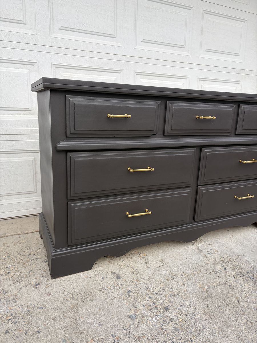 This wide 7-drawer dresser has been completely transformed with a rich charcoal finish and gorgeous brass hardware — the combination is chef’s kiss and fits perfectly with modern, transitional, or glam bedroom styles.