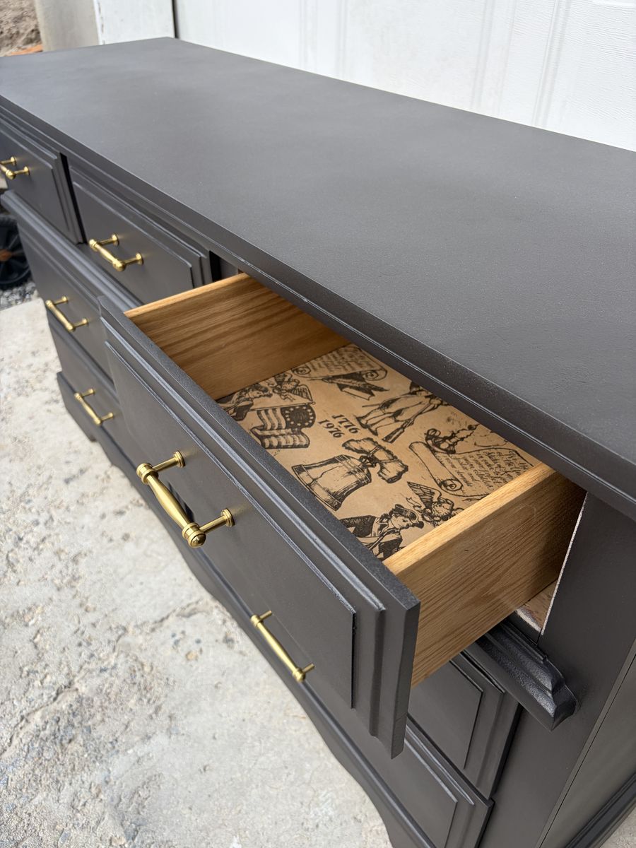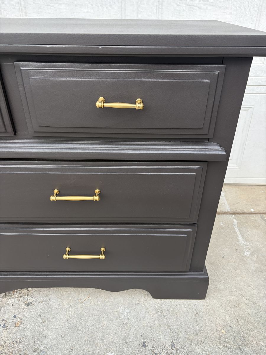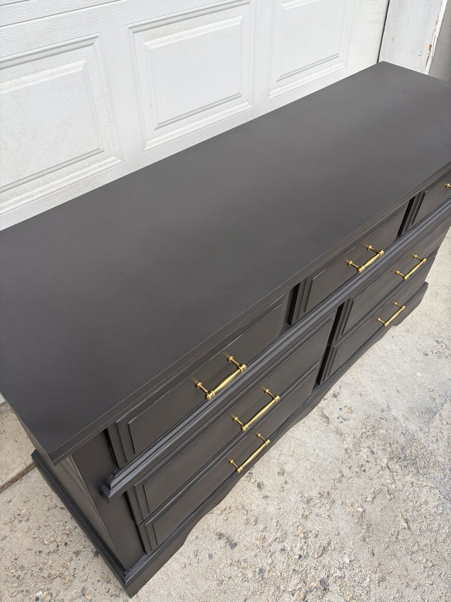 This wide 7-drawer dresser has been completely transformed with a rich charcoal finish and gorgeous brass hardware — the combination is chef’s kiss and fits perfectly with modern, transitional, or glam bedroom styles.