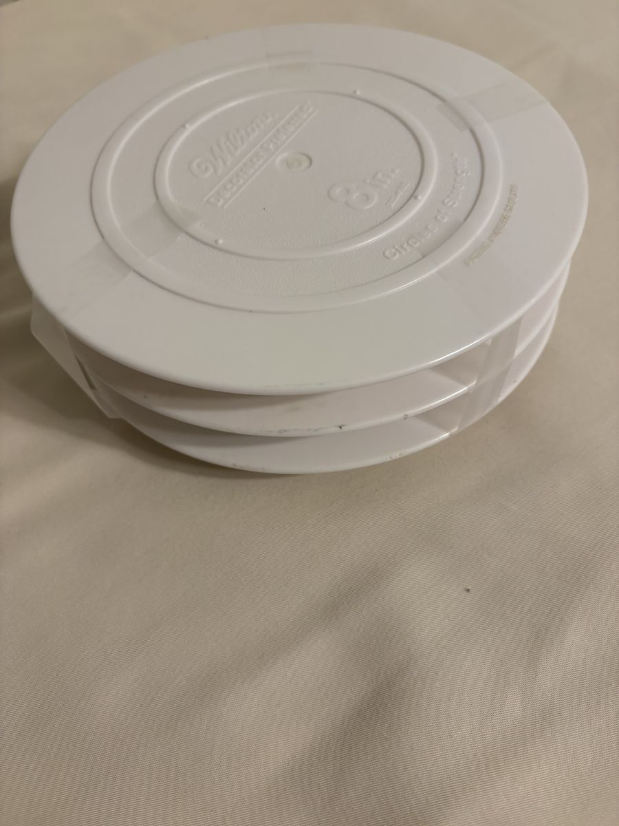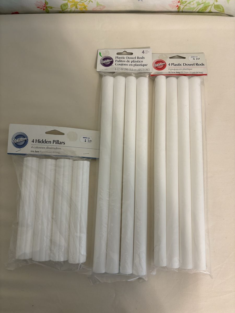 Round cake pans 2” deep: 16”- $14; 14”- $12; 12”- $10; 8”-$6; 6”-$4; 4”-$3 Separator plates 14”, 12”; 10”; 9”; 8”; $2.00 each Plastic dowel rods $1.00 each Grecian pillars 4/7in. 2 sets 5 each 5/$2.00