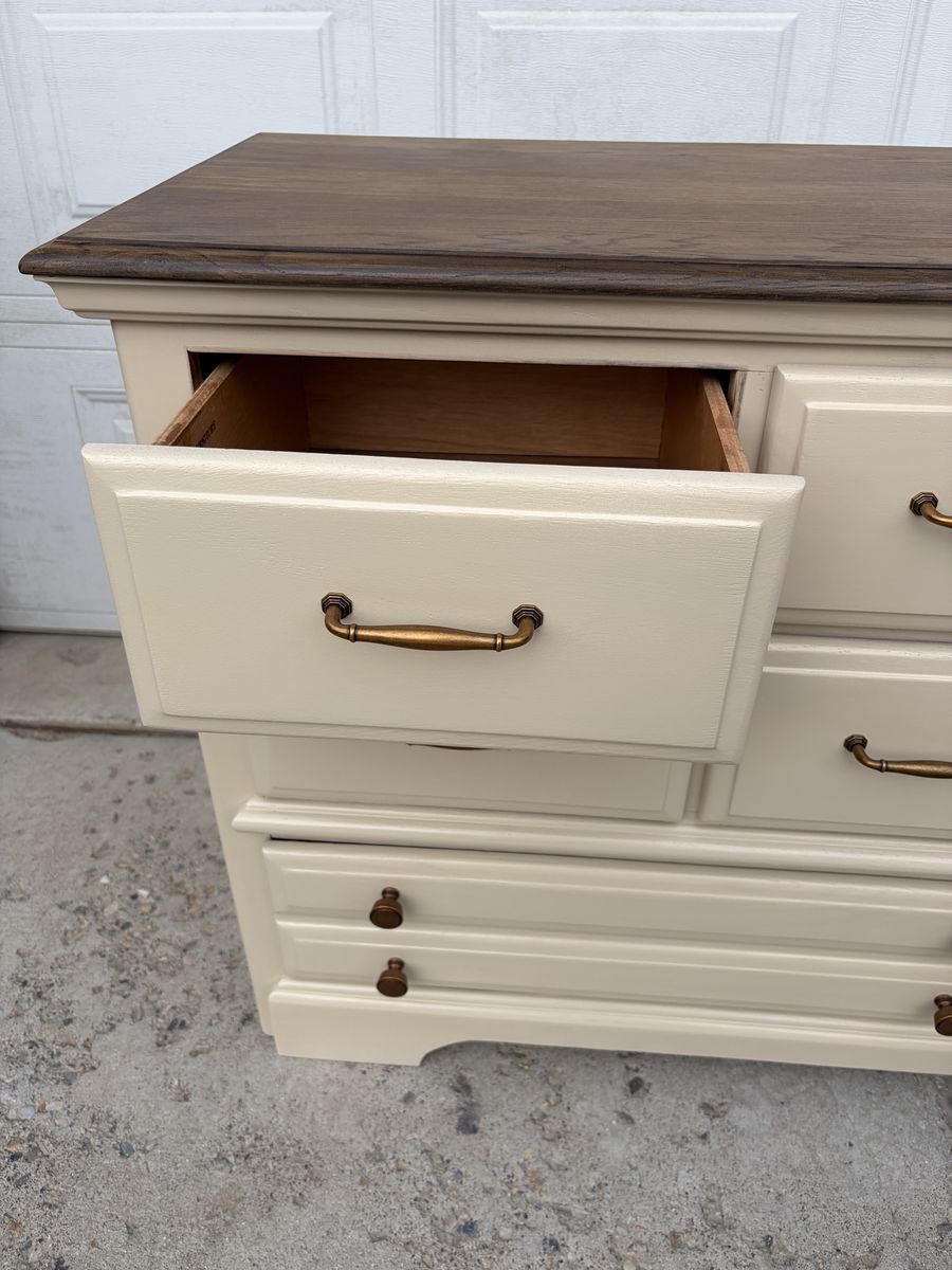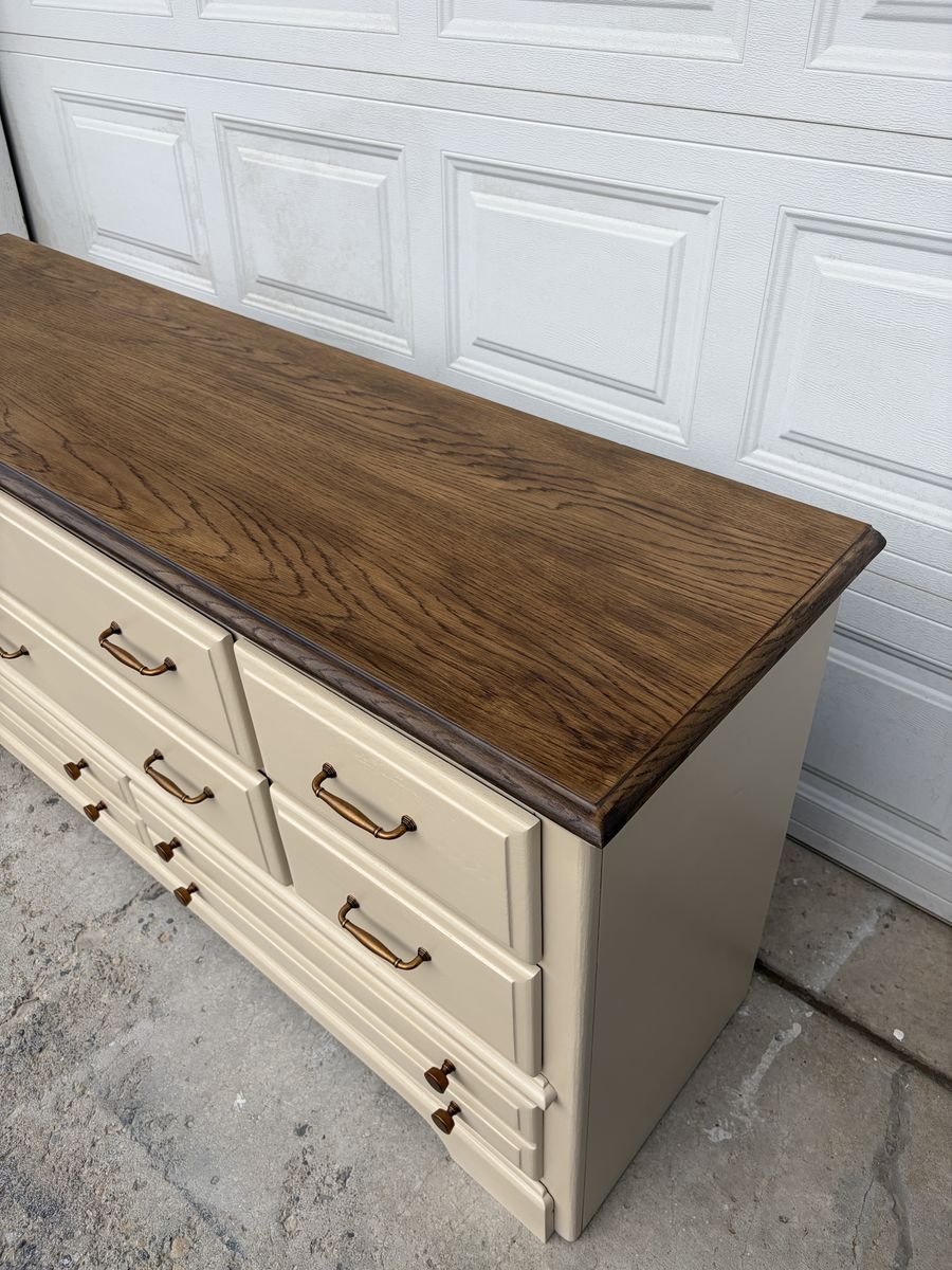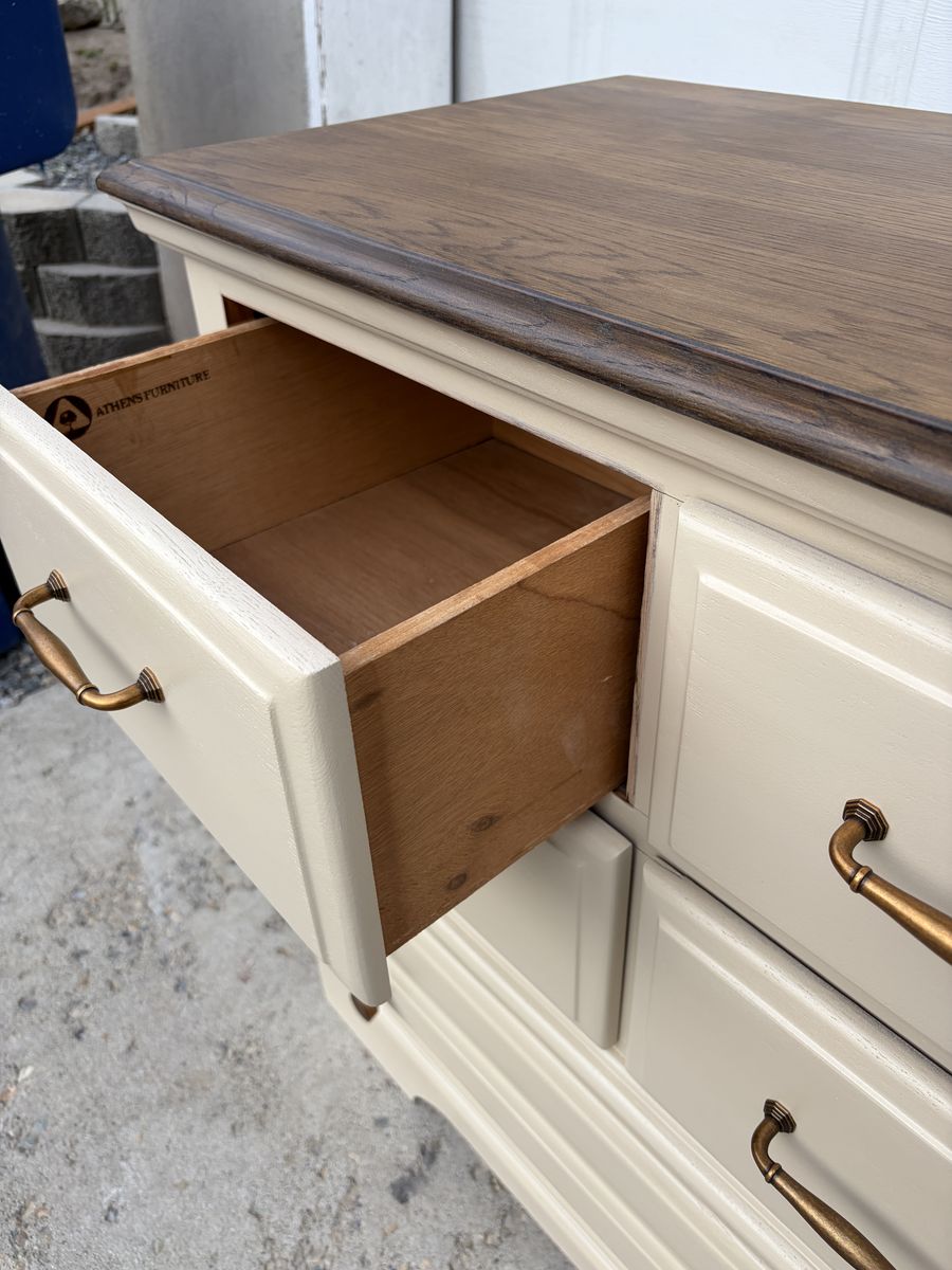 This gorgeous wide dresser by Athens Furniture has been completely transformed and is ready for its next home! Cream/linen finish with a stunning dark stained oak top and warm antique brass hardware — the perfect farmhouse-meets-classic combo.