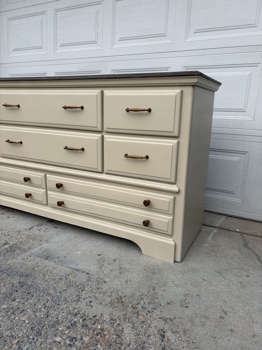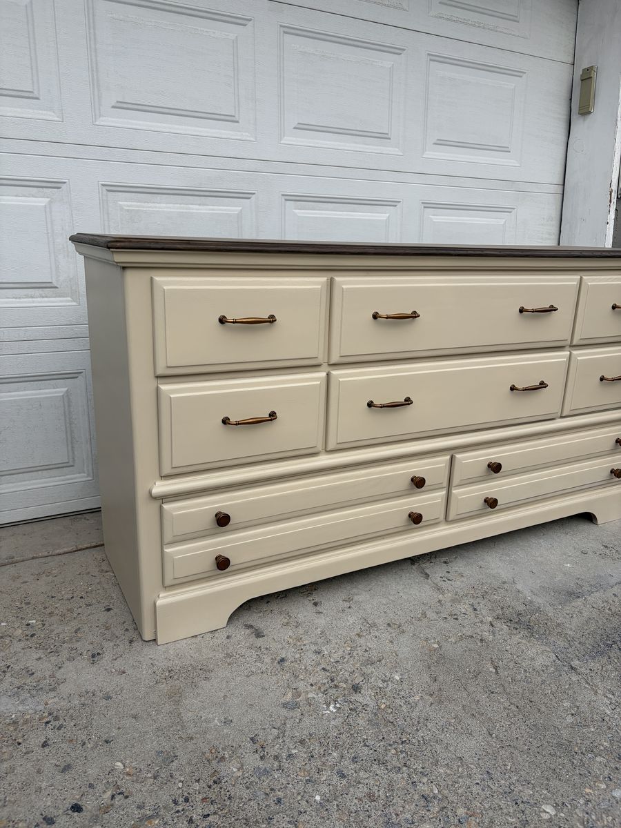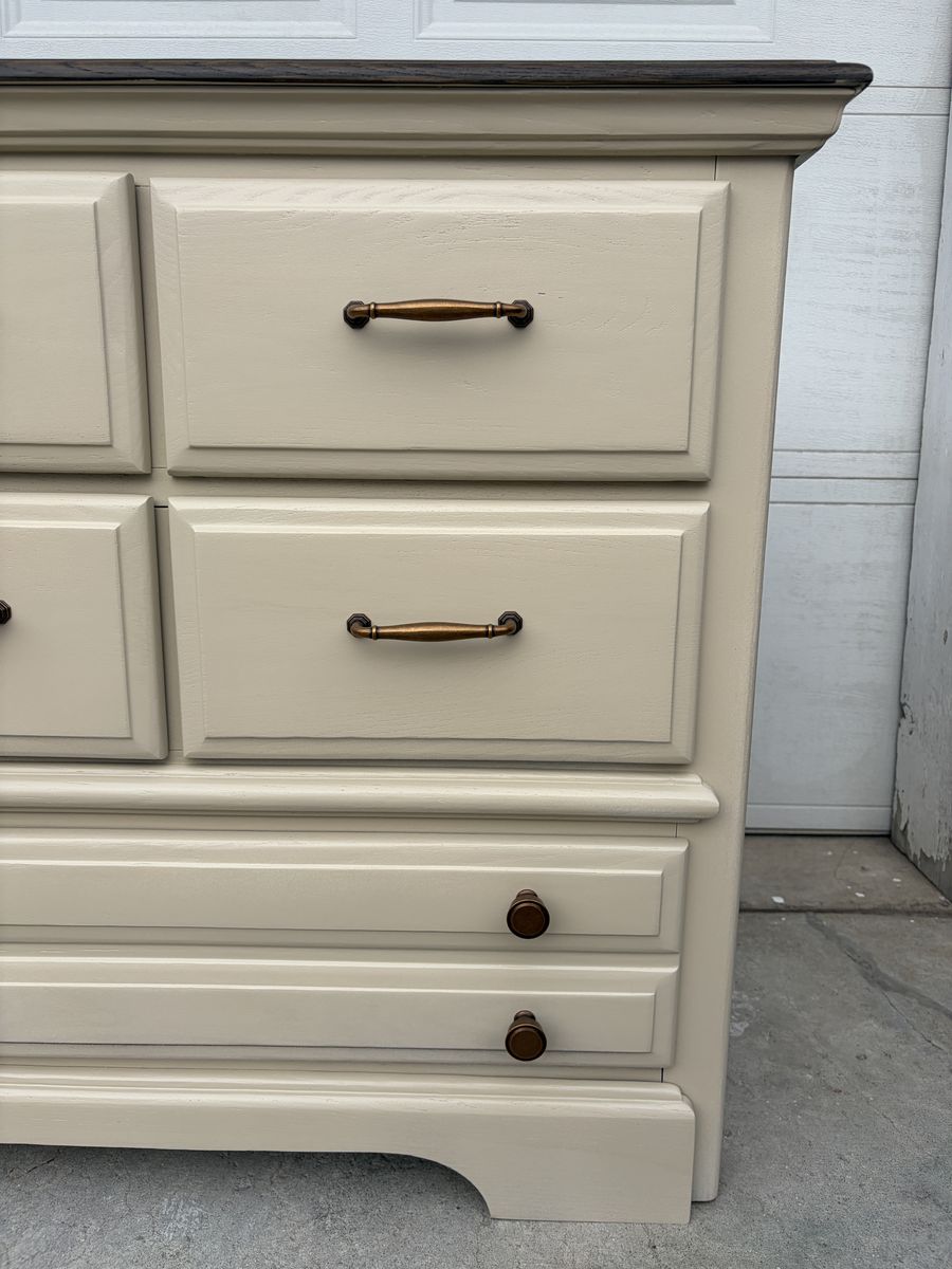 This gorgeous wide dresser by Athens Furniture has been completely transformed and is ready for its next home! Cream/linen finish with a stunning dark stained oak top and warm antique brass hardware — the perfect farmhouse-meets-classic combo.
