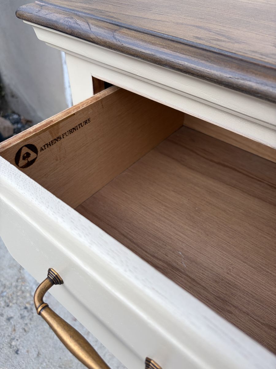 Athens Furniture is known for quality solid wood construction and this piece absolutely delivers. The two-tone cream and dark wood look is timeless and pairs beautifully with so many styles — farmhouse, cottage, transitional, you name it.