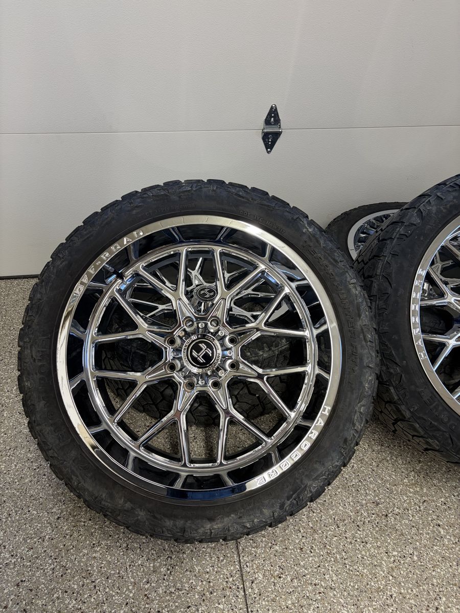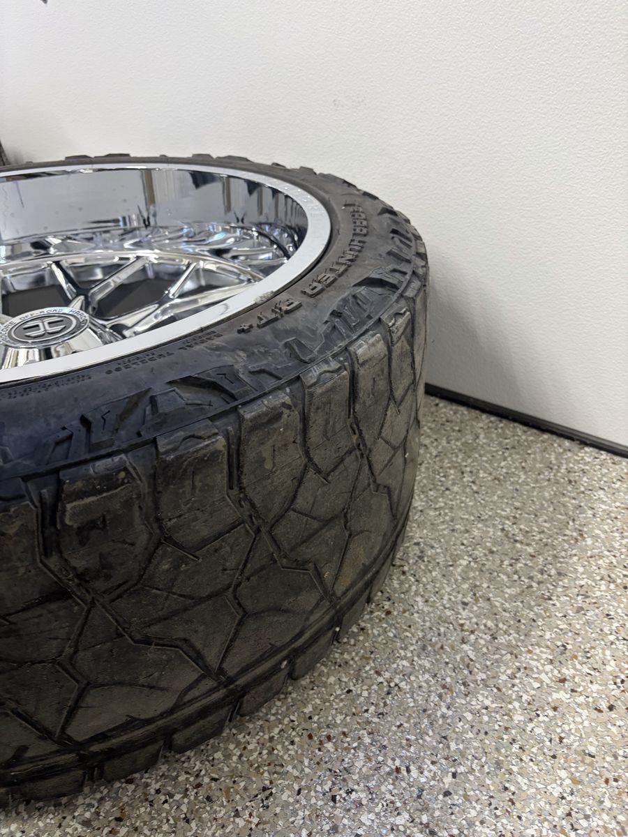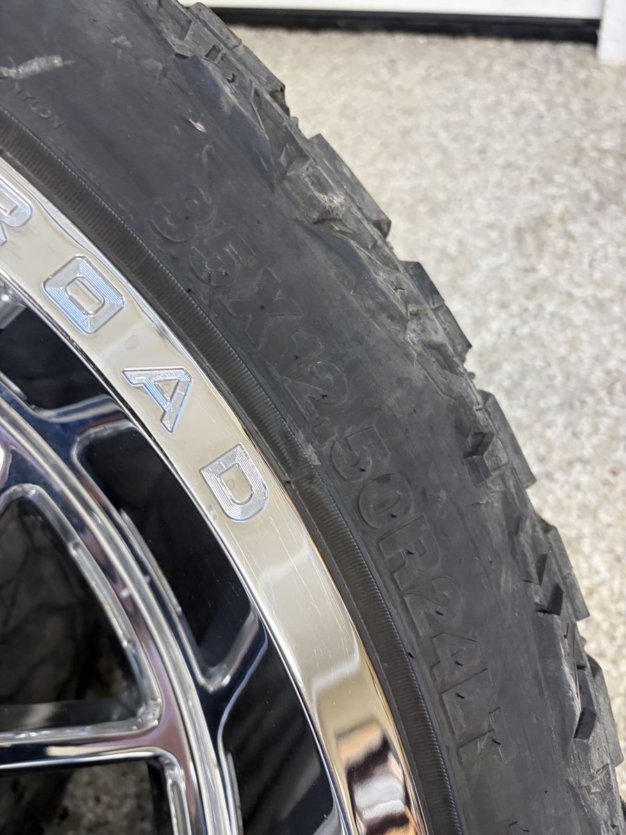 Selling this set of 24x12 8x180 hardcore wheels. Wheels are pretty clean they all do have minor curb rash I have a Picture of it in the add. Tires are 35/12.50 venom tires. 3 of them are in good shape with 50% tread left and the other one is pretty bald. Can put new tires on if you want.