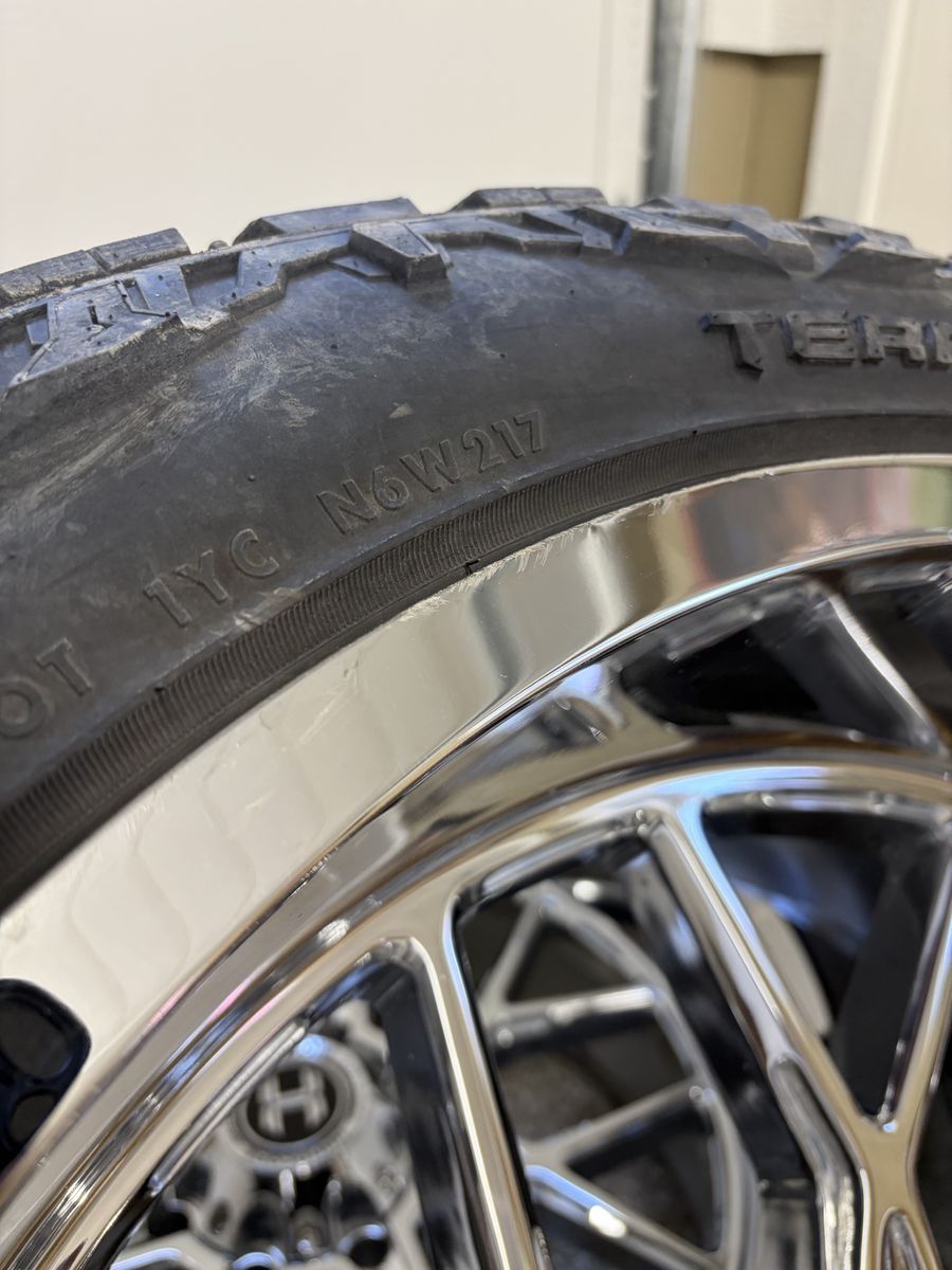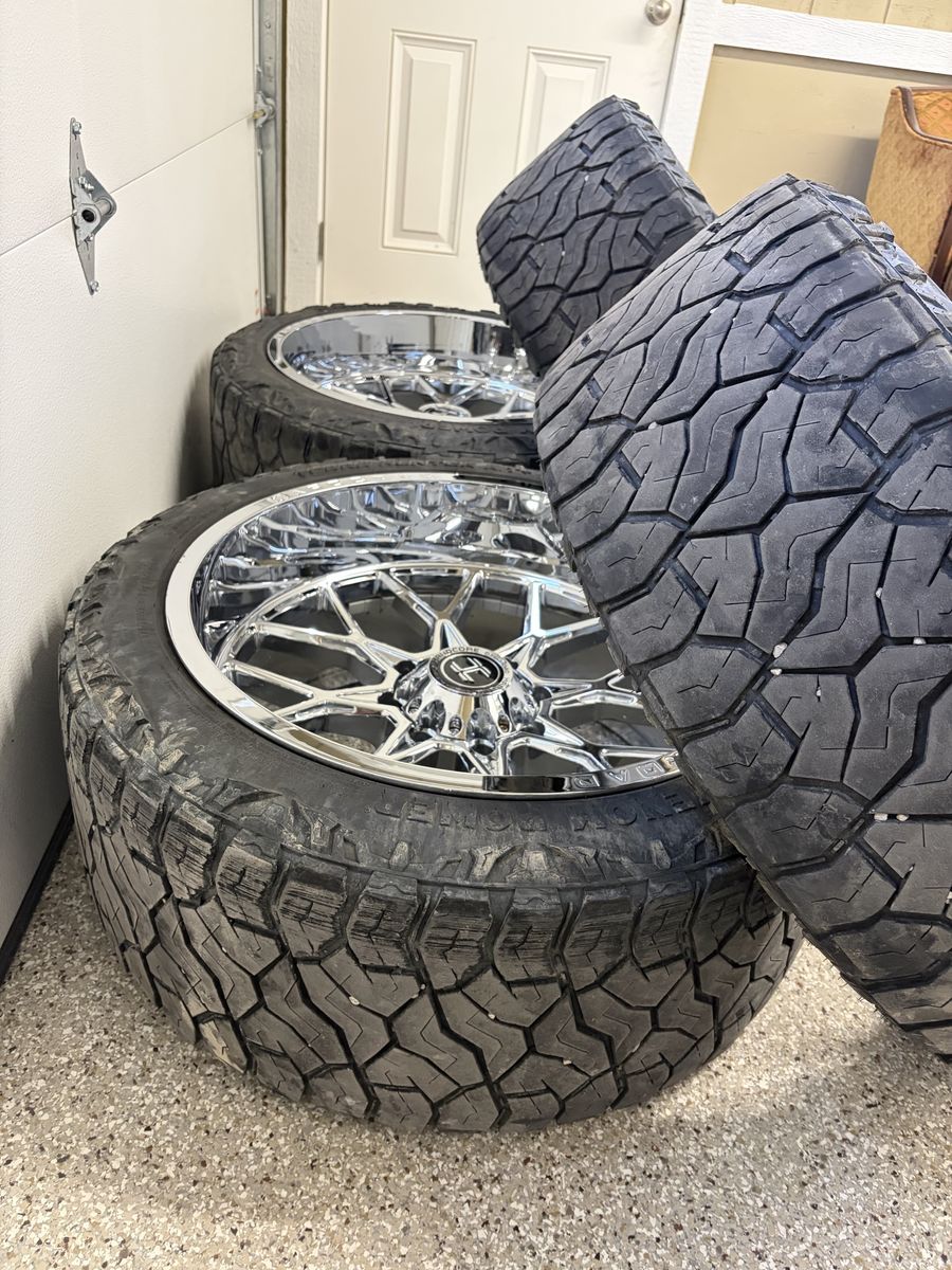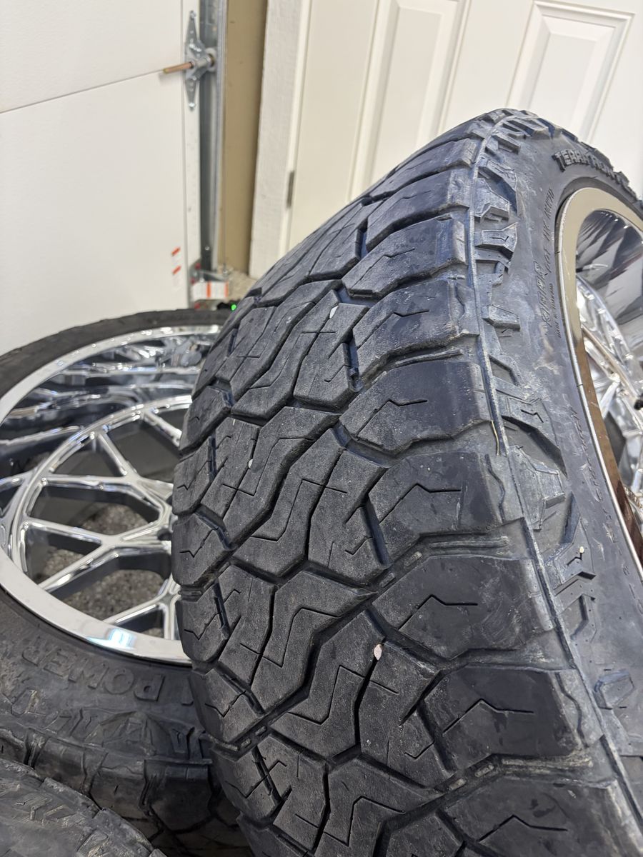 Selling this set of 24x12 8x180 hardcore wheels. Wheels are pretty clean they all do have minor curb rash I have a Picture of it in the add. Tires are 35/12.50 venom tires. 3 of them are in good shape with 50% tread left and the other one is pretty bald. Can put new tires on if you want.