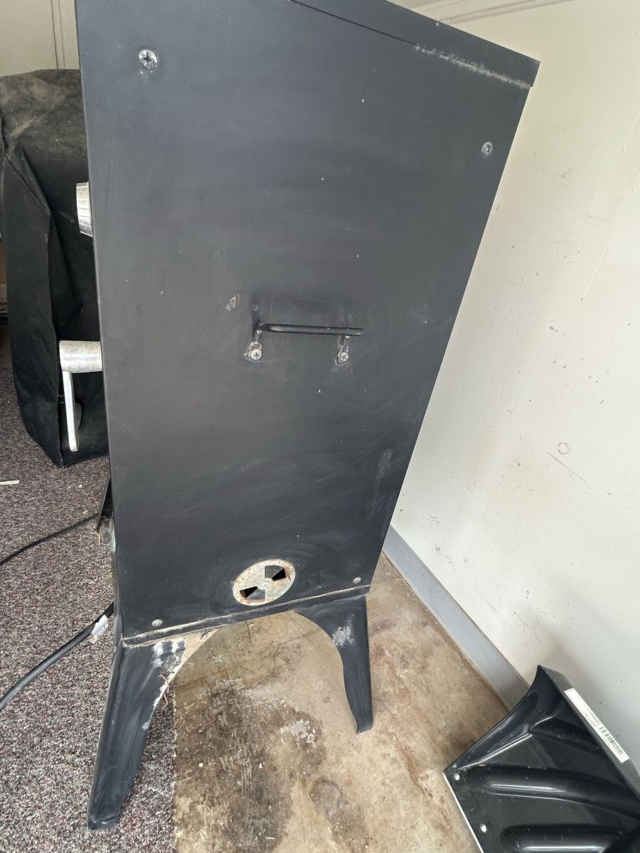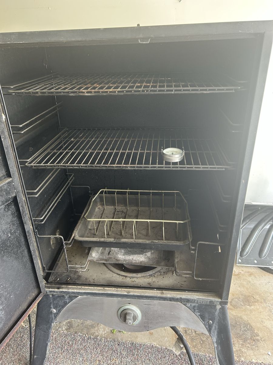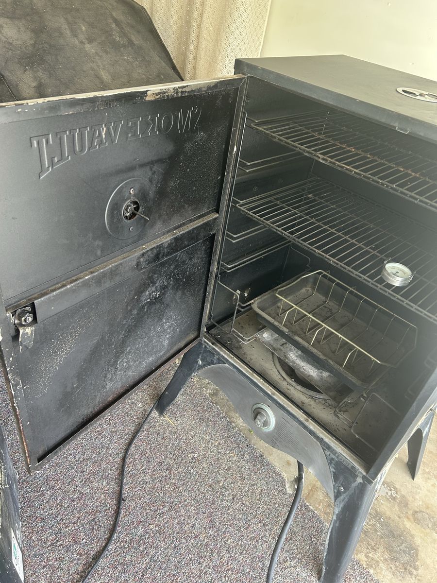 ZelleCamp Chef Smoke Vault smoker. Has a thermometer on the door and inside. Comes with multiple racks and a roasting pan. Works with propane. OBO.