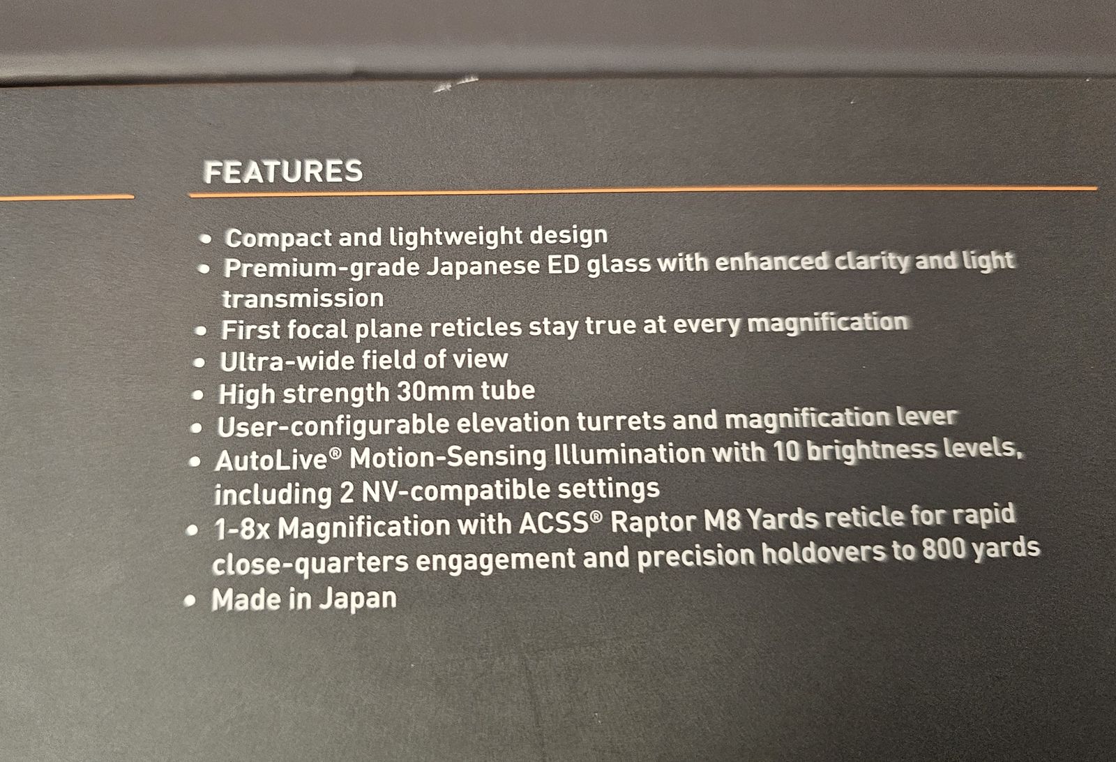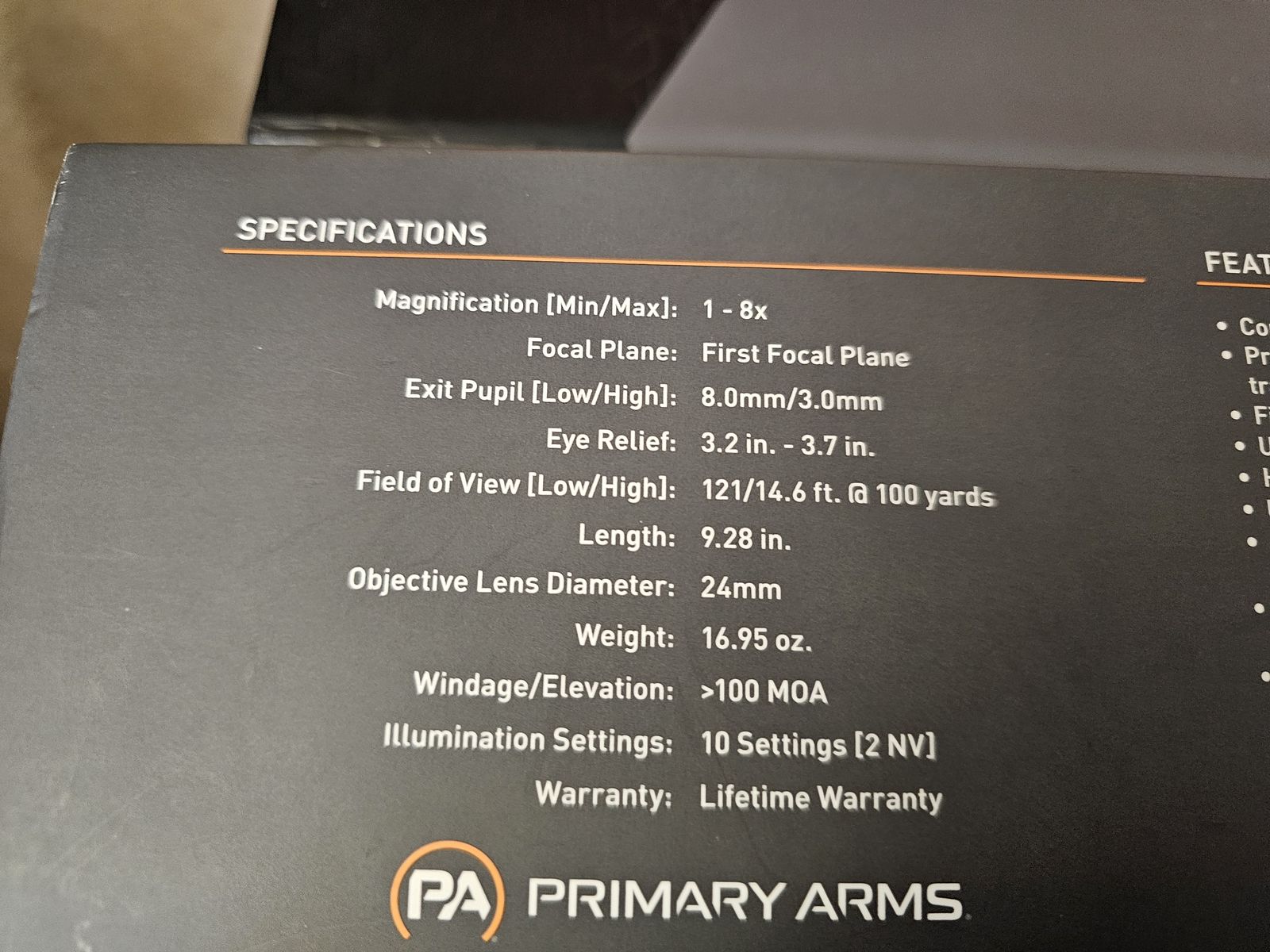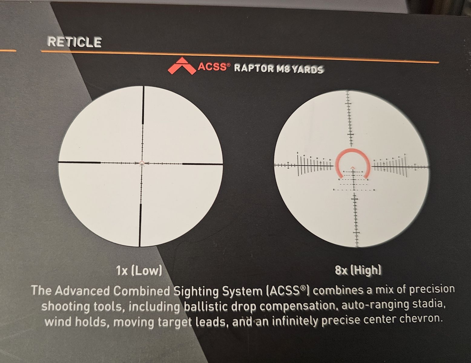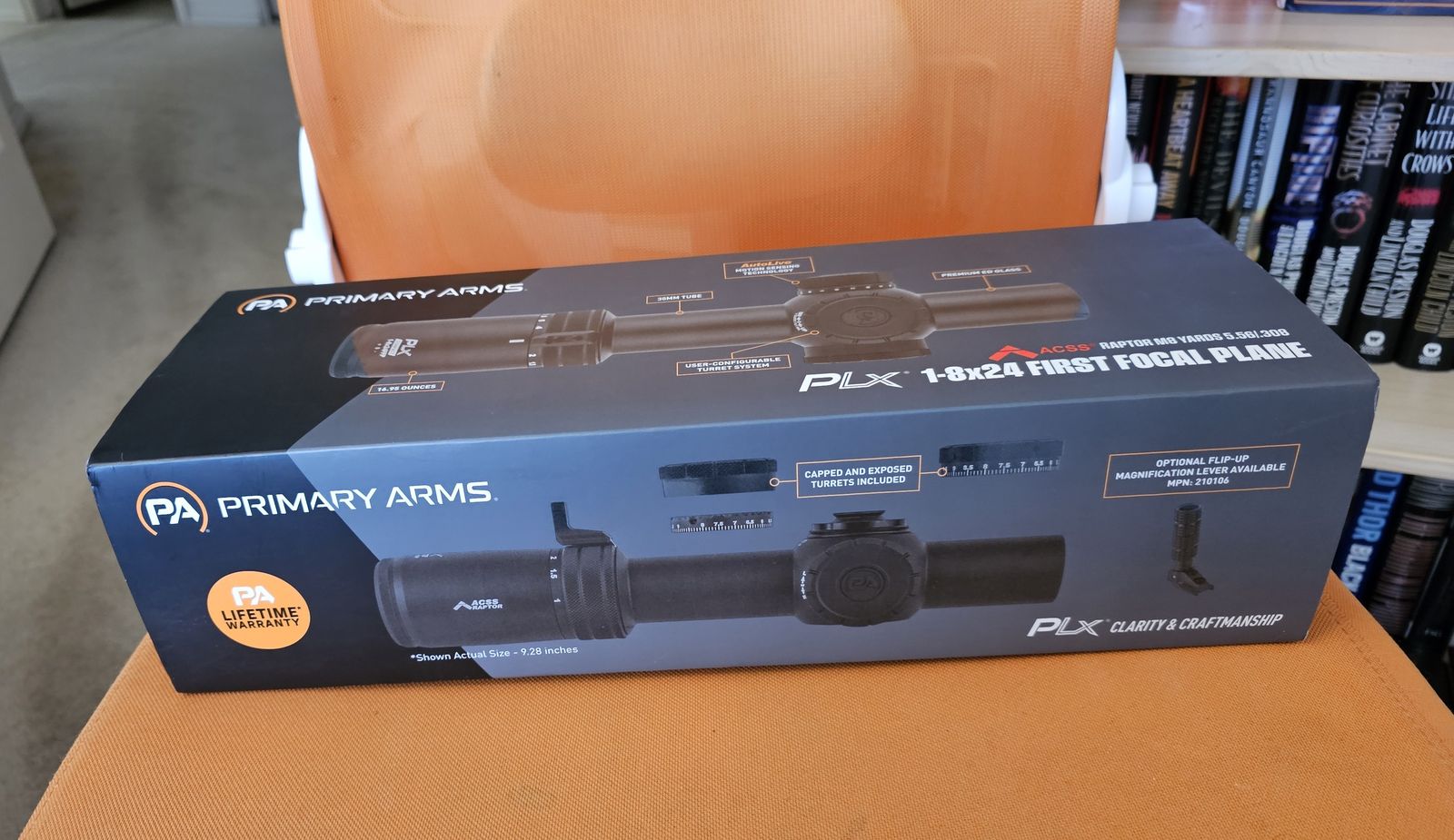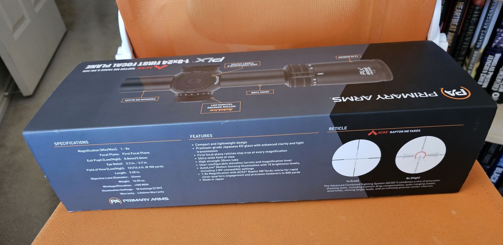 ZelleFor sale is a PrimaryArms PLX 1-8X24 First Focal Plane ACSS Raptor M8 5.56/.308 rifle scope. This scope was mounted on an AR for taking pictures only, it has never been on a rifle that was fired or even been outdoors. This scope is PrimaryArms' top of the line and has amazing glass that has to be seen to be fully appreciated. My son is an engineer for PrimaryArms and was on the design team for this scope. Ask me about the insane testing done on these scopes to insure ruggedness. The list price on these scopes on the PrimaryArms website is $1,499.99. I'm asking $650. I'm also including a Scope Coat, a magnification lever, and 2 spare batteries.