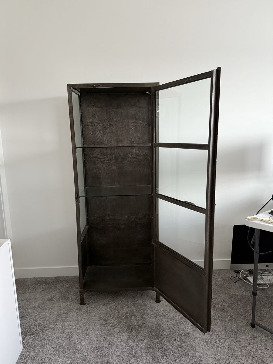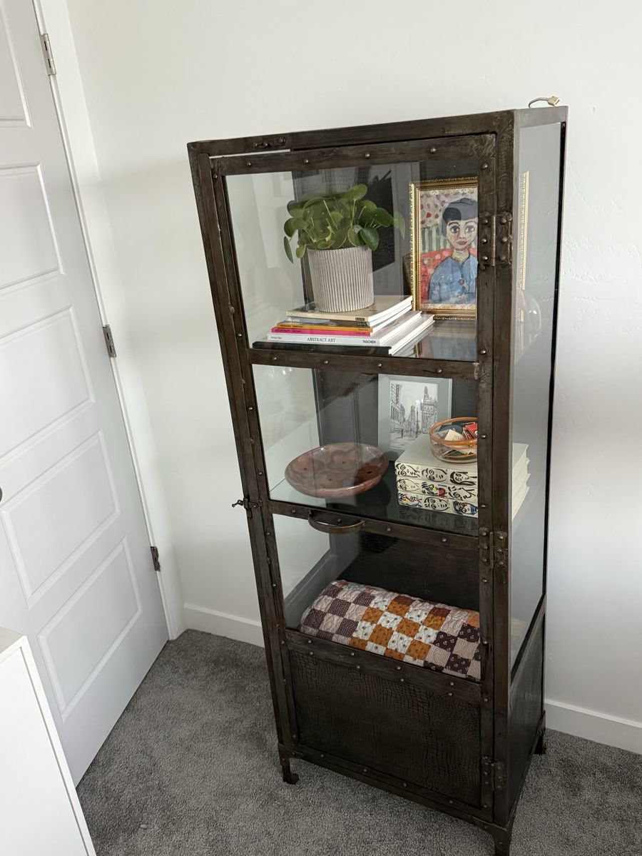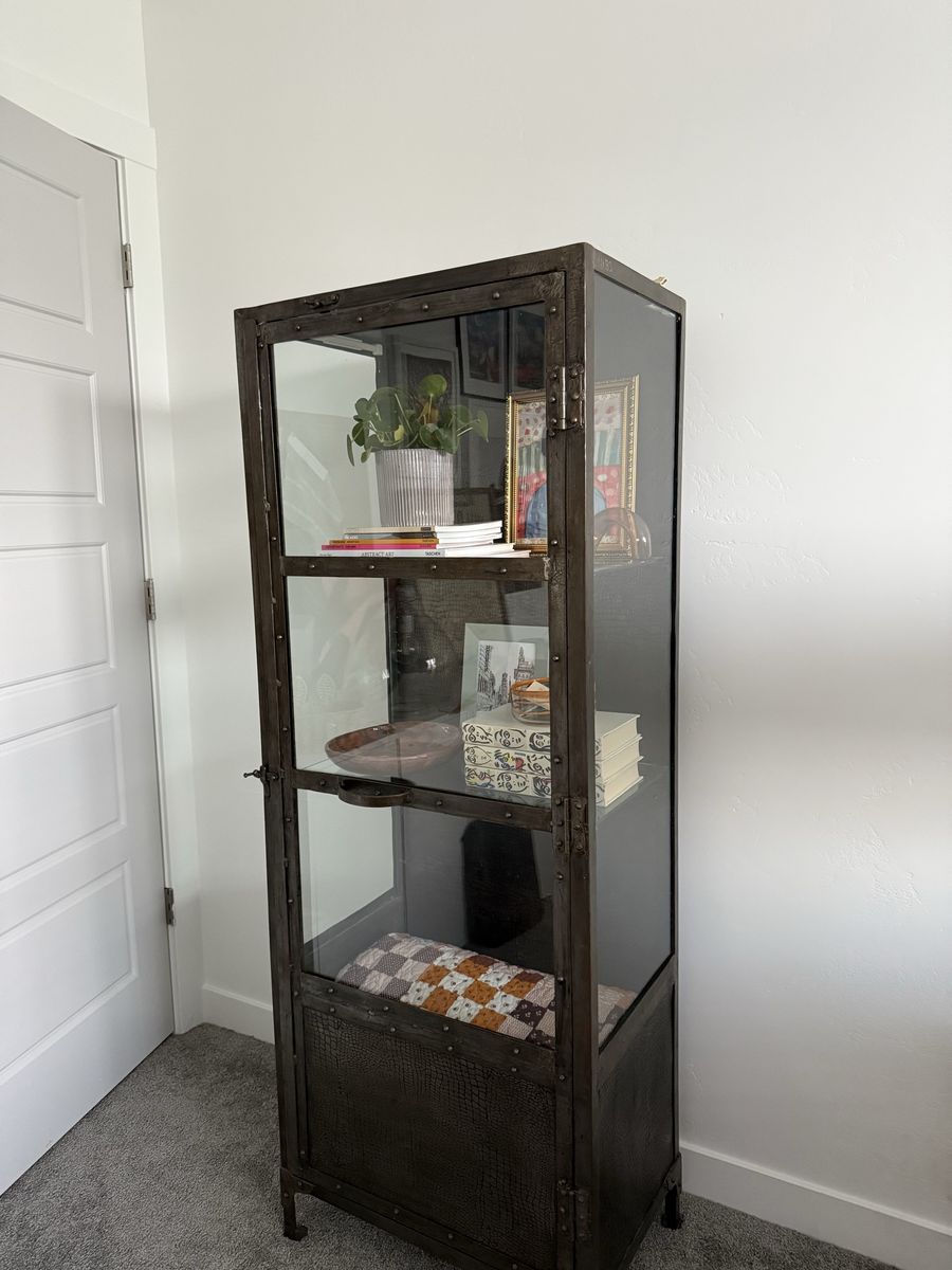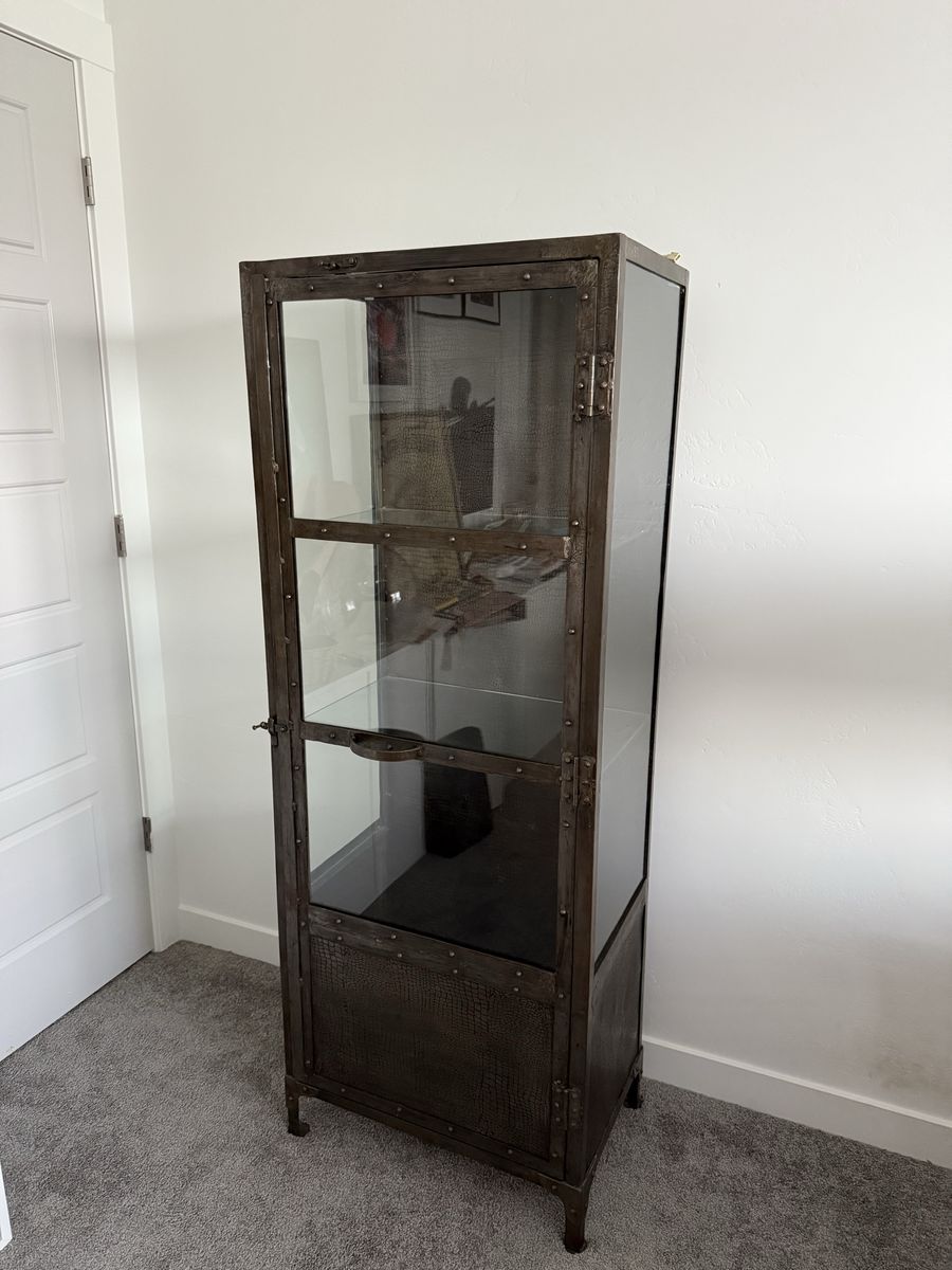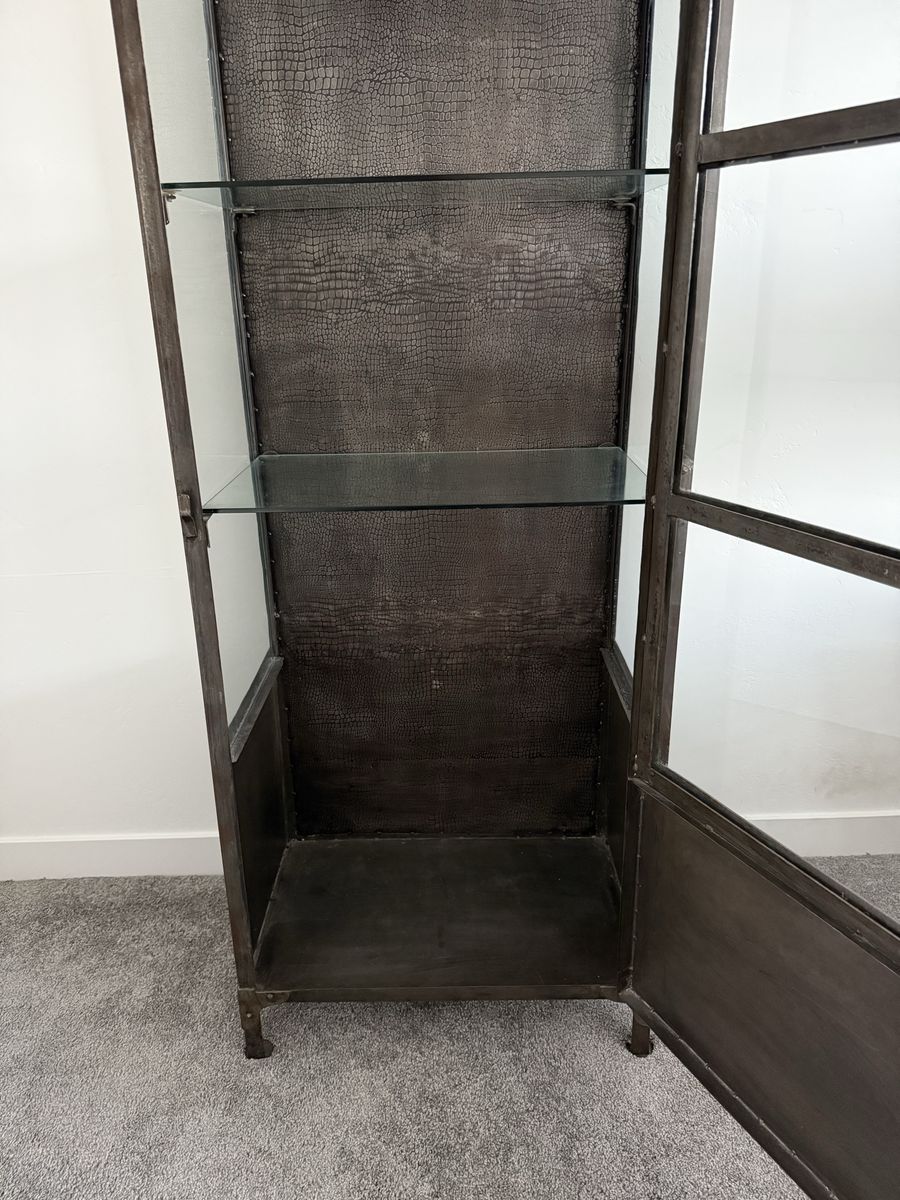 ApplePayVintage industrial metal and glass display cabinet with a shagreen (crocodile-embossed) back panel, riveted steel frame, and three-sided glass with two interior shelves. In excellent condition with an intentional distressed finish. Very heavy,solid metal and glass. There is a lighting feature at the top of the cabinet I have never plugged in. See cord in the photos. 23 1/2” wide 63 3/4” tall 15 1/4” depth