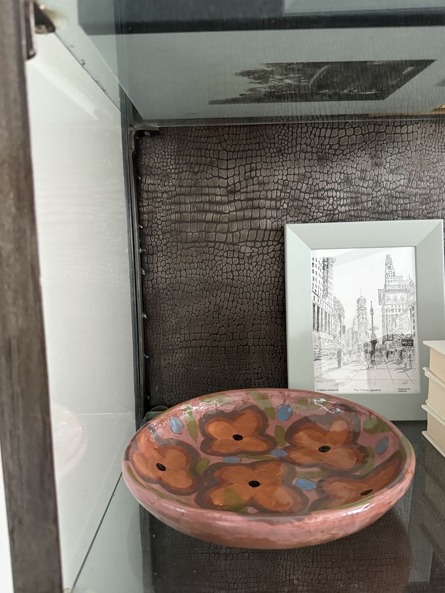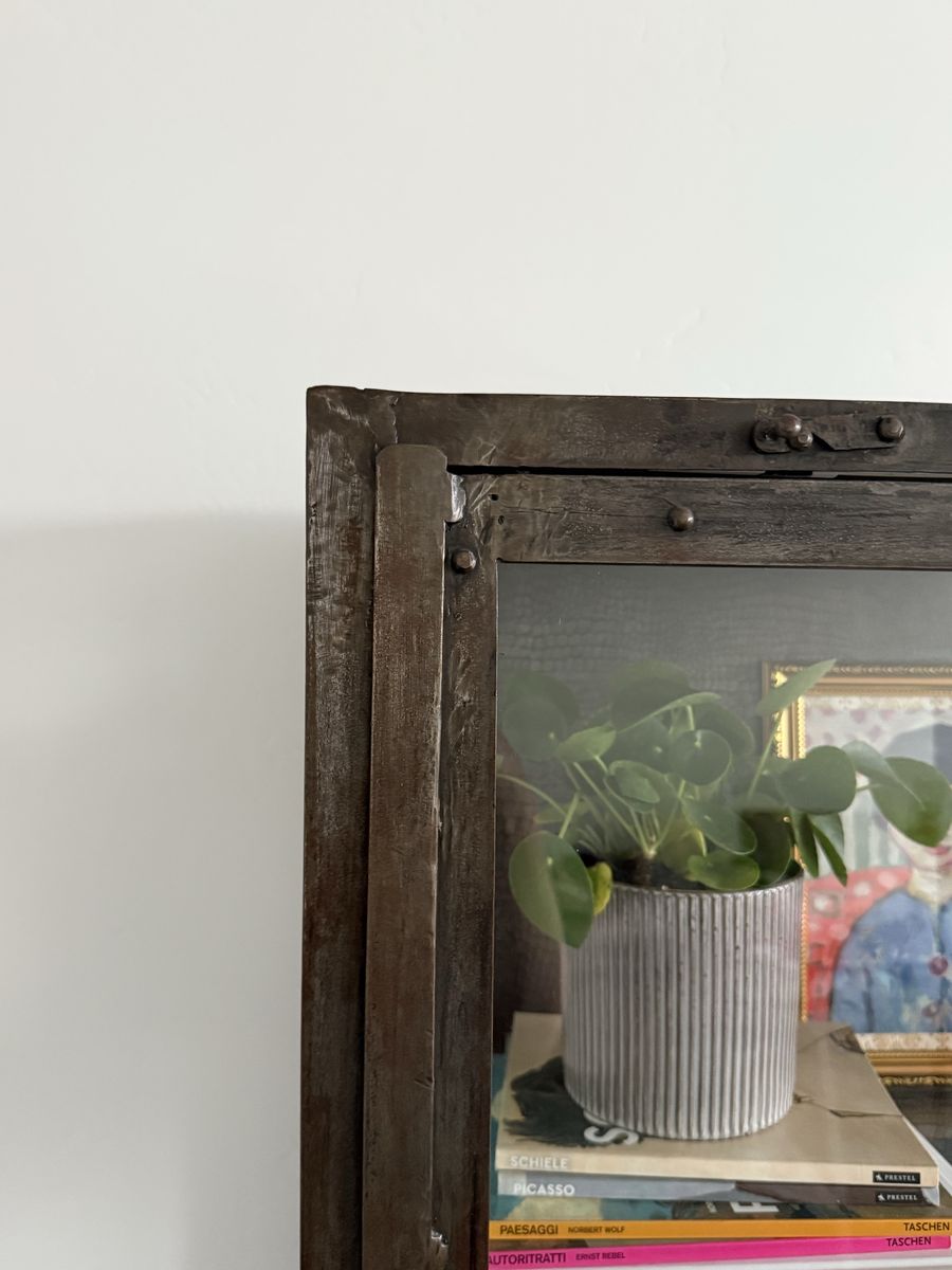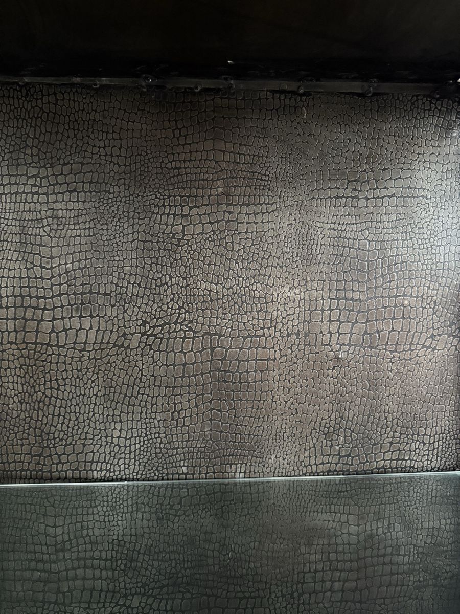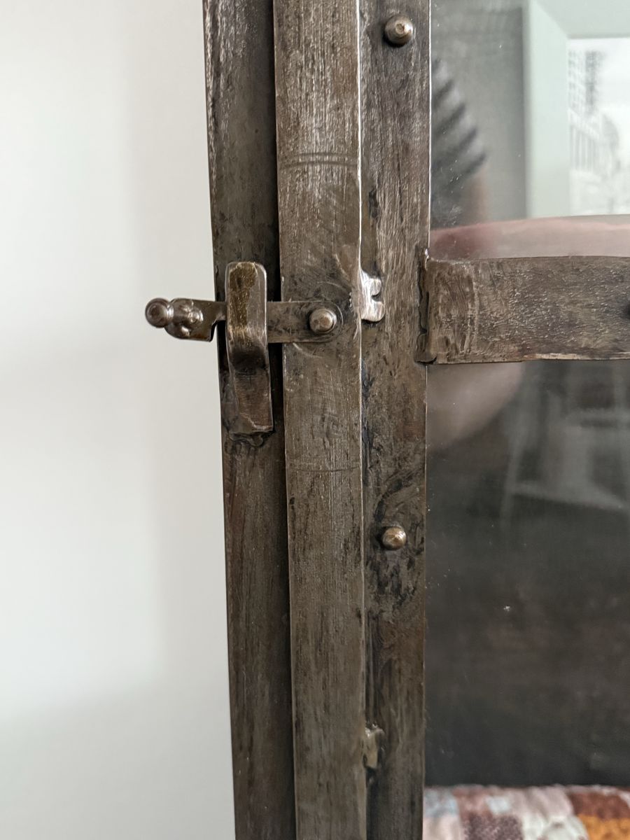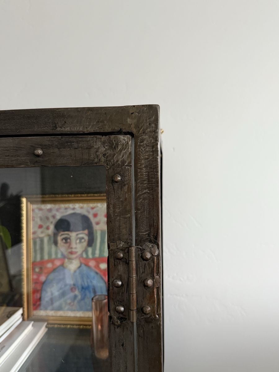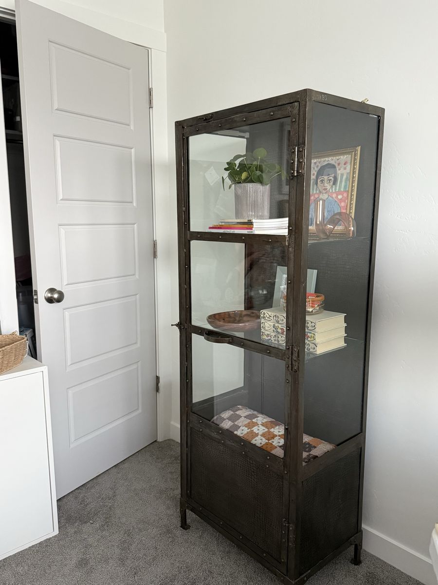 ApplePayVintage industrial metal and glass display cabinet with a shagreen (crocodile-embossed) back panel, riveted steel frame, and three-sided glass with two interior shelves. In excellent condition with an intentional distressed finish. Very heavy,solid metal and glass. There is a lighting feature at the top of the cabinet I have never plugged in. See cord in the photos. 23 1/2” wide 63 3/4” tall 15 1/4” depth