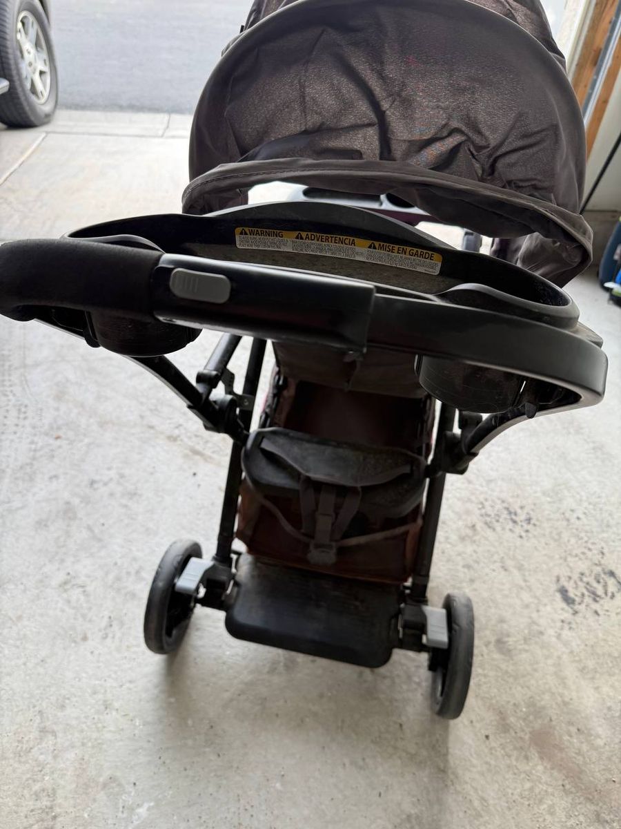 Used Baby Trend stroller in pink and gray. Stroller only, no car seat included. Includes canopy, child tray, parent tray, basket, and harness as shown. Dusty from storage with normal cosmetic wear. Pickup in Lehi.