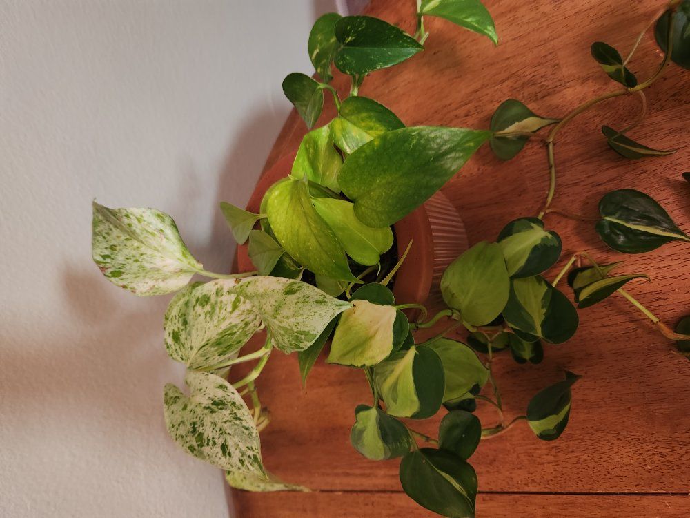 Philodendron Brasil, marble quest pothos and golden pothos breeds in one pot together. Pot is roughly 6.5 inches.