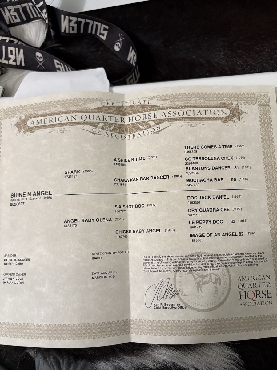 Really nice, papered, 11 year old buckskin mare. 15 hands. I got a nice buckskin colt from her last year, pictured. I am selling her as broodmare sound only because I don’t have her exact diagnosis. She is not consistently lame and I believe it is something that can be fixed. She is awesome for the farrier and vaccinations! This is a great horse in so many ways. I am sad to rehome her but just am not a horse breeder. She replaced one I lost and I cannot keep them all. I will only consider offers on serious buyers. Call or text.