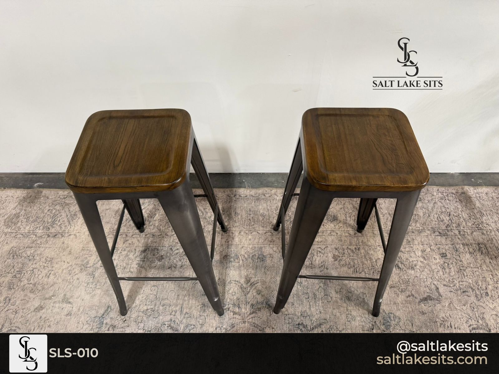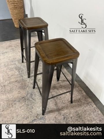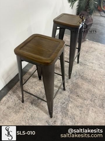 Set of 2 Industrial Bar Stools β Gunmetal metal frame with warm wood top seats. Clean, classic industrial look that works in any kitchen or bar area. Good condition. Dimensions in photos.