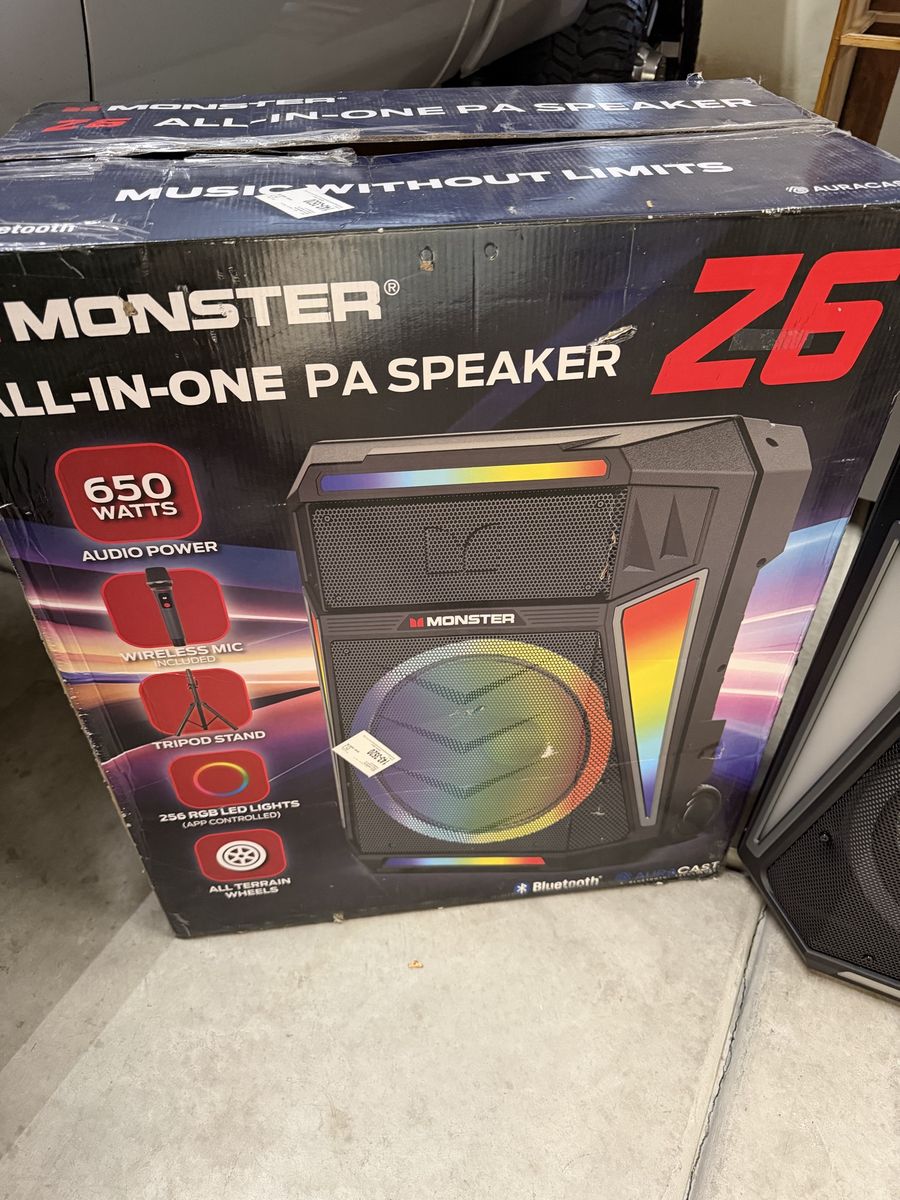ApplePayBrand new Monster Z6 speaker I bought to use and thought it had internal battery to use at ball games. Only works when plugged in. Just been pulled out of the box to listen to one time until I realized that I can’t use it where I wanted. Has a stand and microphone for Karaoke. My loss is your gain.