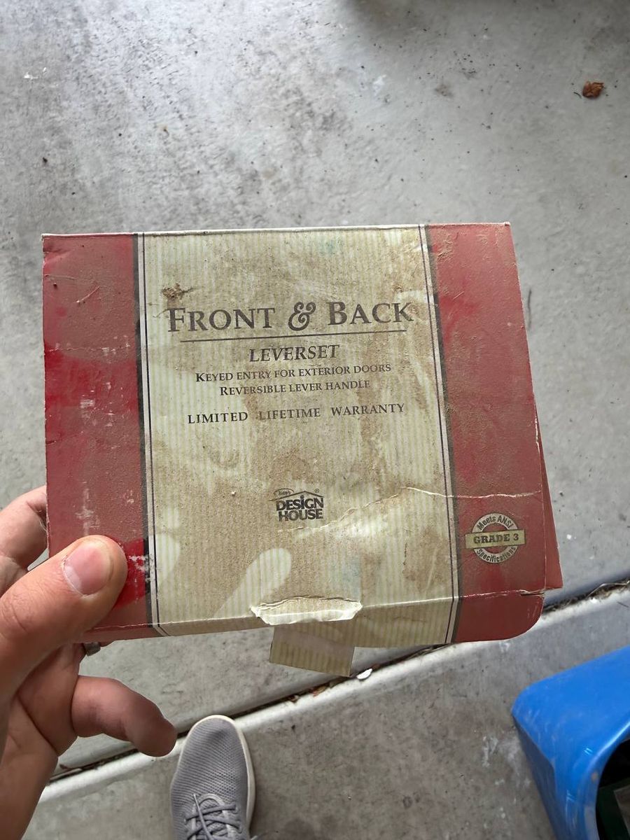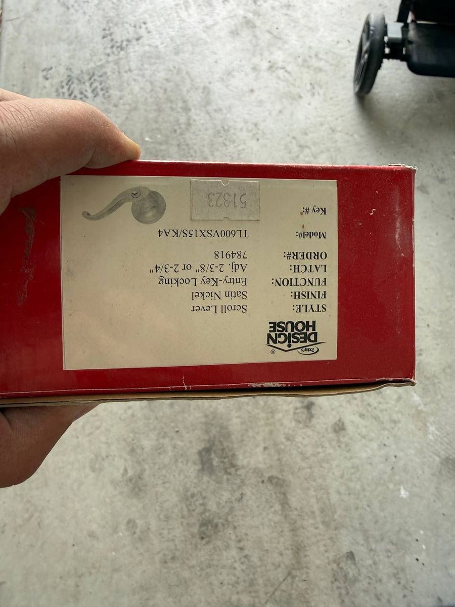 Design House scroll lever front and back keyed entry set in satin nickel for exterior doors. Box label shows entry-key locking function and model TL600VSX15S/KA4. Box has dust and shelf wear from storage. Selling as-is. Pickup in Lehi.