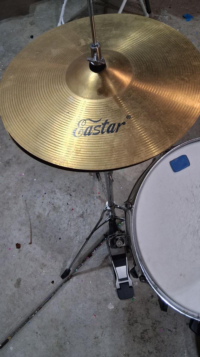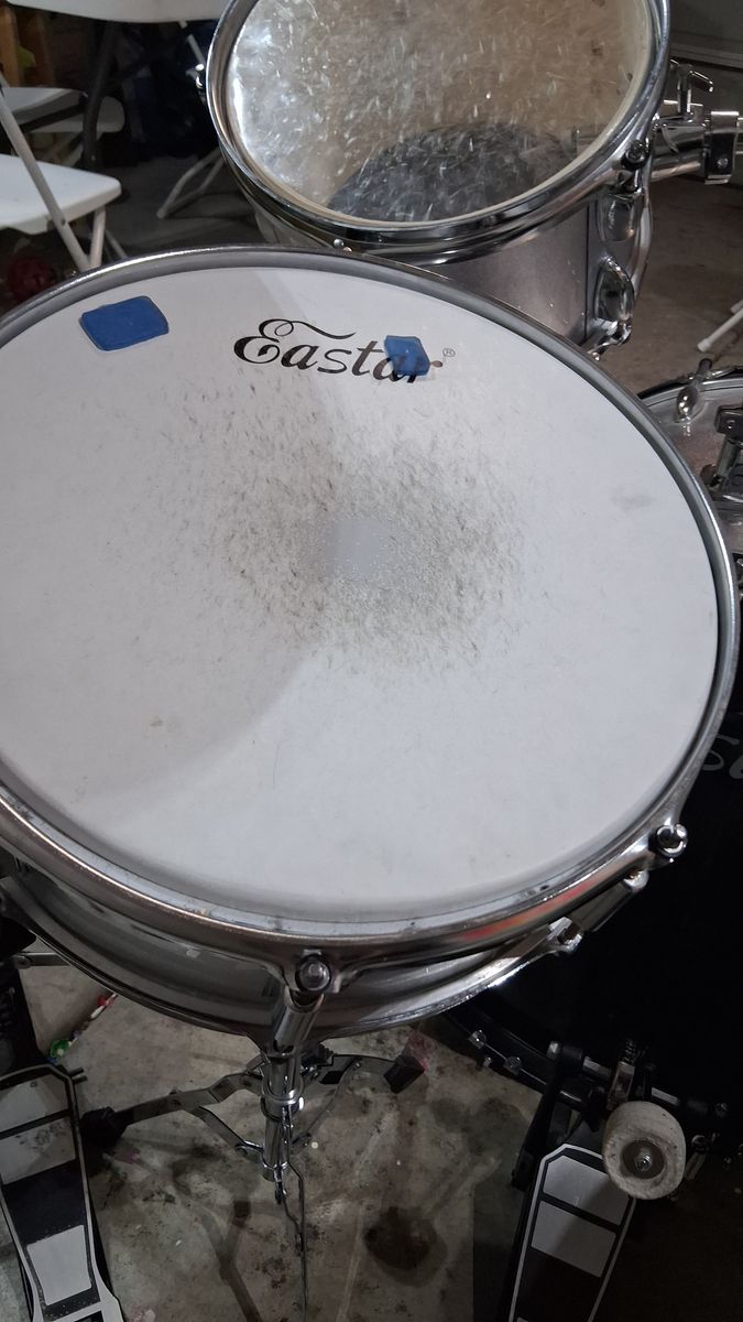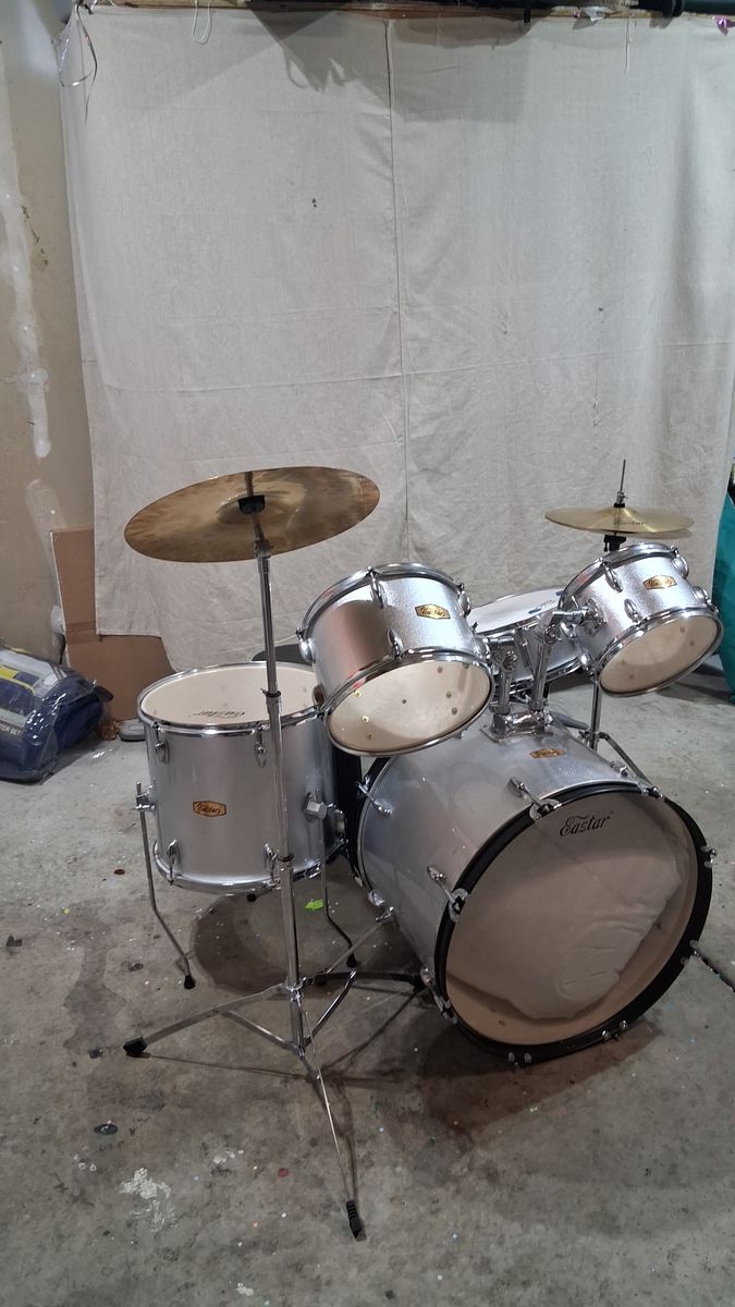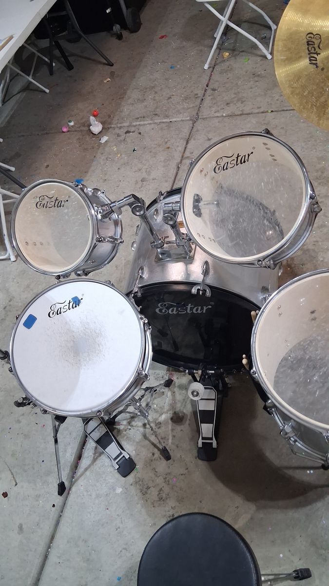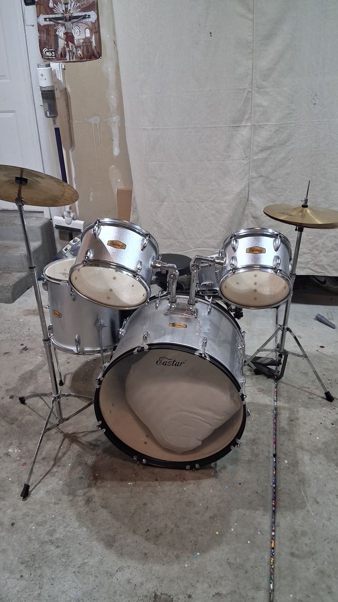 ZelleEastar drumset, silver. Has all 3 toms, bass drum, crash, high hat, and snare drum. Good condition. Toms need to be tuned. Needs a little TLC
