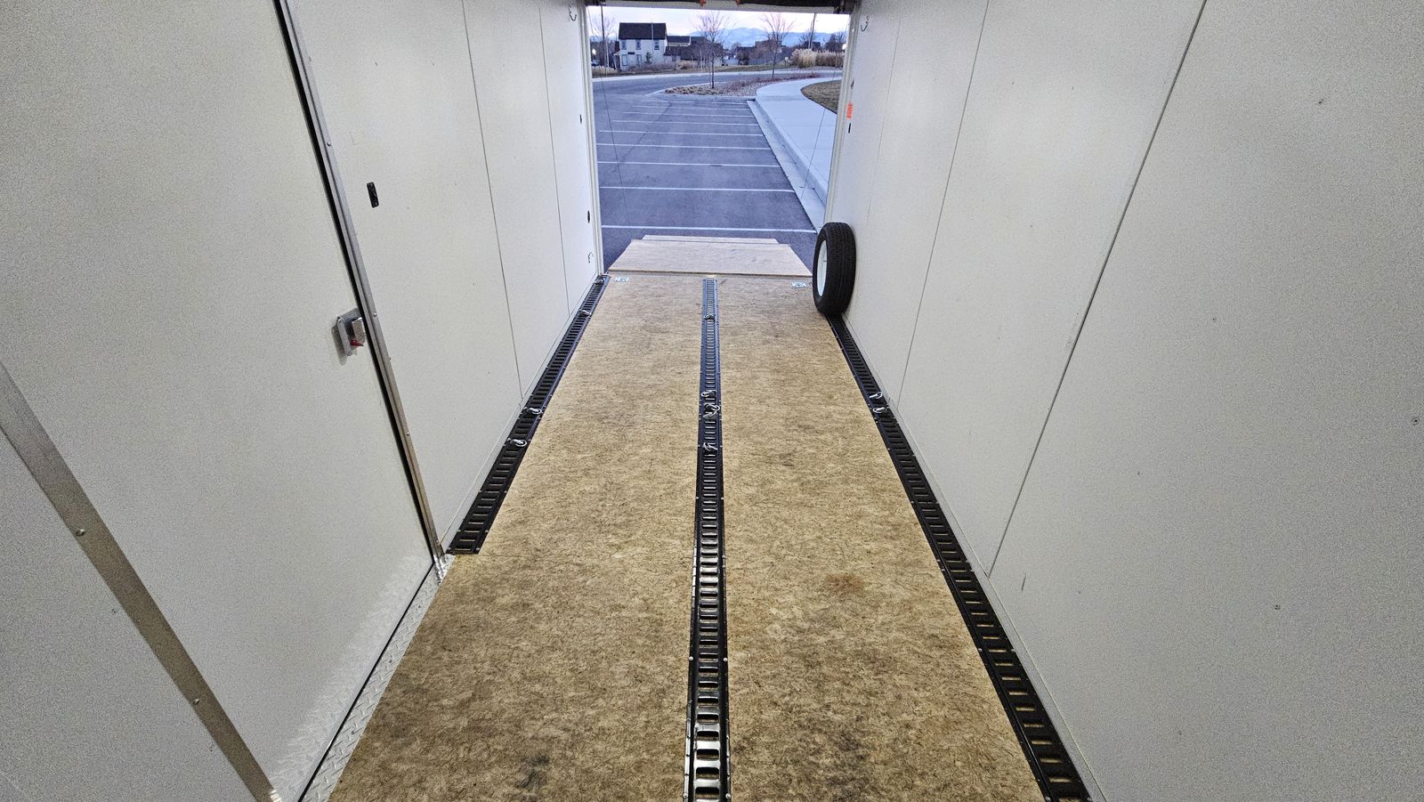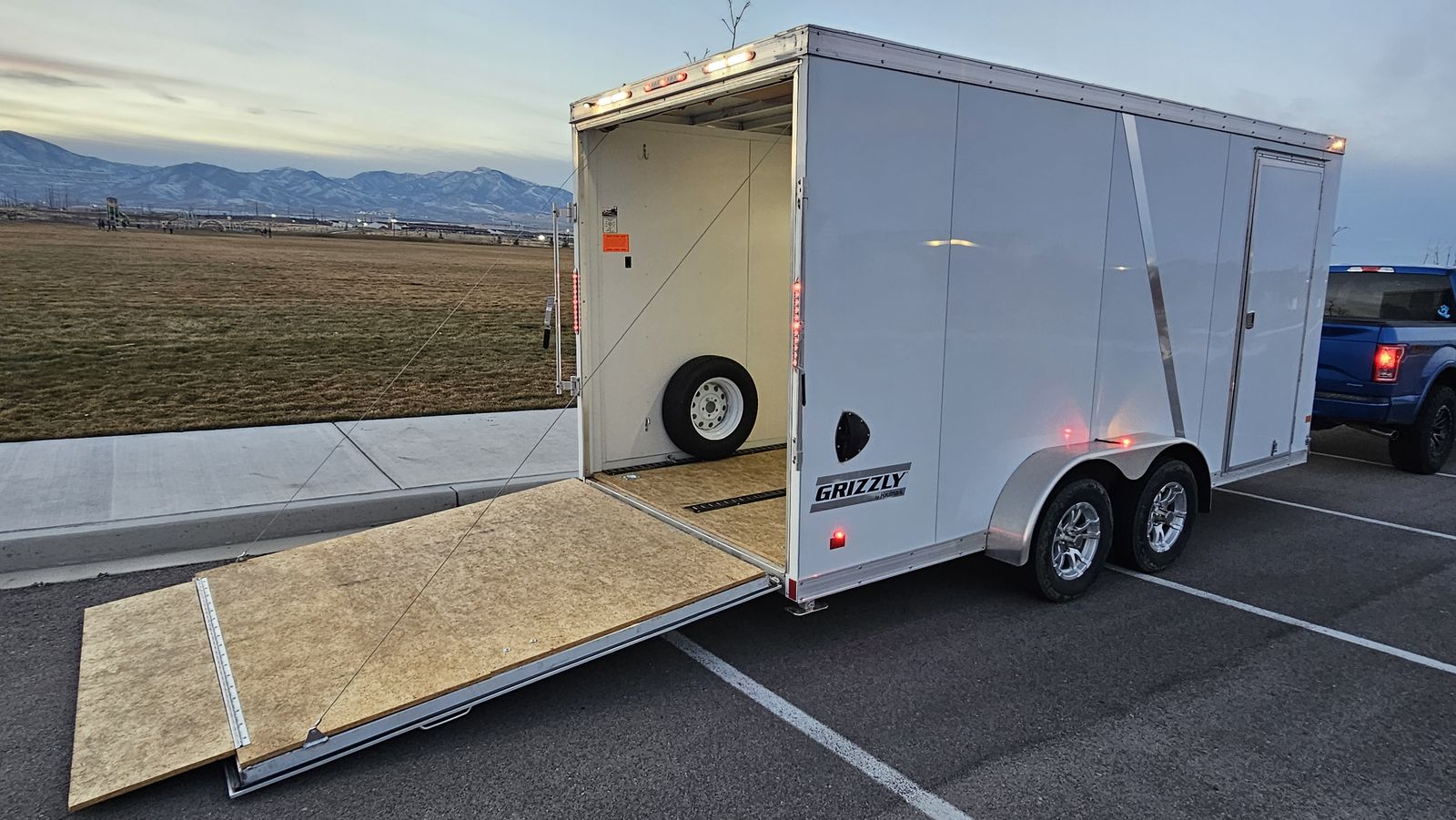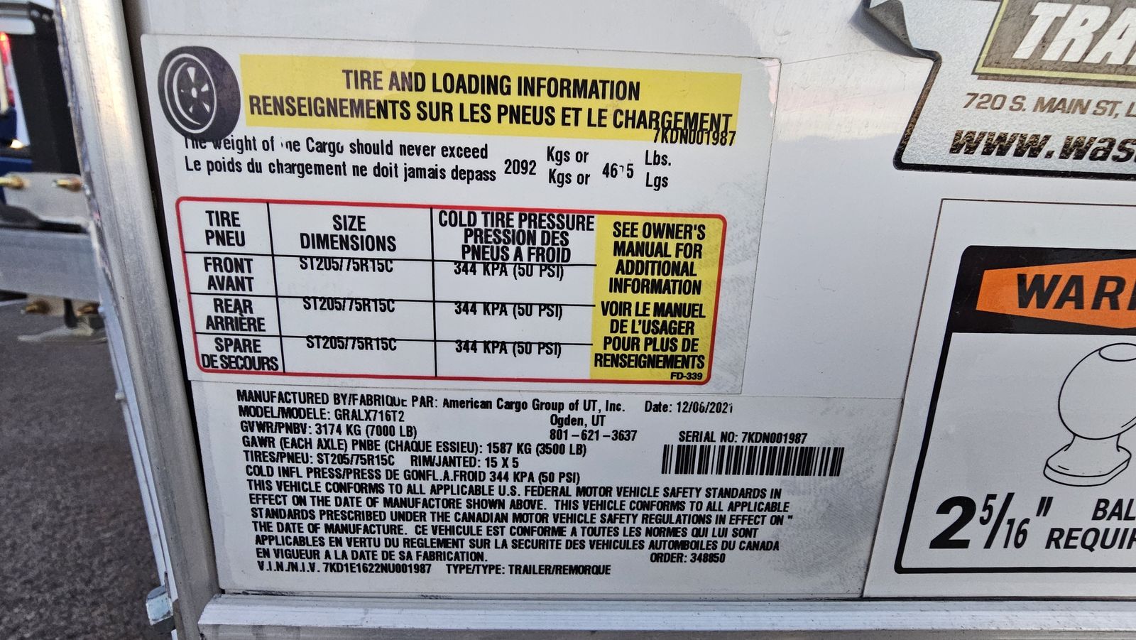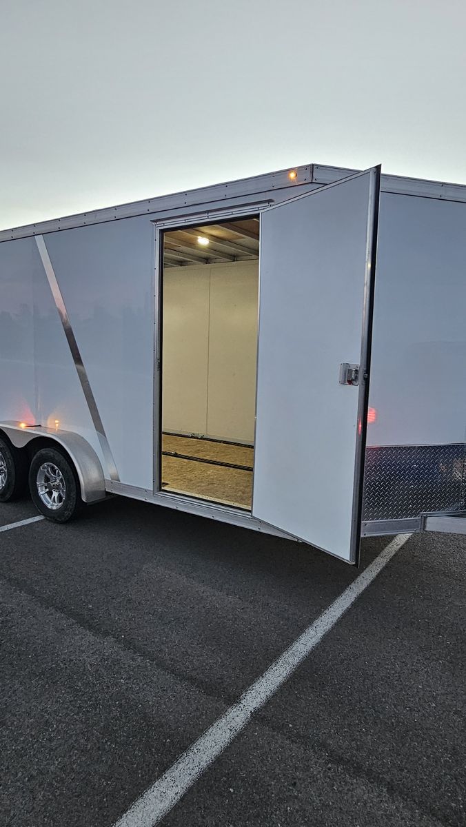 7-foot wide by 16-foot long tandem axle (T2) trailer with a lightweight aluminum frame. 36" wide premium side door with flush lock and a rear ramp door. 3/4" PlexCore high-performance decking, which is designed to be more durable than standard plywood. 12V LED exterior and interior dome lights. 3 rows of E-track included, plus some extra track we have not installed yet. 1/2 ton towable.