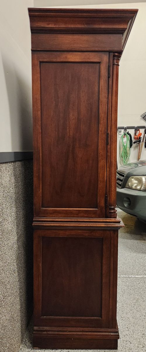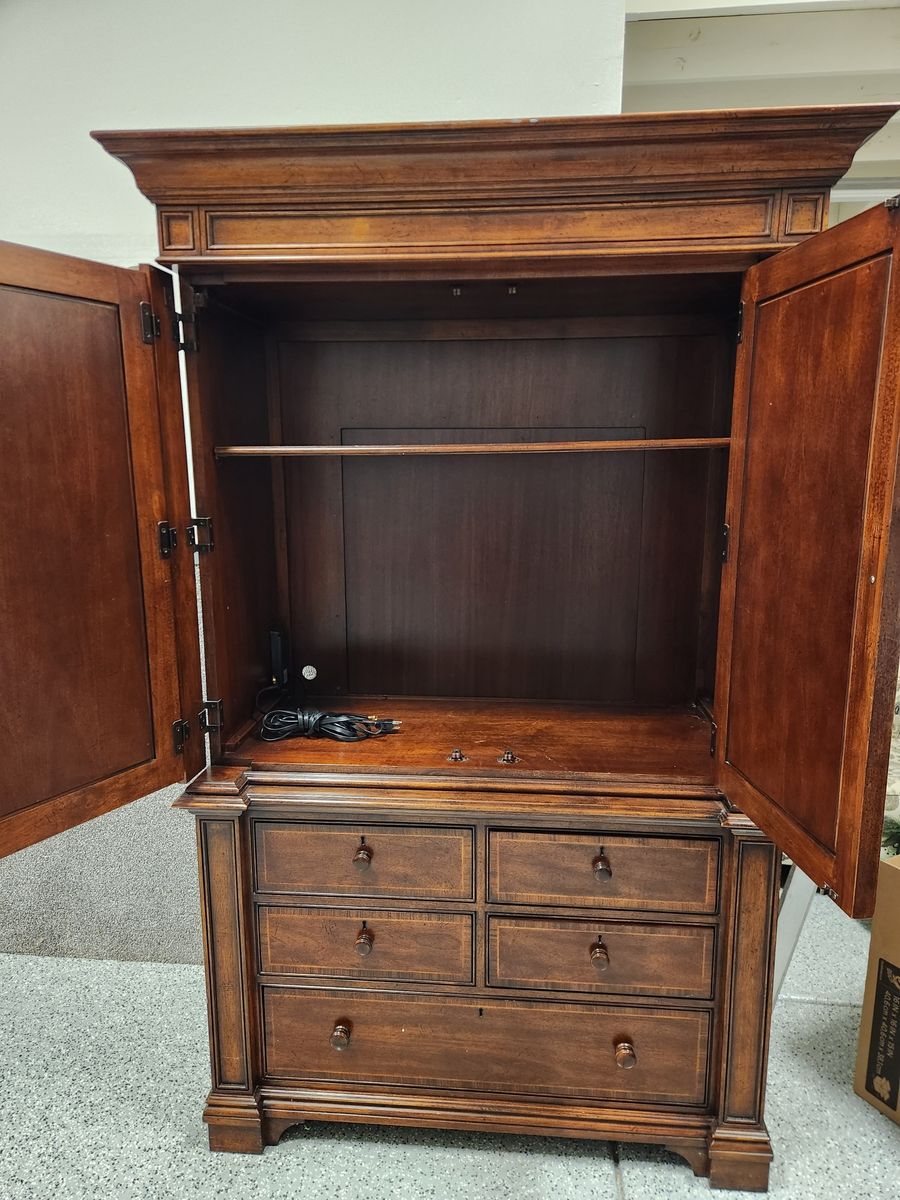 VenmoThomasville Frederickburg Mahogany Double Door, 5 Drawer Armoire, 78"h x 48"w x 23"d. Four Drawers,18"w x 6"h, one drawer 36"w x 9" h. One upper removable Shelf for TV access. Includes recessed in cabinet power and data outlet.