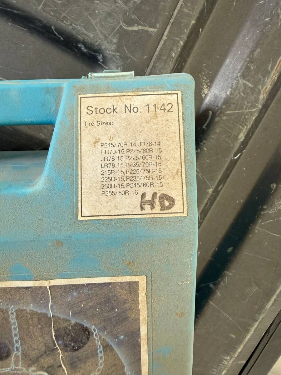 Used Quik Grip tire chains in blue hard case, stock no. 1142. Label shows fitment for multiple tire sizes including P225/60R15, P235/70R15, P225/75R15, P235/75R15, P245/60R15, and P255/50R16. Case shows age and wear as shown. Selling as-is. Pickup in Lehi.