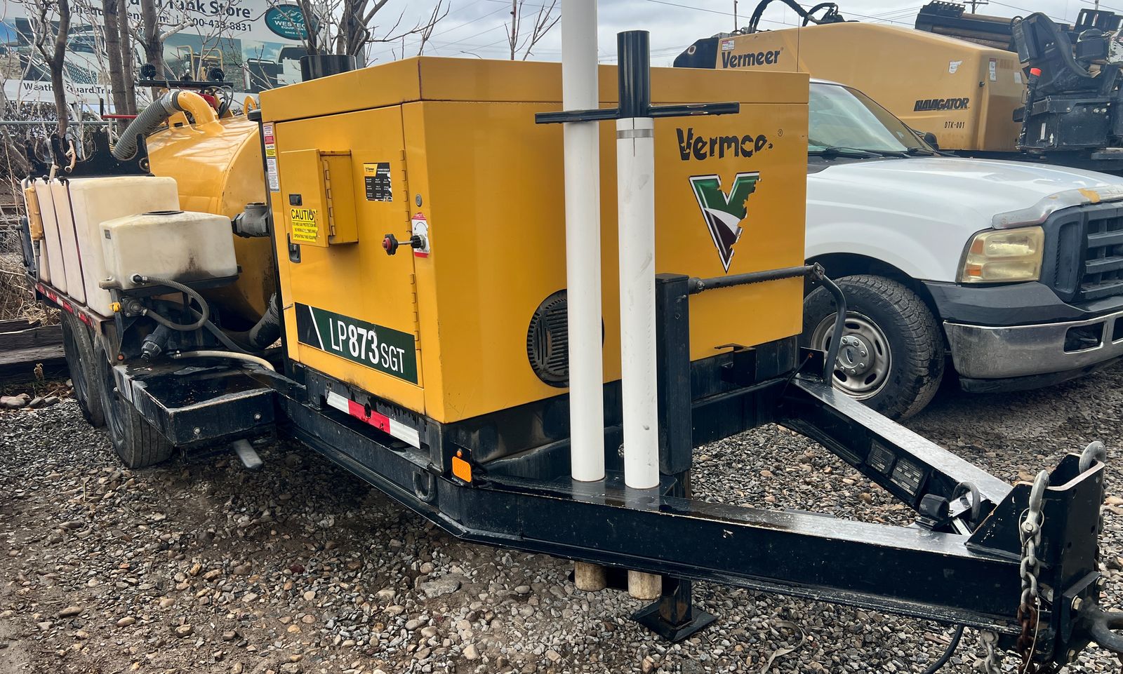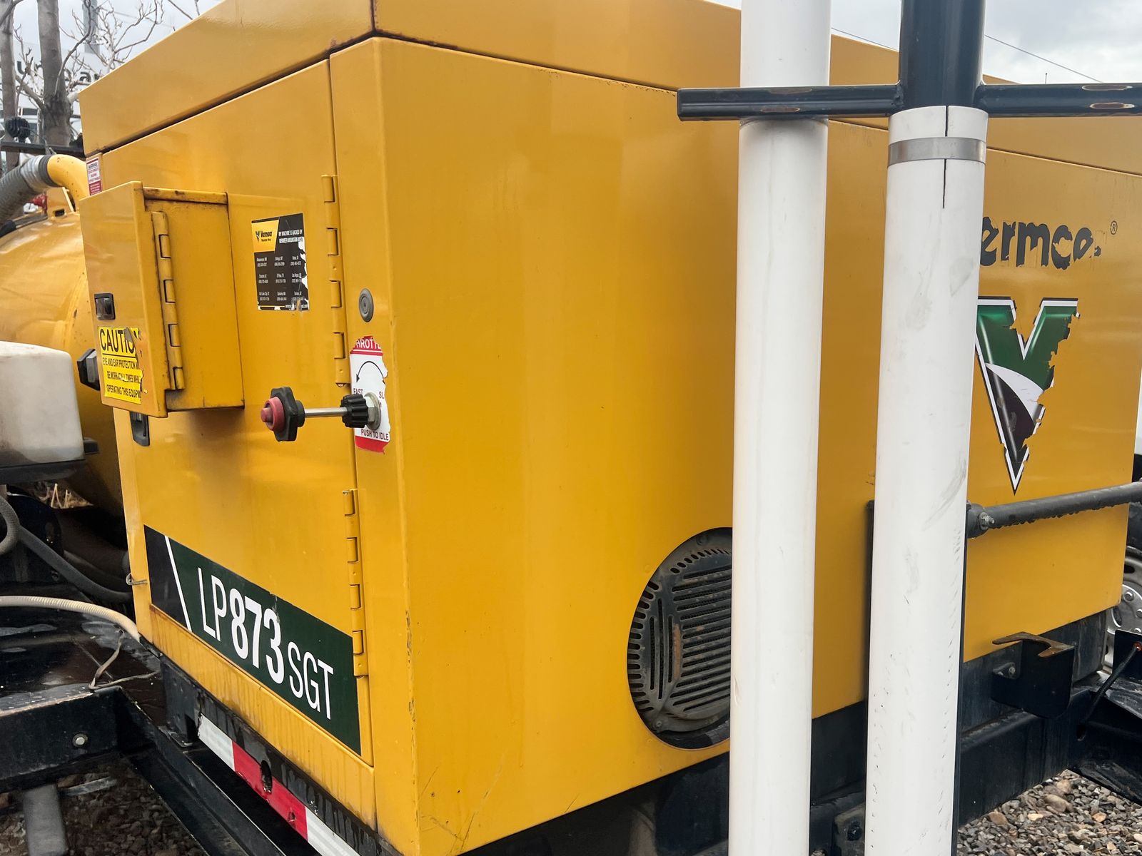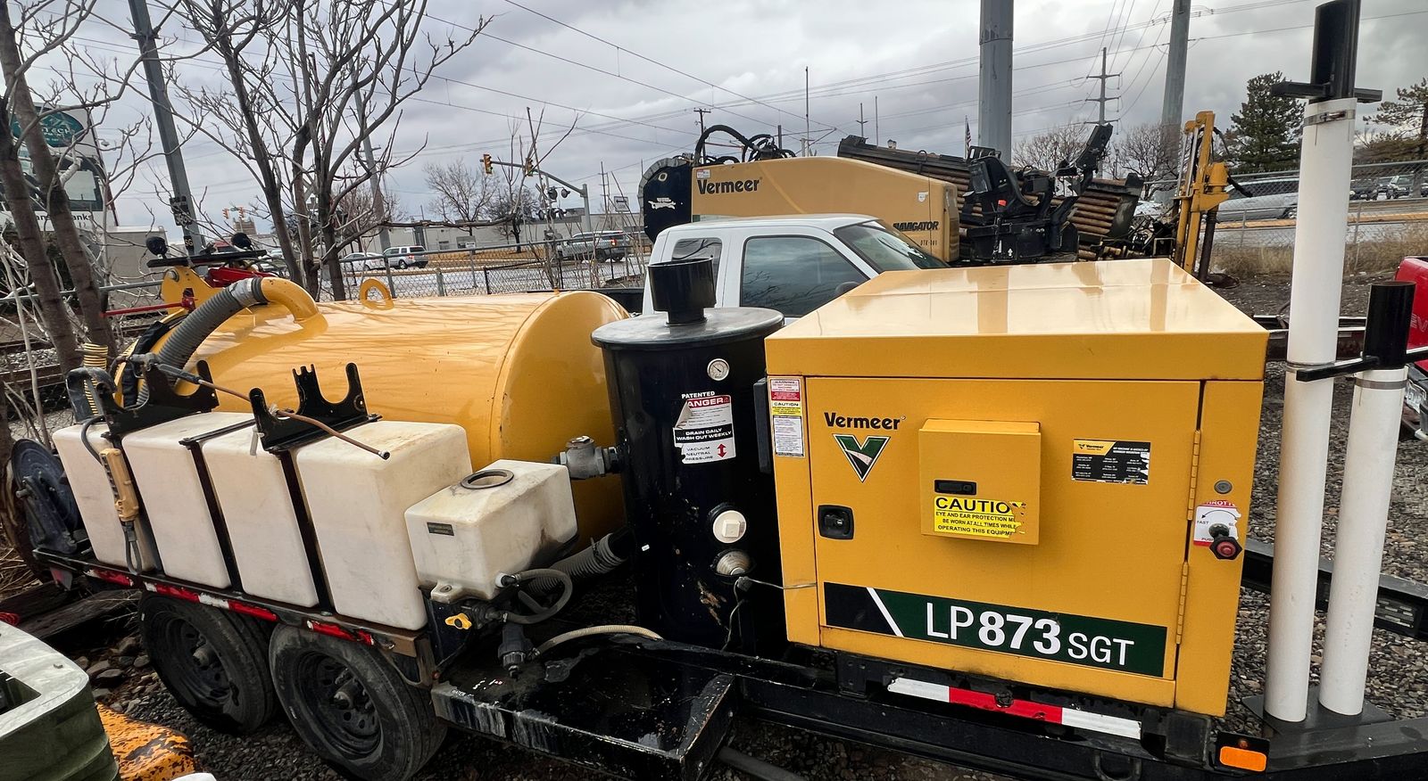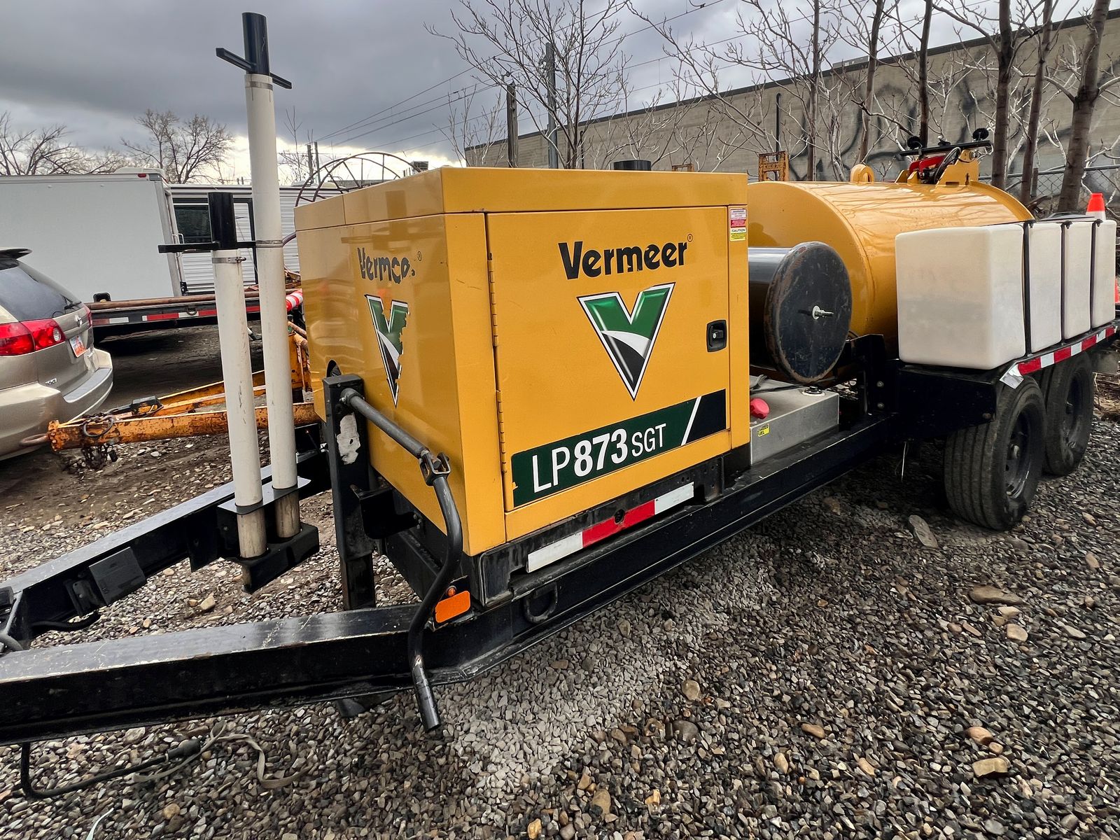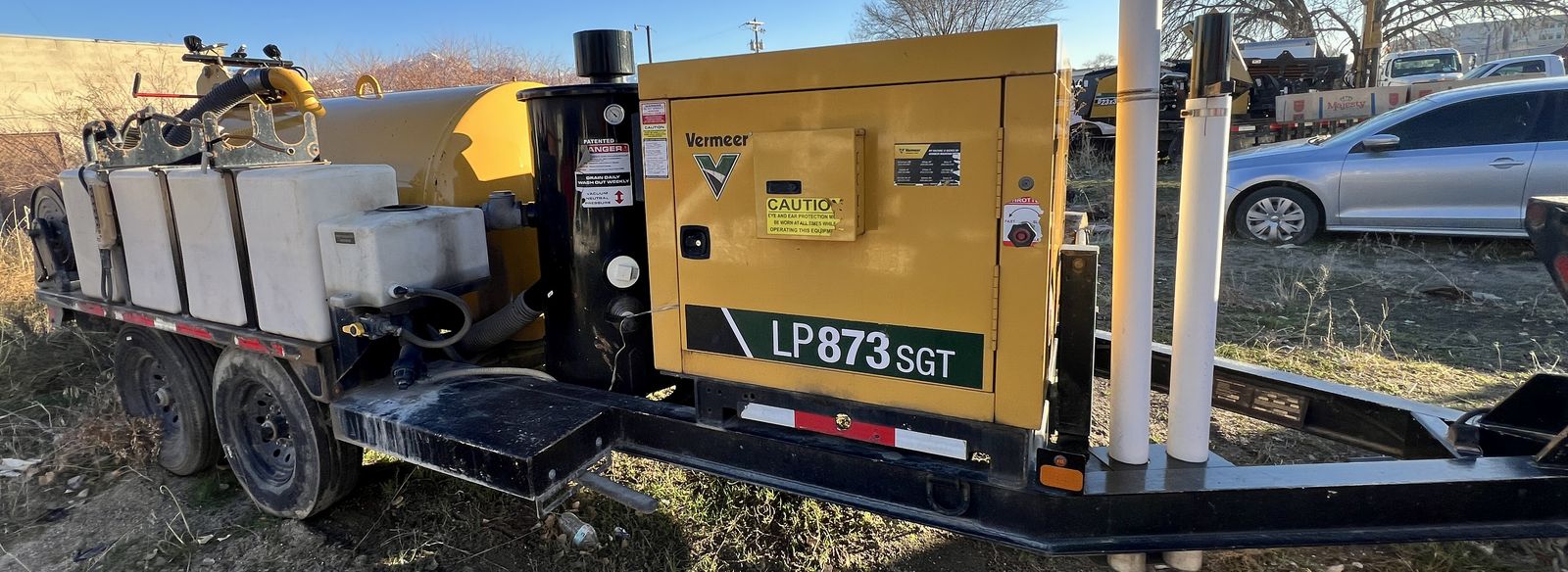 2023 Vermeer LP873SGT Vacuum Hydro Excavator, 1,430 hours, 38 HP EFI gas engine, 800-gallon spoils tank, 400-gallon water capacity, 1,000 CFM vacuum blower, factory Vermeer integrated dual-axle trailer, 14,000 lbs GVWR (7,000 lbs per axle), ST235/80R16 Load Range E tires, electric brakes on all hubs, remote control pendant, standard control panel with hour meter and fuel gauge, Cyclone Four-Way Valve Silencer (CVS) filtration system with 0.5 micron filtration, polymer liner in debris tank, hydraulic rear claw door, hose reel with vacuum hose, PVC pipe storage tubes, LED lighting package, work lights, hand-built in USA by Vermeer MV Solutions, complete ready-to-work package, well-maintained, good cosmetic condition.