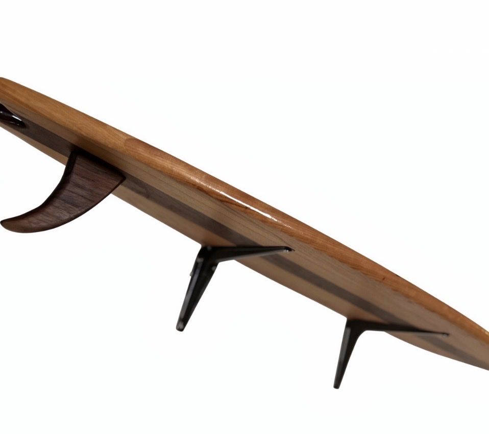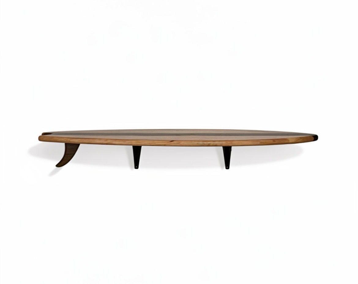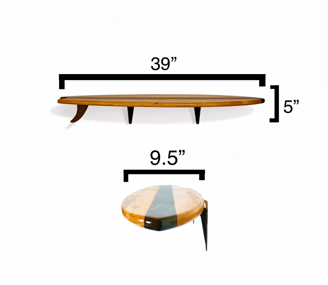 Made from real hardwood and finished with a smooth epoxy resin top, the shelf has a deep gloss shine that enhances the natural wood grain while adding durability. The surfboard shape creates a unique, artistic look that stands out from traditional shelving.