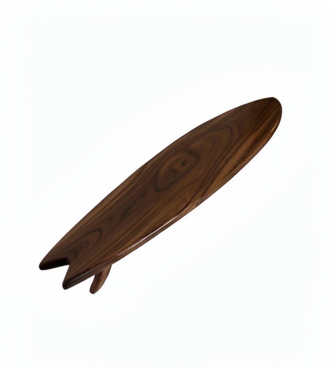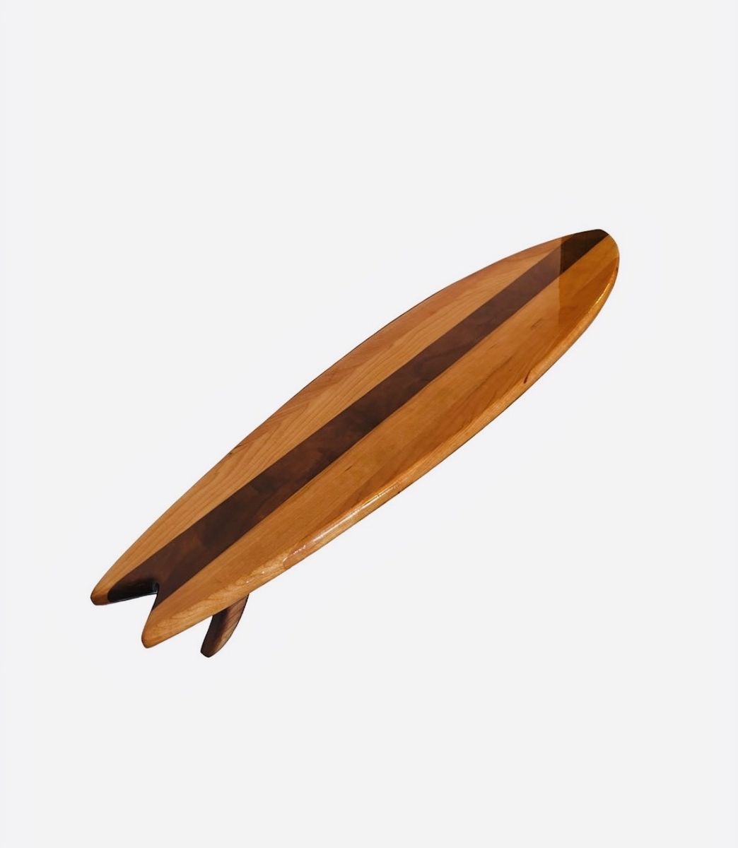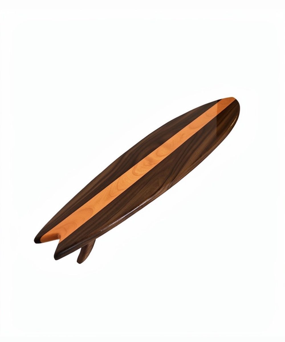 Made from real hardwood and finished with a smooth epoxy resin top, the shelf has a deep gloss shine that enhances the natural wood grain while adding durability. The surfboard shape creates a unique, artistic look that stands out from traditional shelving.