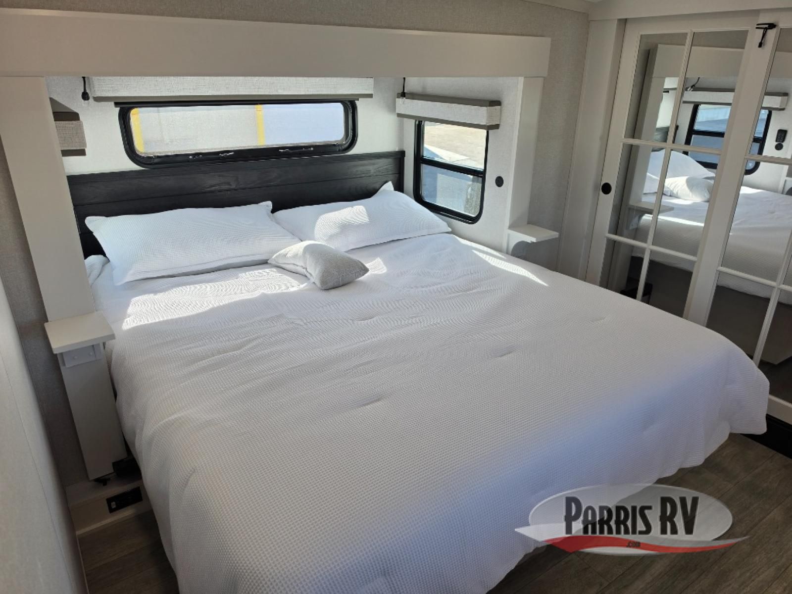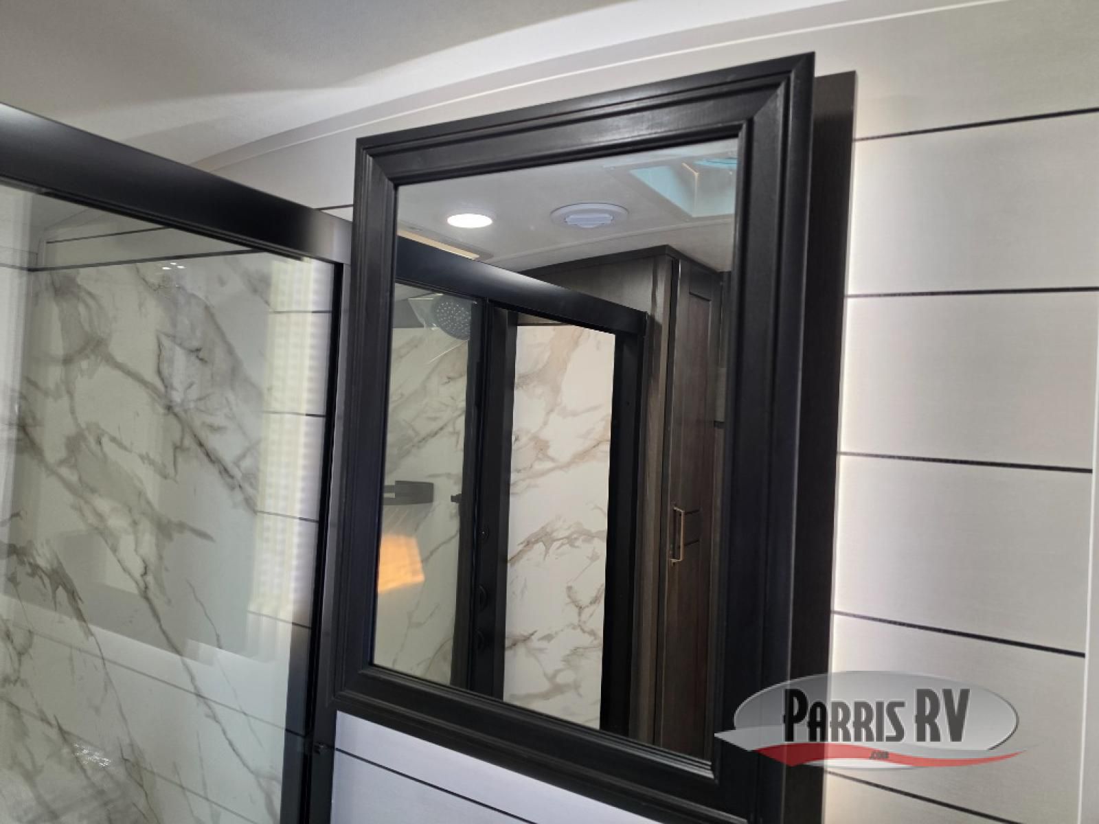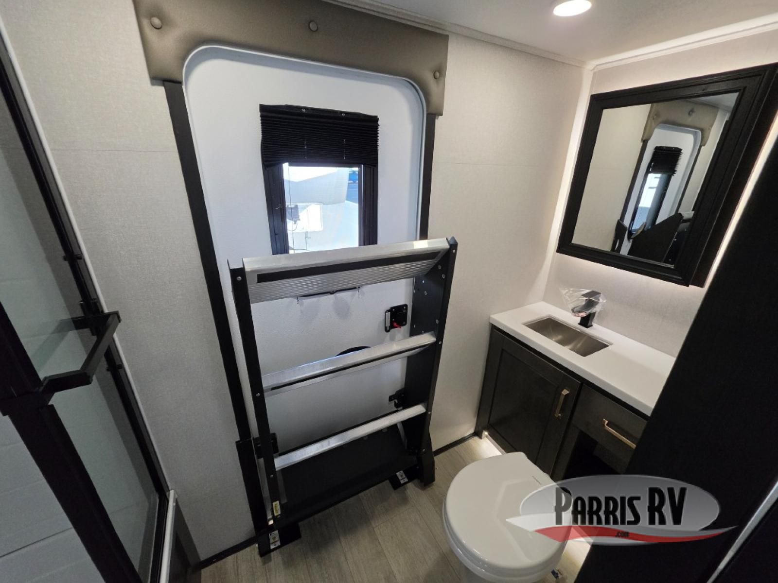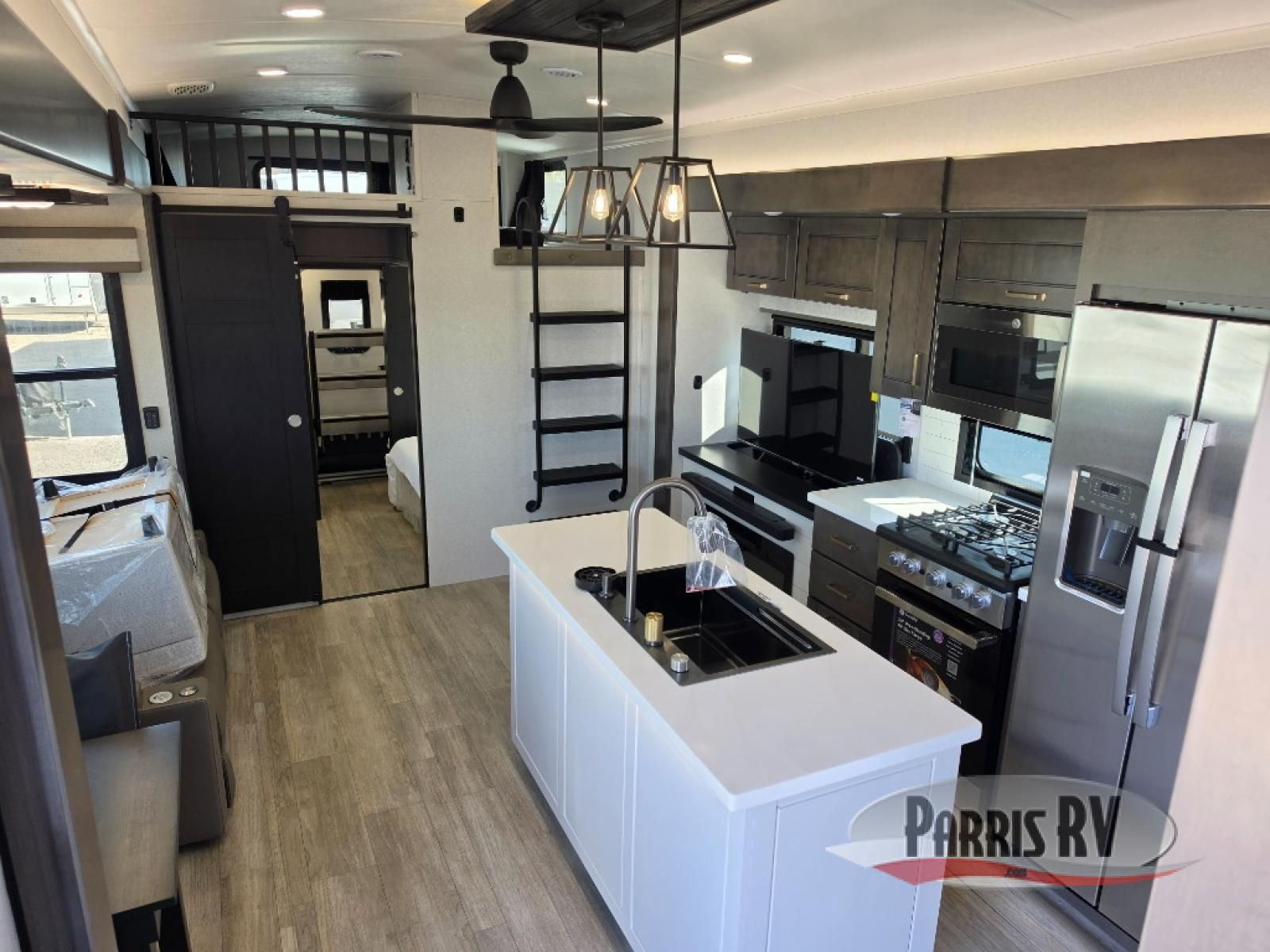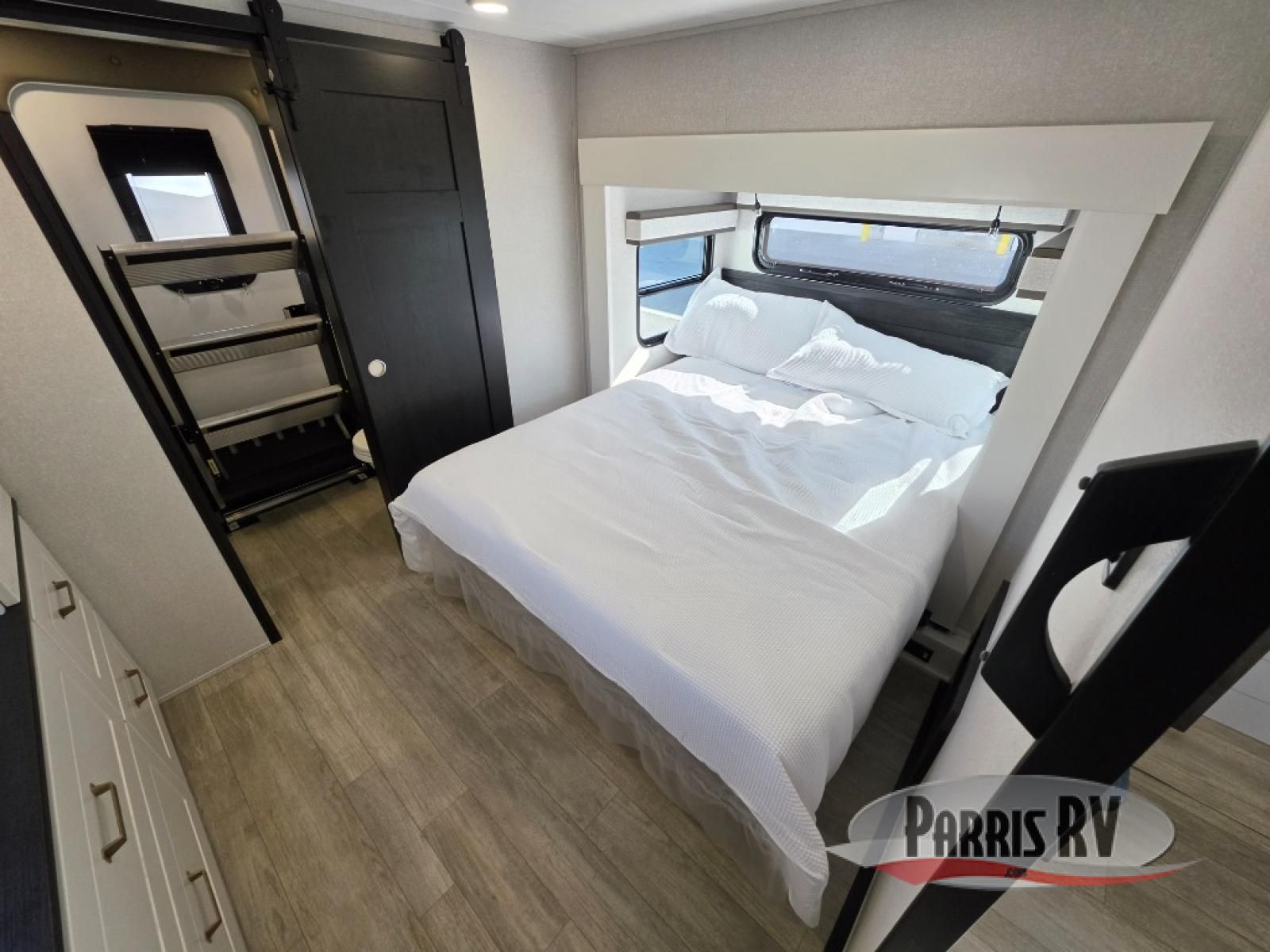 At the front of the 40DB fifth wheel, you'll find the inviting front bedroom featuring a spacious 72" x 80" king bed, perfect for a restful night's sleep. This room also includes a wardrobe and a flip-up dresser with a TV above, providing plenty of storage for clothing and essentials. Moving down the hall, one of two full bathrooms offers a 36" x 48" shower with a built-in seat for added accessibility, along with linen shelves for extra storage. At the center of the trailer, the main living area opens up with dual opposing slides for maximum comfort and room to move. One slide houses a 21-cu. ft. residential refrigerator and a 30" space-saving convection microwave with a built-in air fryer, while the central kitchen island includes a sink and pull-out cutting board, everything you need to prepare meals on the go. Across the way, the opposite slide features a roll-out table and theater seating, creating the perfect space to dine and relax after a long day. At the rear, the second bedroom includes a 60" x 80" queen bed in a slide-out with two wardrobes opposite for ample storage, plus a private full bathroom complete with a tub/shower combo and its own exterior exit for added convenience. Above it all, the loft provides three 30" x 80" bed mats and a loft cabinet, offering extra-sleeping space or additional storage for the whole family's adventures.